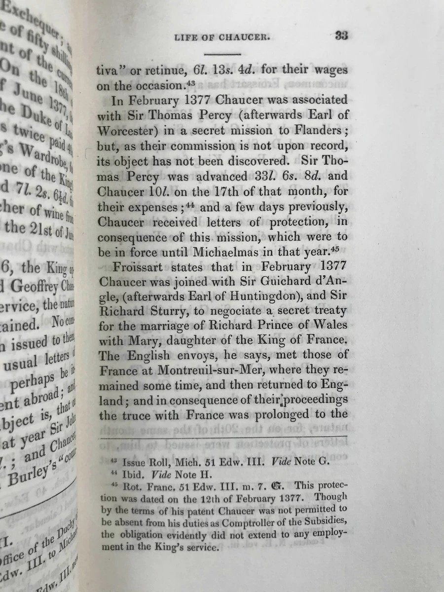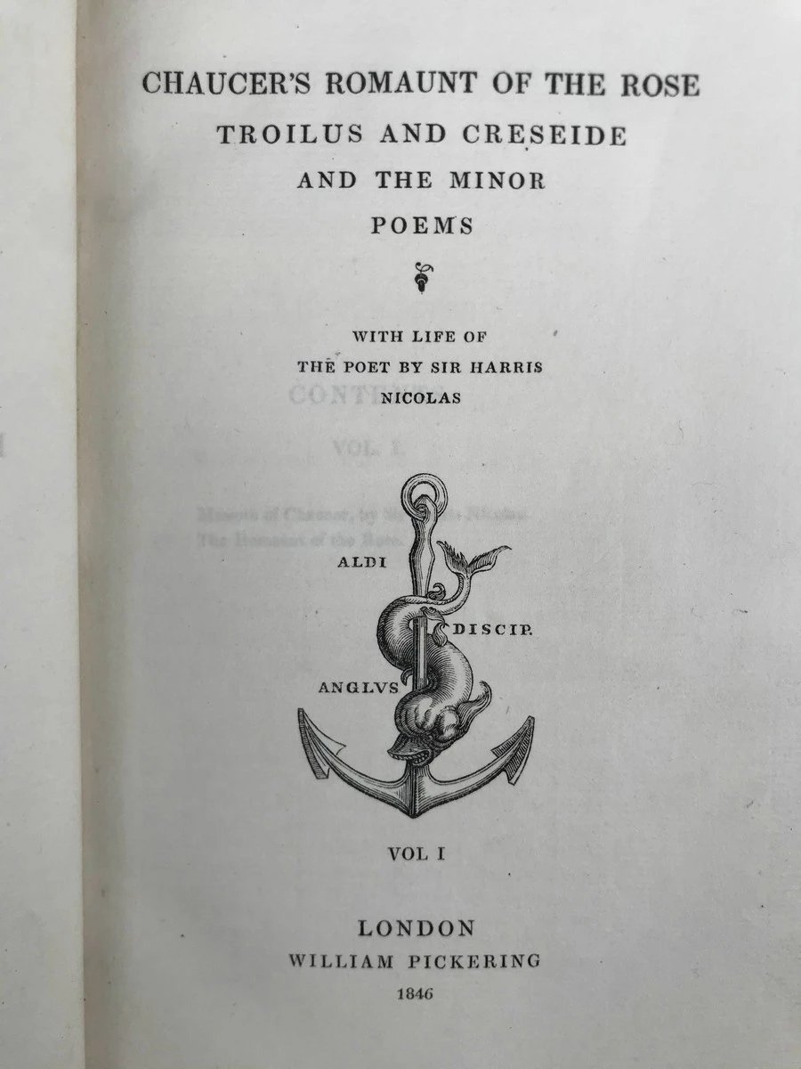 1822年的乔叟作品集是根据古典学家 Sir Thomas Tyrwhitt(1730-1785)在1775-1778年间出版的版本而来,他是乔叟诗歌真实面貌的真正恢复者,皮克林对这一开创性版本进行了再版,著名藏书家Geoffrey Keynes 认为这是皮克林第一部有特色的出版物。此时皮克林尚未采用后来成为其标识的阿尔丁锚和海豚的图标,1846年出版的三卷作品书名页是可以看到的。
