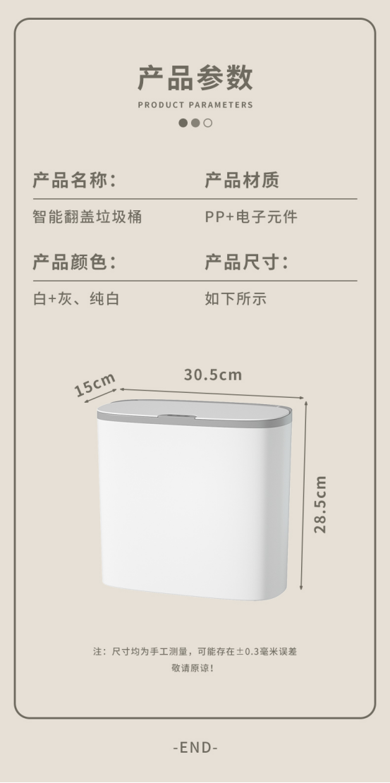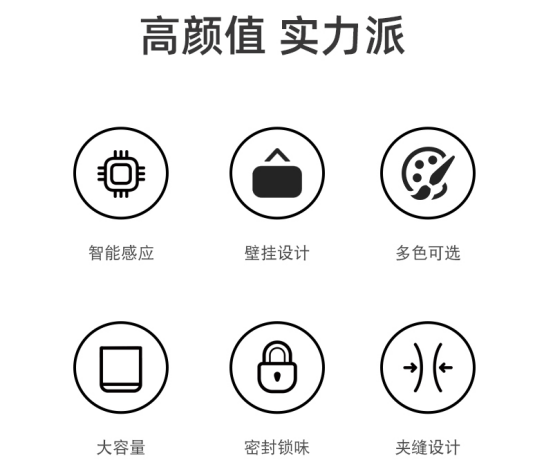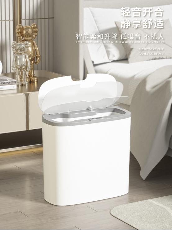 智能家居新体验,从智能垃圾桶开始 外观不仅简约大气,就连性能也非常地好 挥手即可开启,0.3s急速开盖,膝盖感应 5s自动合盖,让你远离脏污,生活更便捷