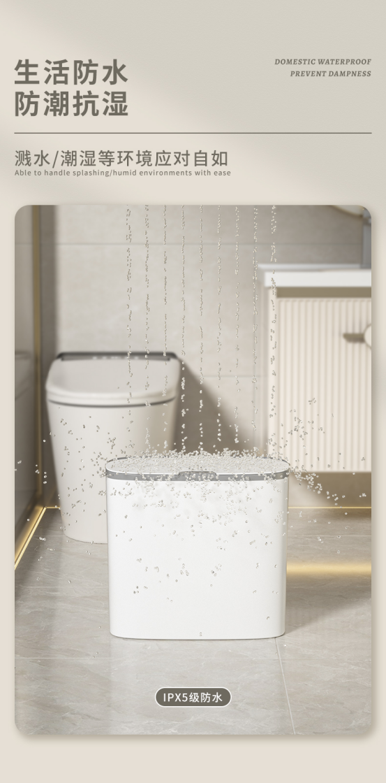 防尘盖设计,防潮防异味 IPX5级生活防水,可防异味 防尘盖设计也加强了密封性能 液体还是异味,统统进不去 蚊虫不光顾,远离残渣异味
