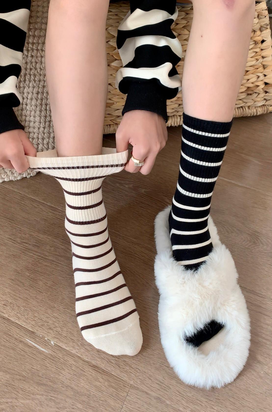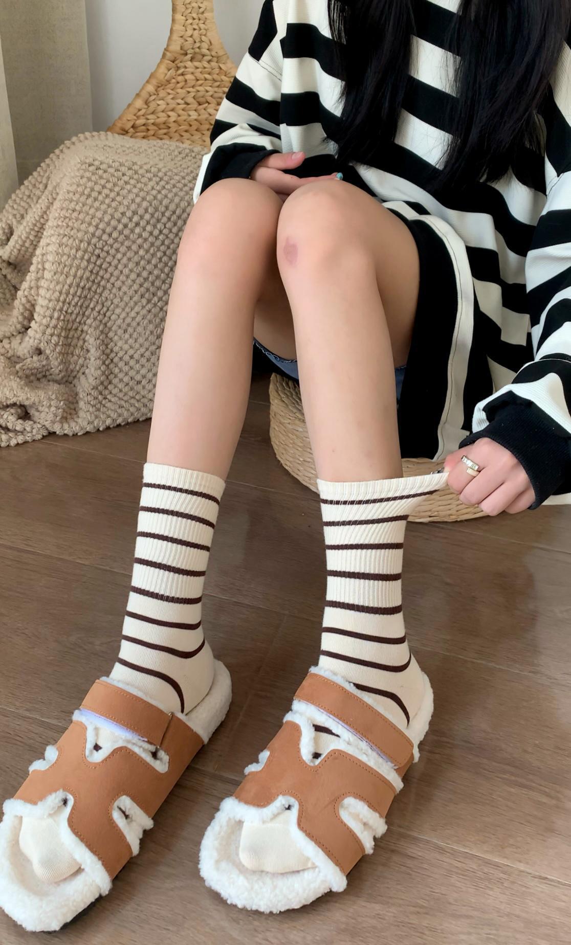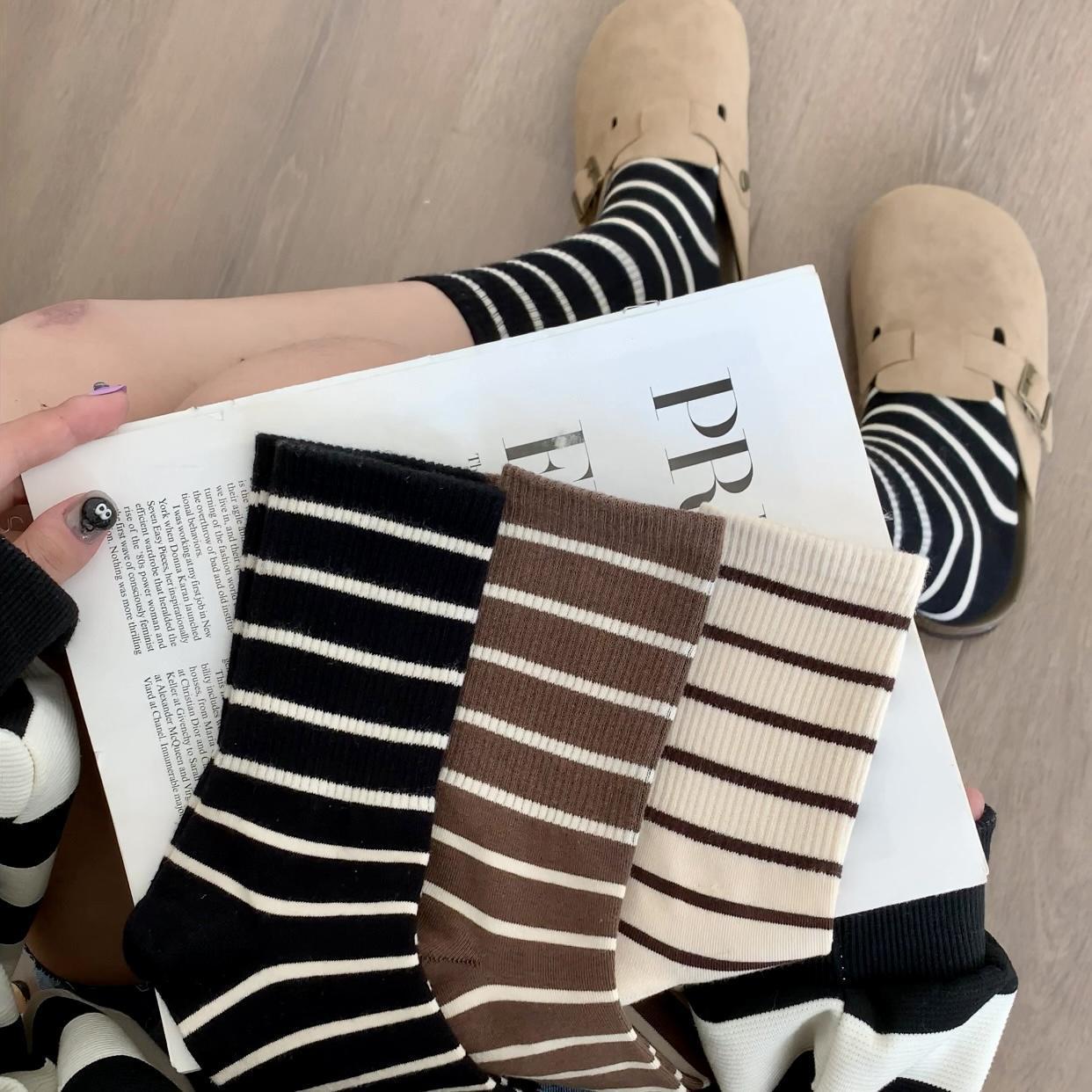 超值5双【保暖亲肤❗️透气吸汗】袜子女条纹简约高筒袜外穿中长款ins潮百搭款黑白秋冬学院风女袜。ja