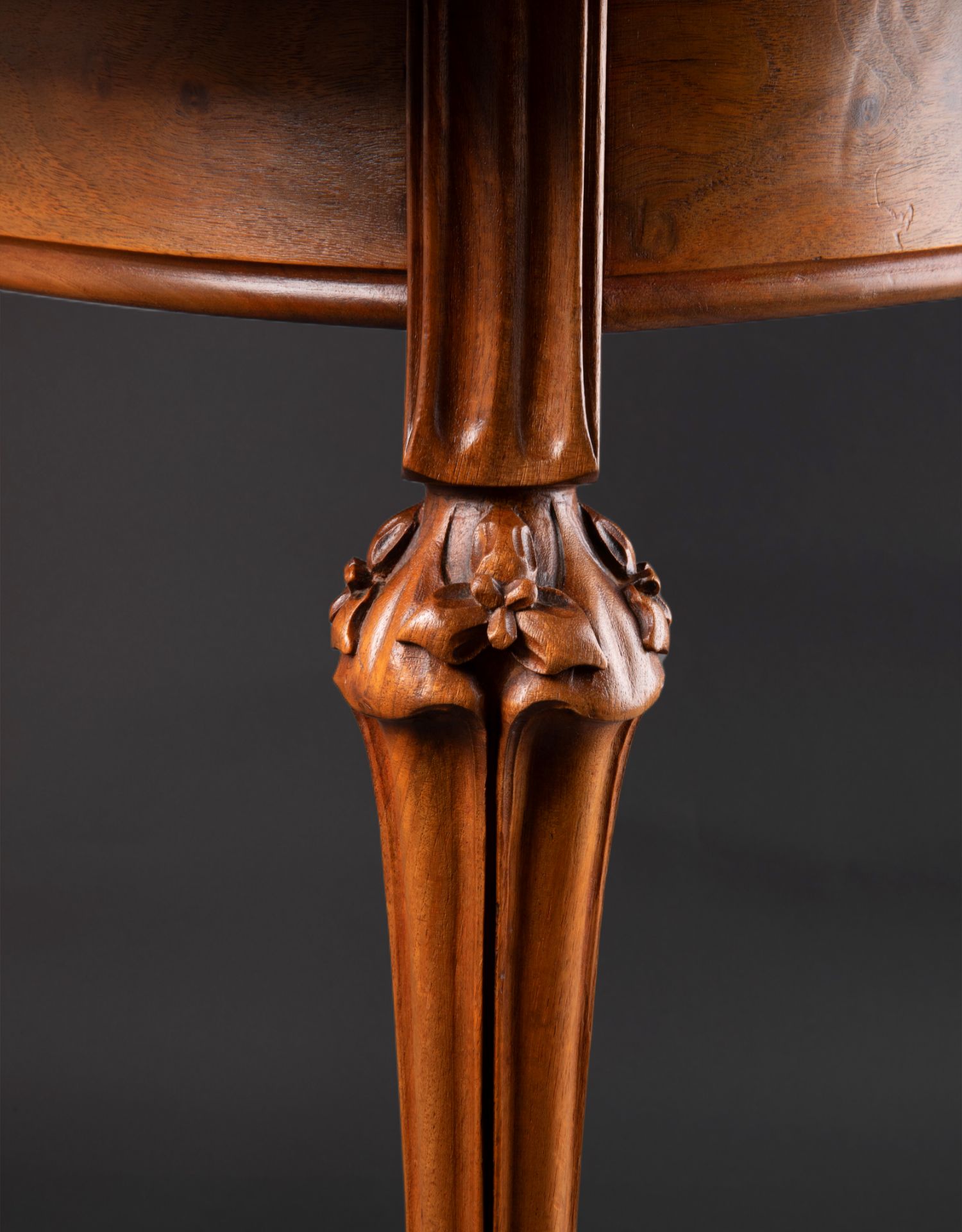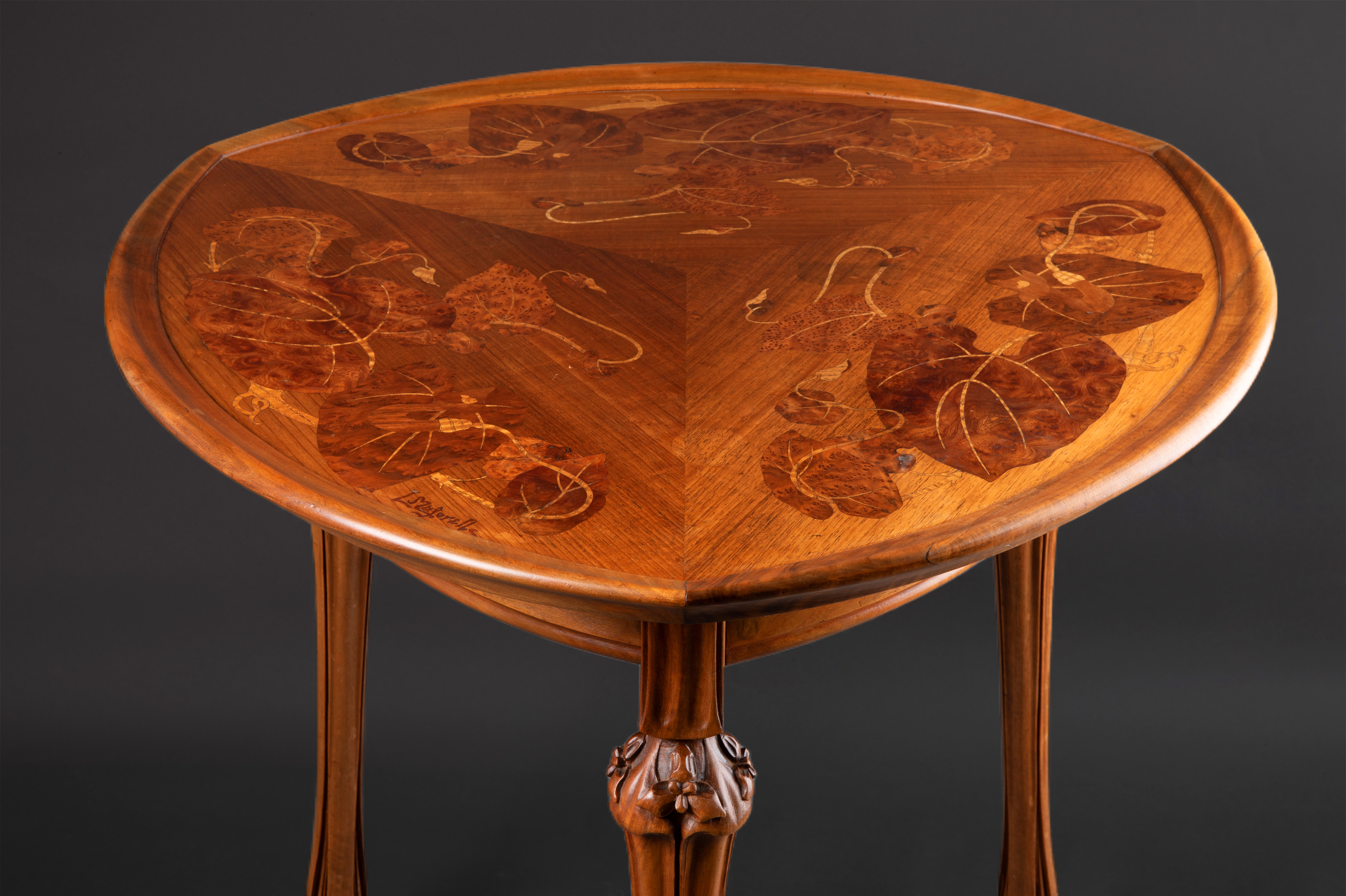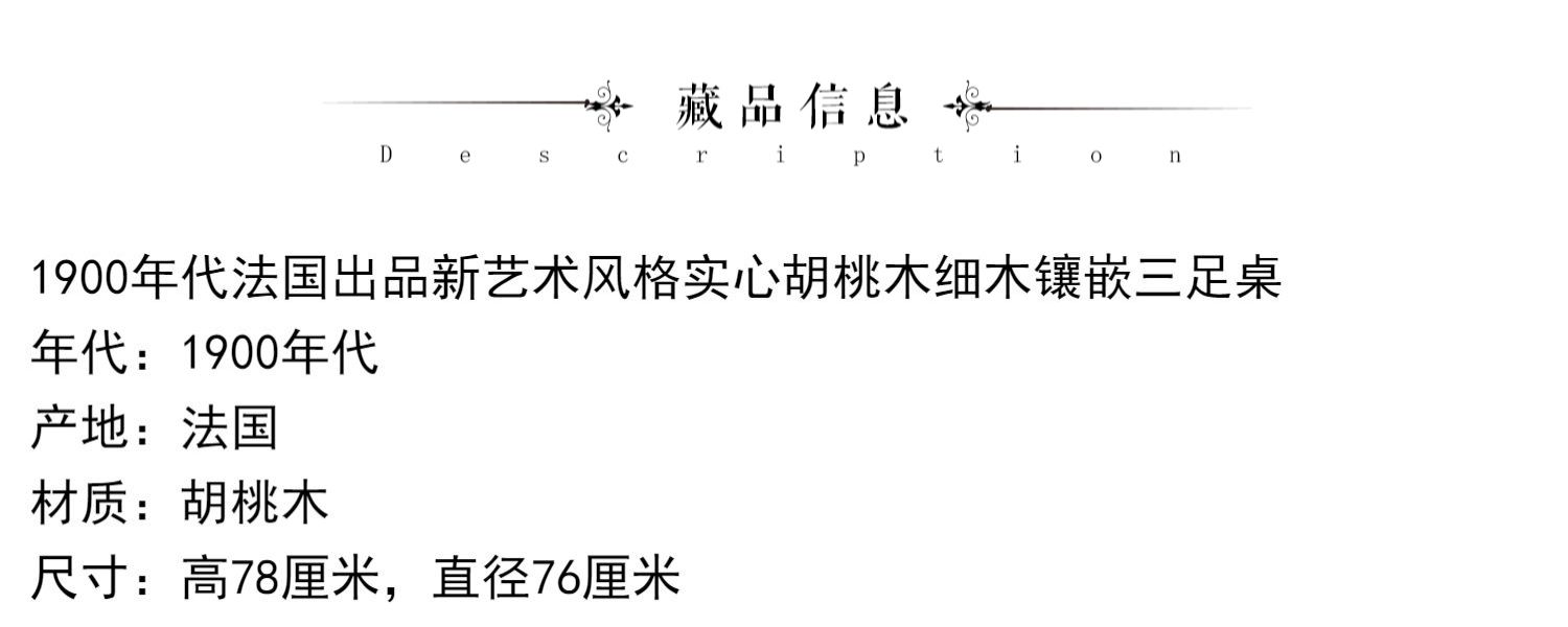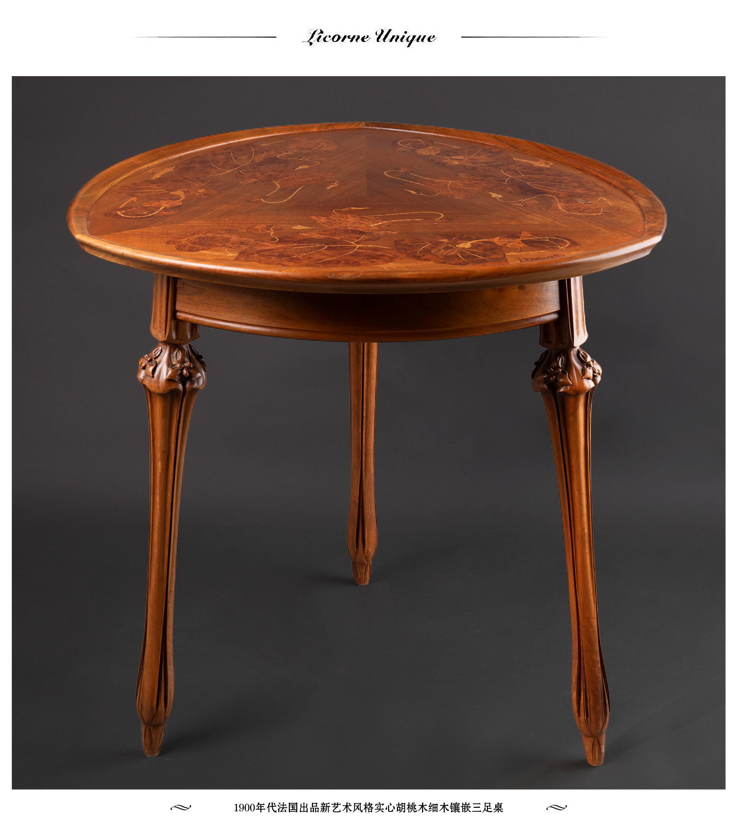 独角鹿西洋古董家具法国出品新艺术风格实心胡桃木细木镶嵌三足桌