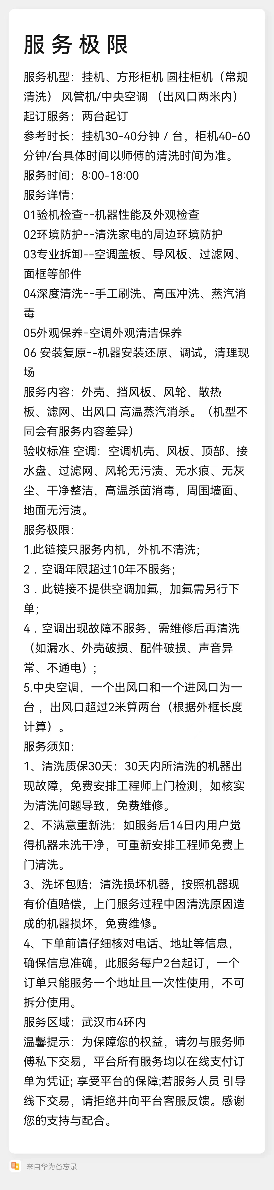 适用于挂机、方形柜机(圆柱柜机只清洗外观 过滤网高温蒸汽杀菌)、风管机/中央空调(出风口2米内)此服务不包含商用天花机