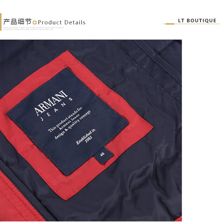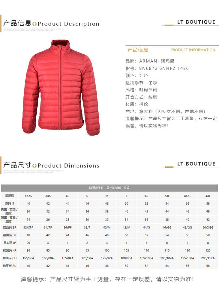 ARMANI JEANS 阿玛尼 男士红色羽绒服 红色 8N6B72 6NHPZ 1456