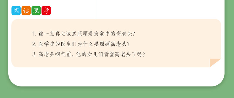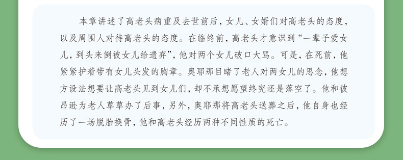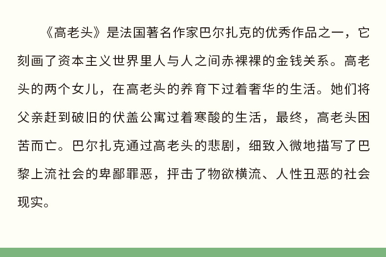 《高老头》是法国著名作家巴尔扎克的优秀作品之一,它刻画了资本主义世界里人与人之间赤裸裸的金钱关系。高老头的两个女儿,在高老头的养育下过着奢华的生活。她们将父亲赶到破旧的伏盖公寓过着寒酸的生活,最终,高老头困苦而亡。巴尔扎克通过高老头的悲剧,细致入微地描写了巴黎上流社会的卑鄙罪恶,抨击了物欲横流、人性丑恶的社会现实。