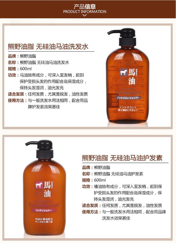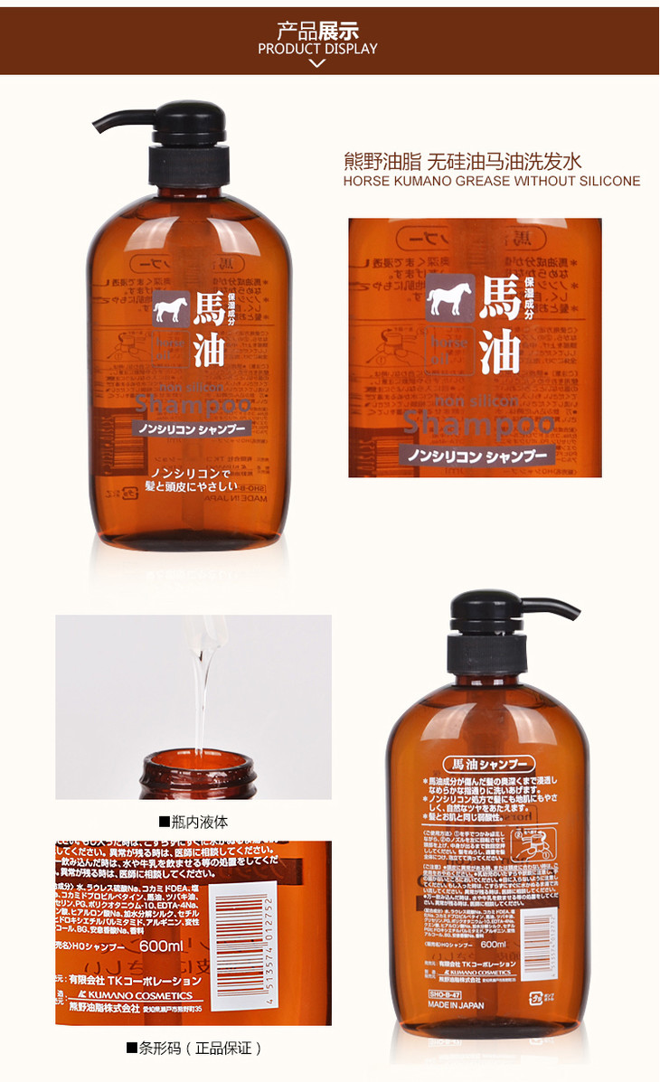 【香港直邮】日本 熊野油脂 无硅弱酸性马油洗发水无硅油洗发护发 洗发水 沐浴露 600ml