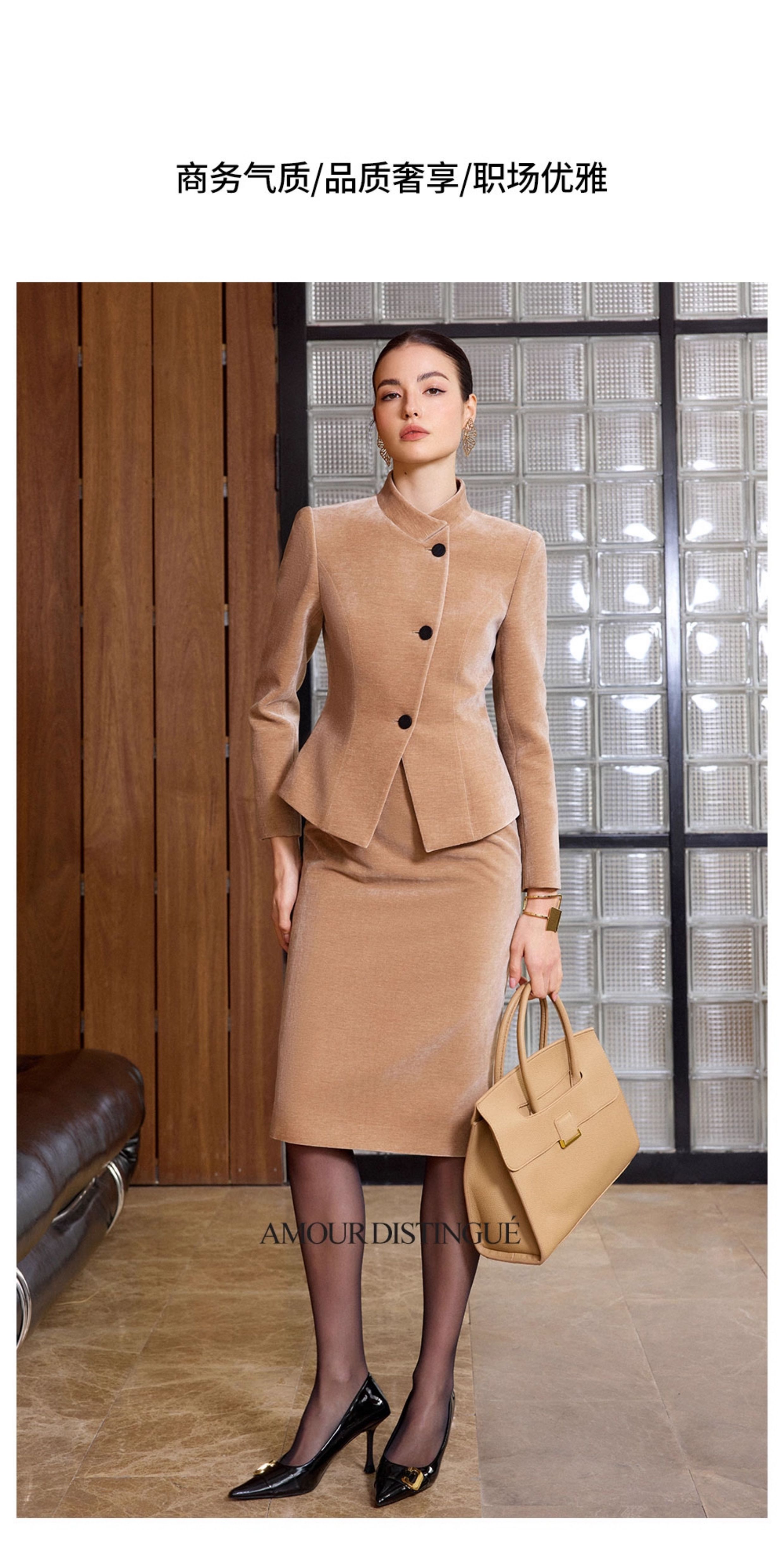 IWY/新款西装外套女气质名媛高级感卡其色雪尼尔职业装通勤两件套CS2580