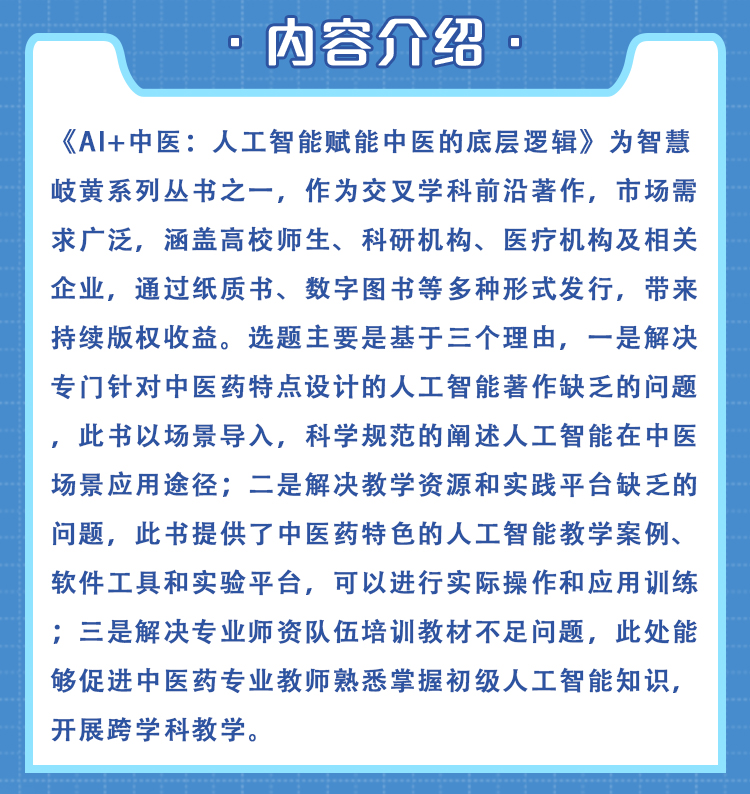 《AI+中医:人工智能赋能中医的底层逻辑》为智慧岐黄系列丛书之一,作为交叉学科前沿著作,市场需求广泛,涵盖高校师生、科研机构、医疗机构及相关企业,通过纸质书、数字图书等多种形式发行,带来持续版权收益。选题主要是基于三个理由,一是解决专门针对中医药特点设计的人工智能著作缺乏的问题,此书以场景导入,科学规范的阐述人工智能在中医场景应用途径;二是解决教学资源和实践平台缺乏的问题,此书提供了中医药特色的人工智能教学案例、软件工具和实验平台,可以进行实际操作和应用训练;三是解决专业师资队伍培训教材不足问题,此处能够促进中医药专业教师熟悉掌握初级人工智能知识,开展跨学科教学。