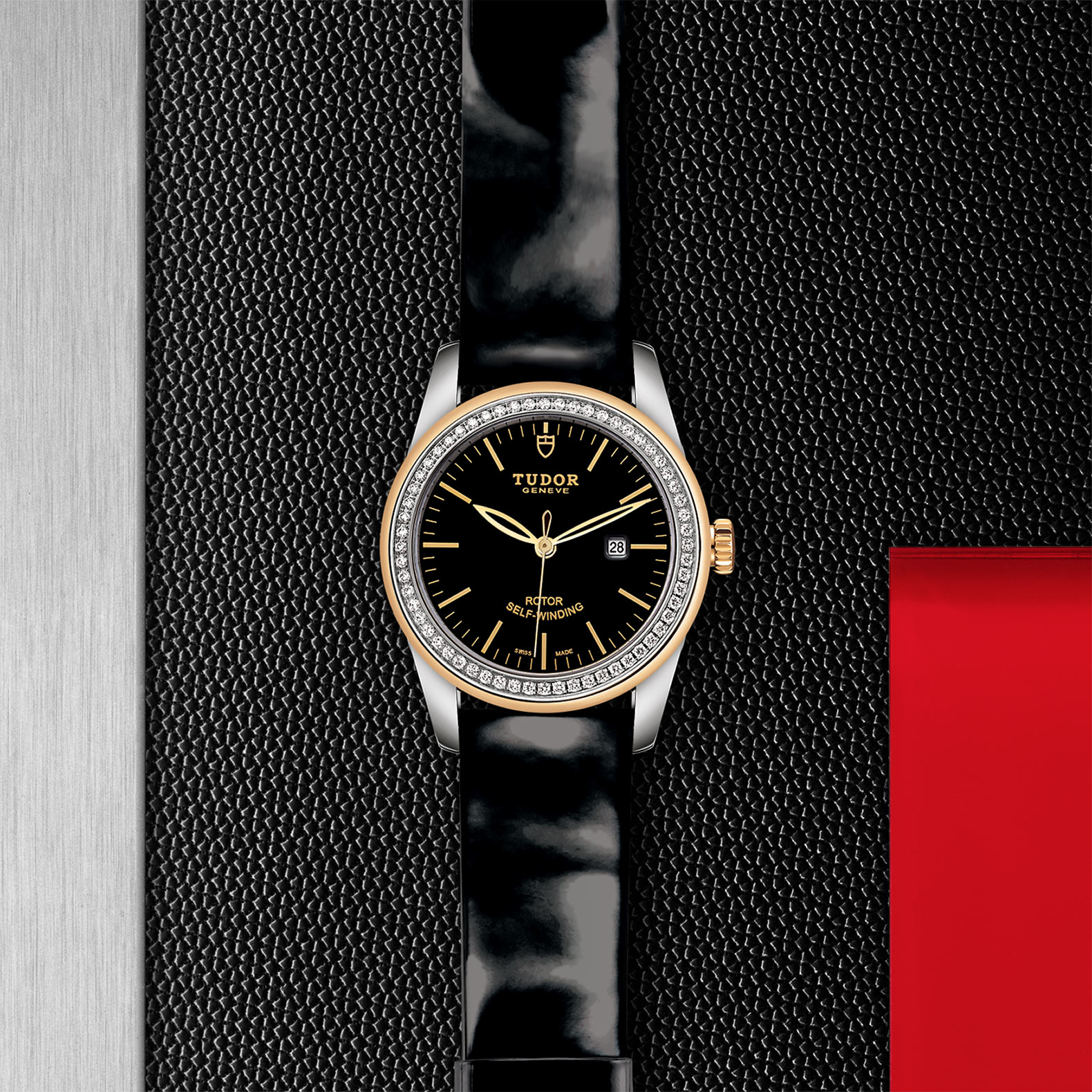 旋入式上链錶冠,饰以帝舵表标志;精钢覆有0.1毫米18K黄金薄层