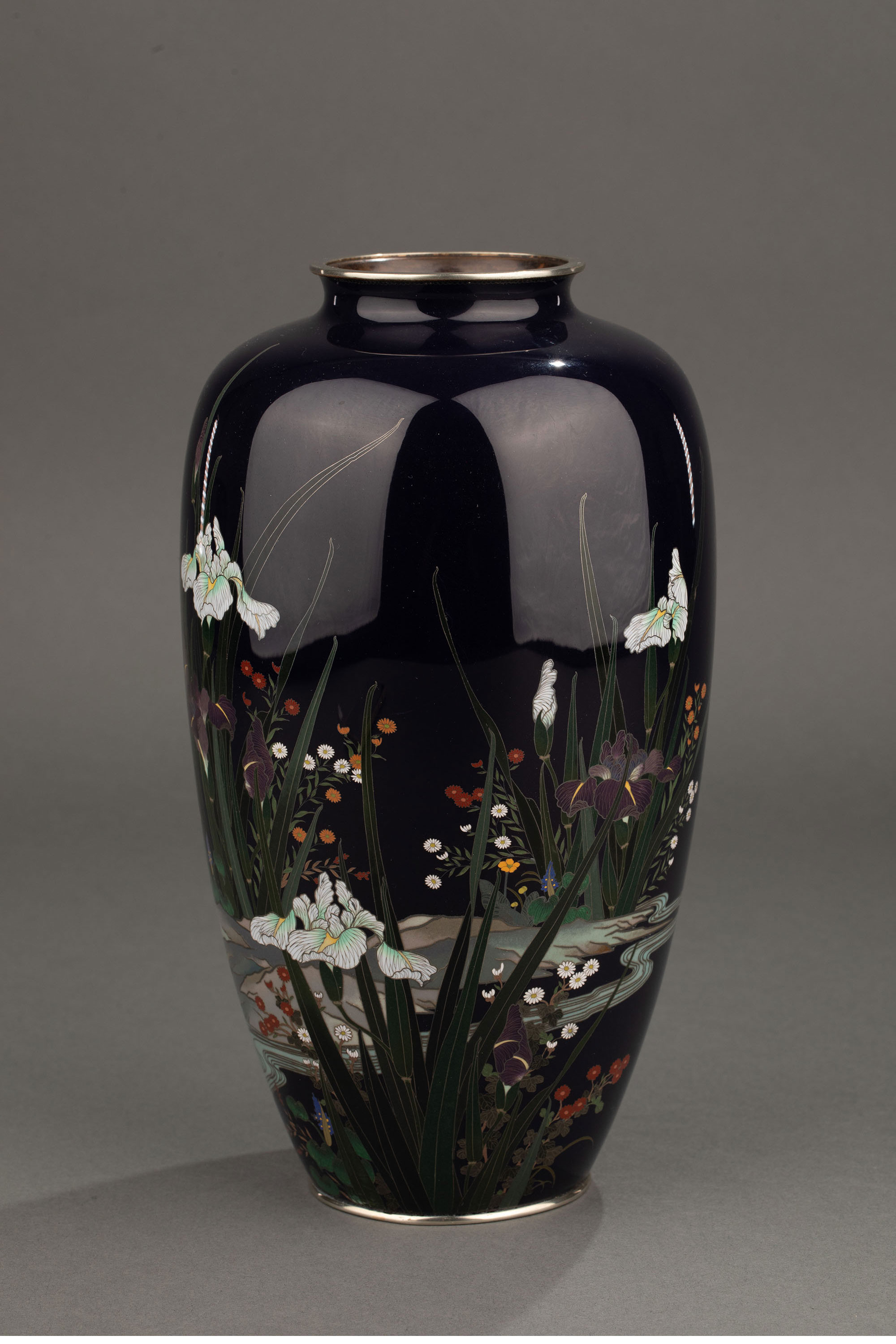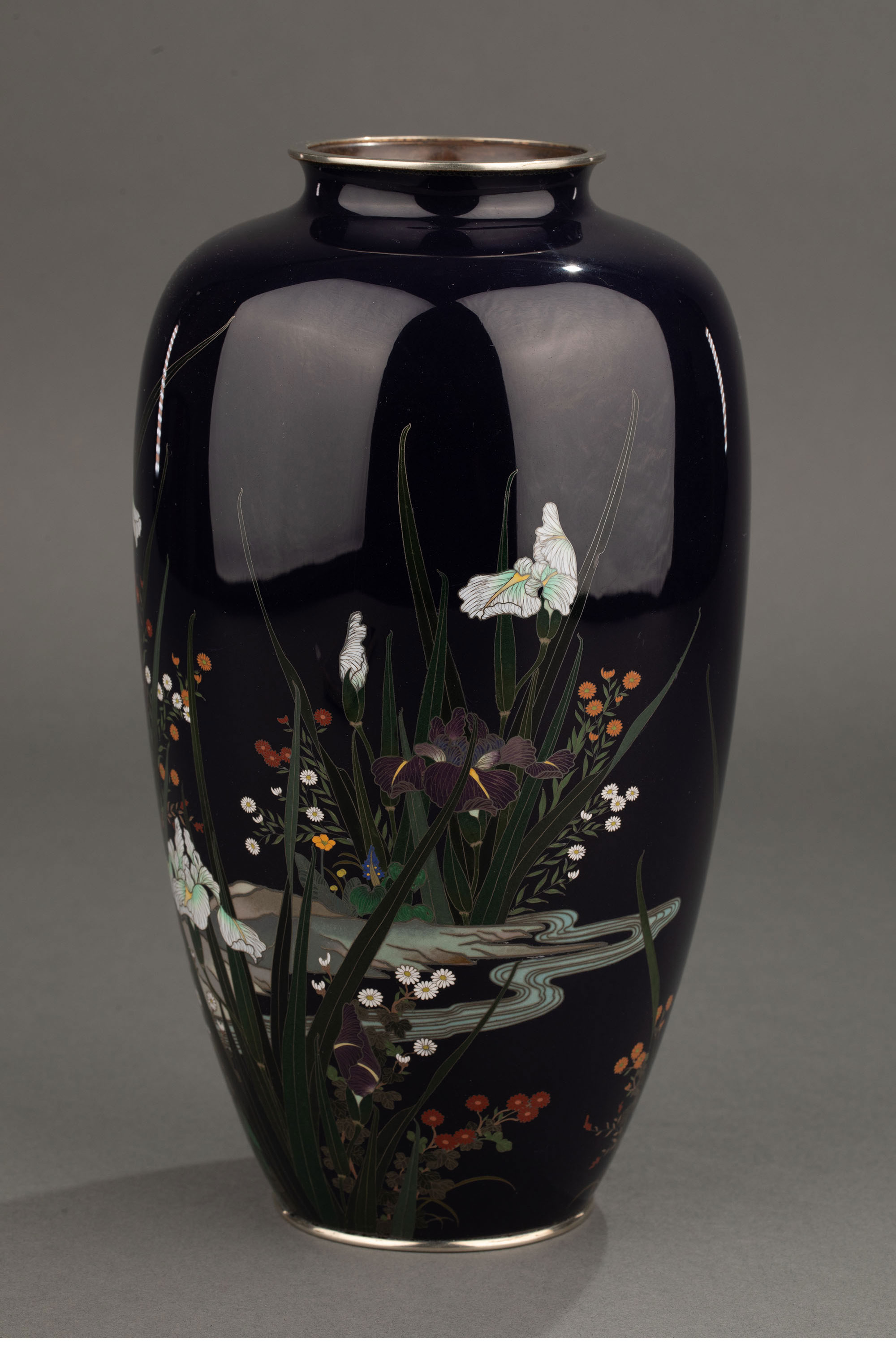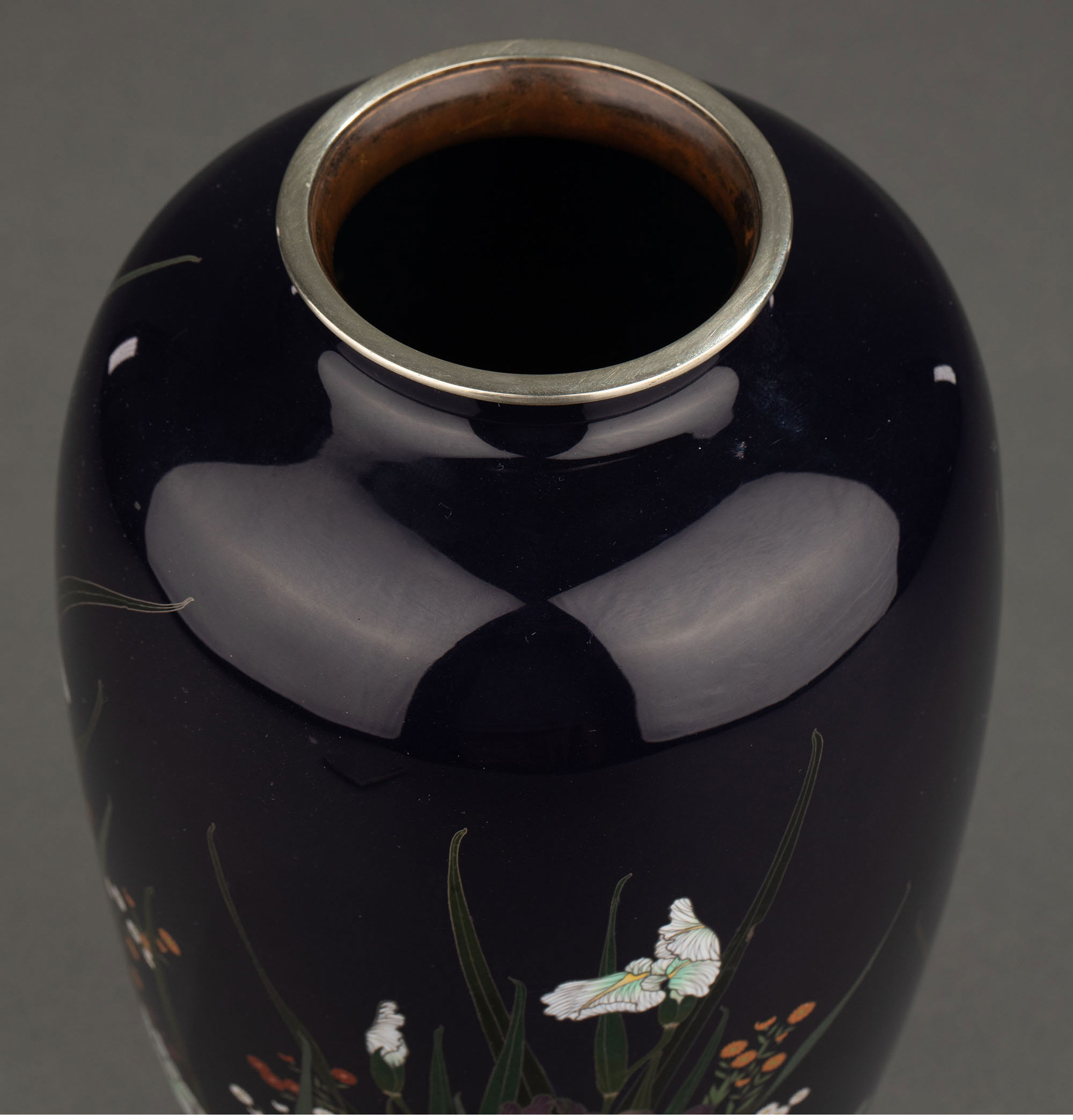 1910年代日本明治时期出品「鸢尾」主题银胎七宝烧花瓶