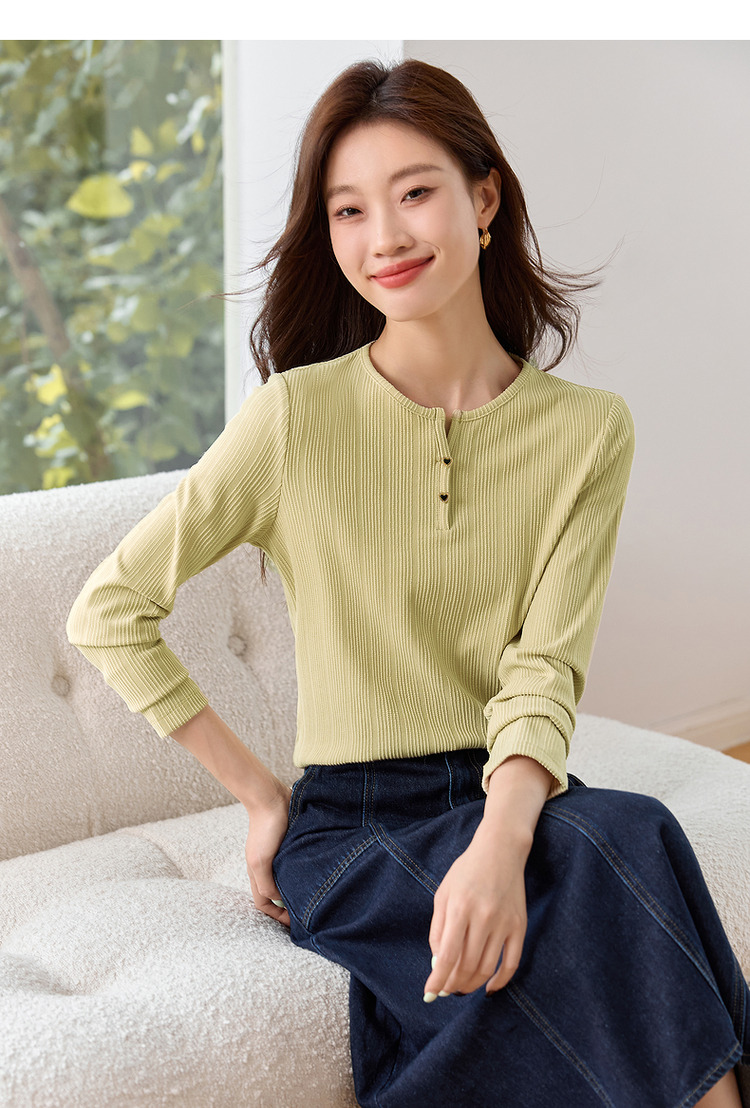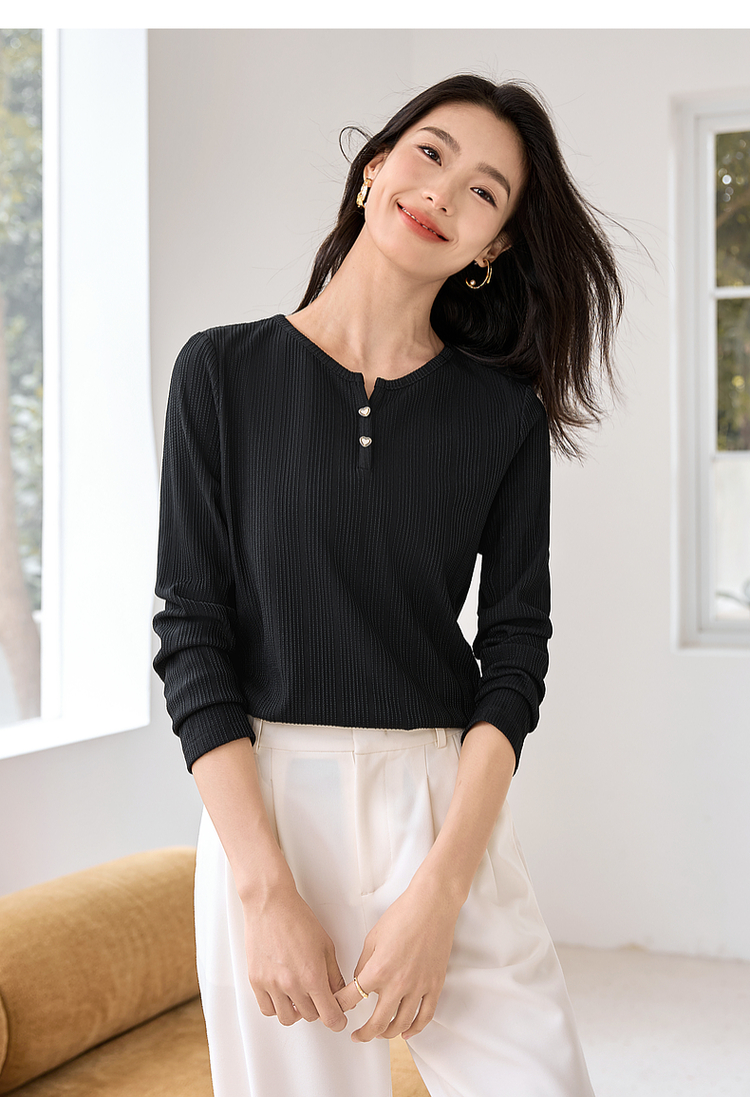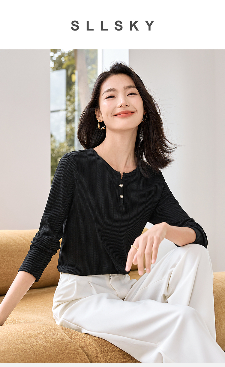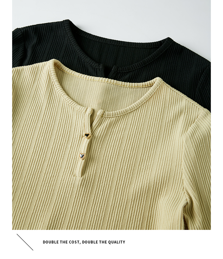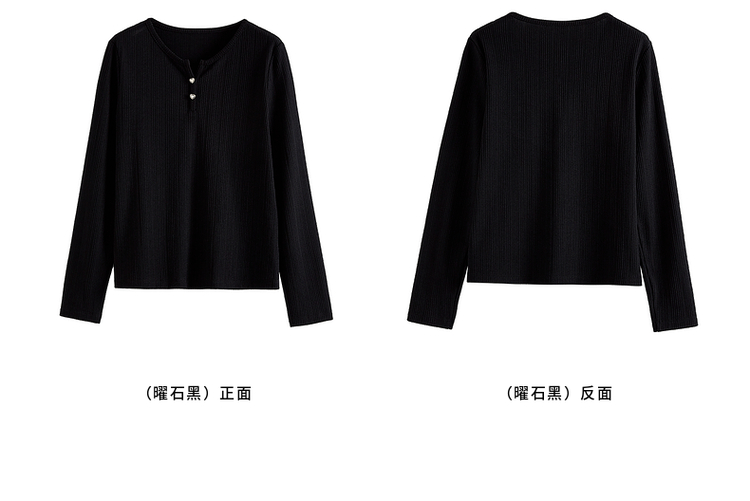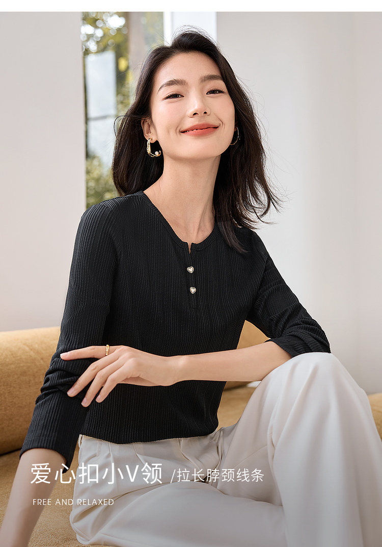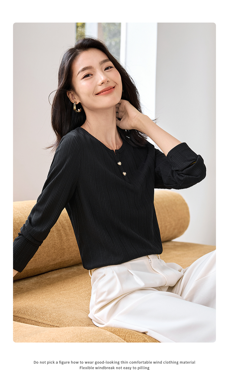 【专属特价】熙世界爱心纽扣肌理针织T恤长袖2025新款宽松圆领减龄打底上衣