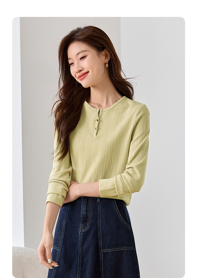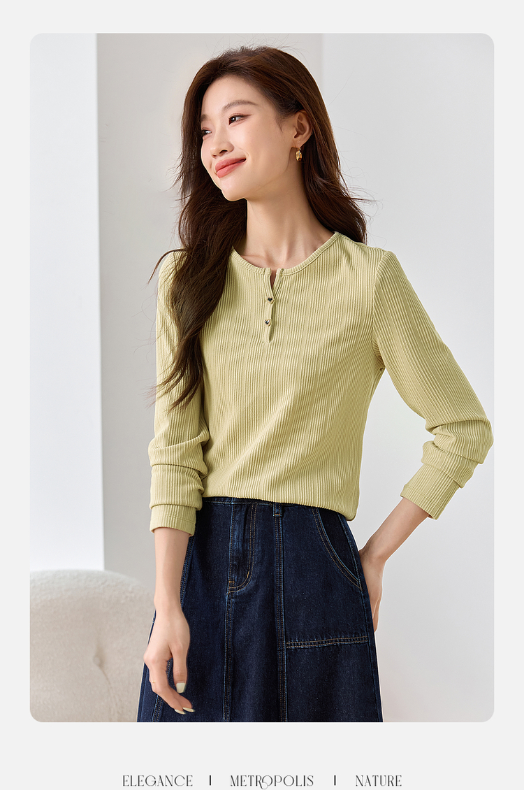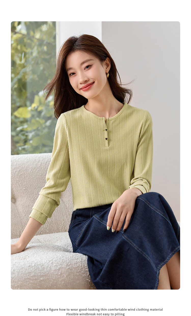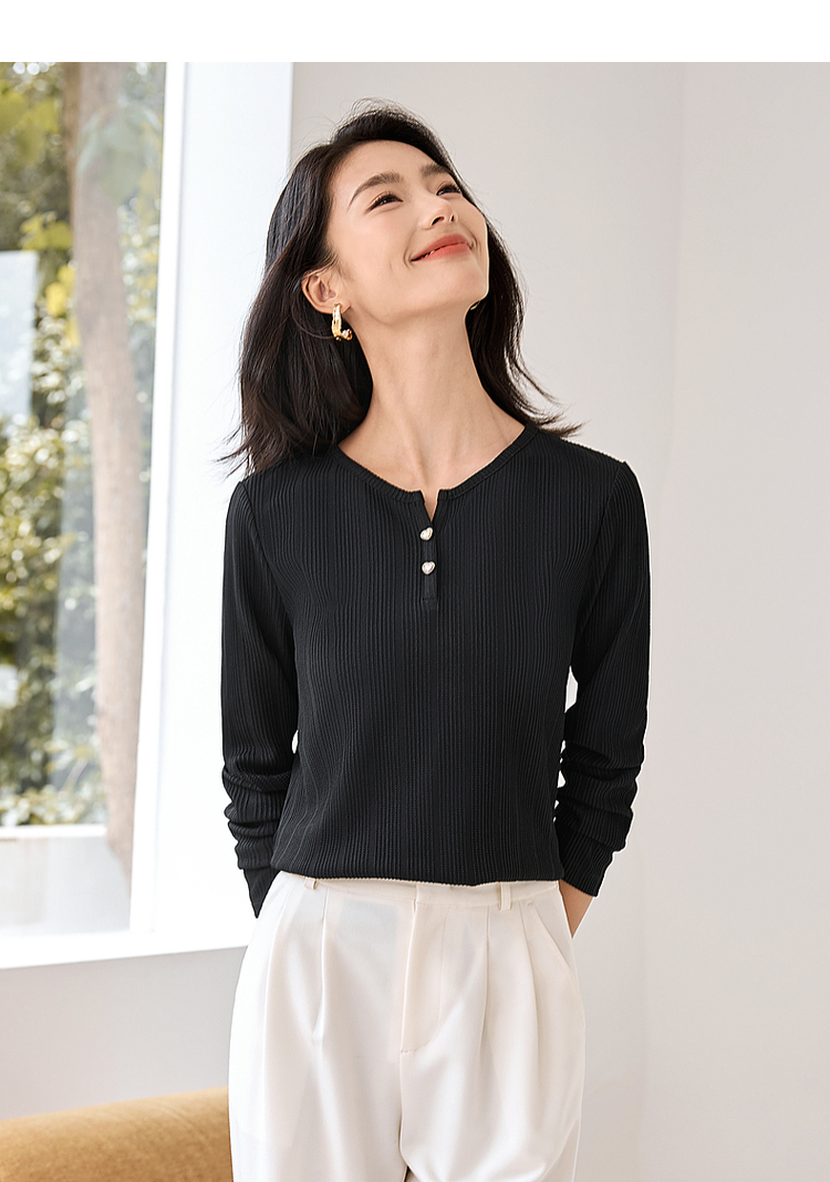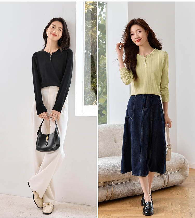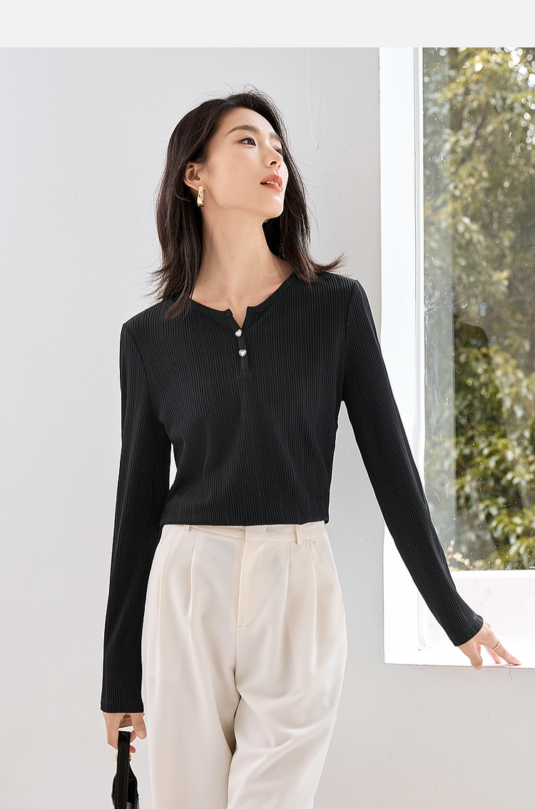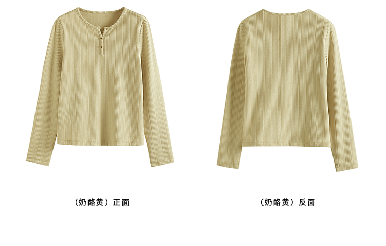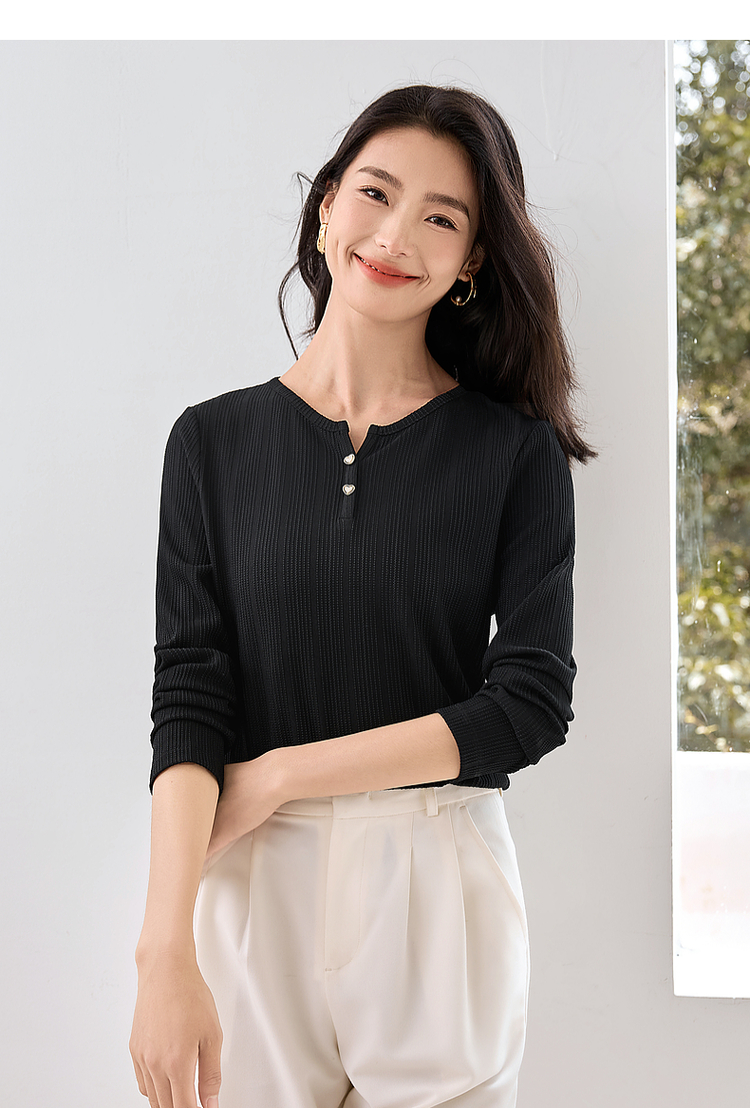 【专属特价】熙世界爱心纽扣肌理针织T恤长袖2025新款宽松圆领减龄打底上衣