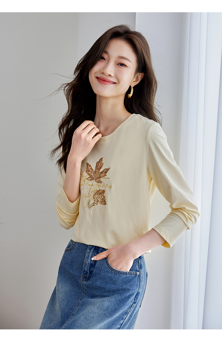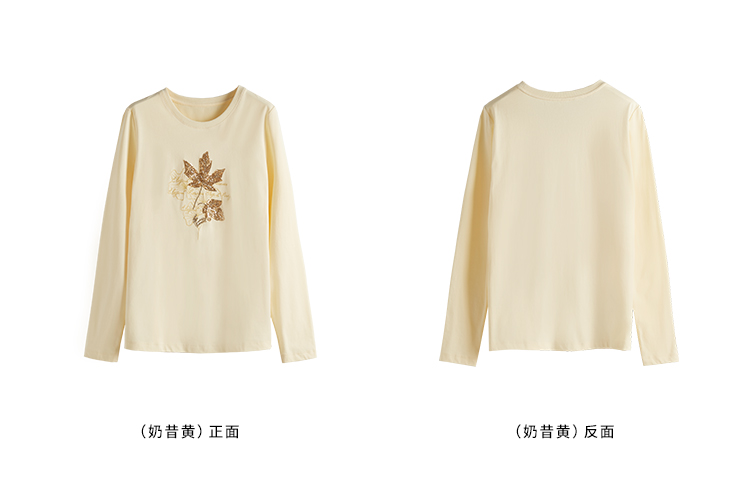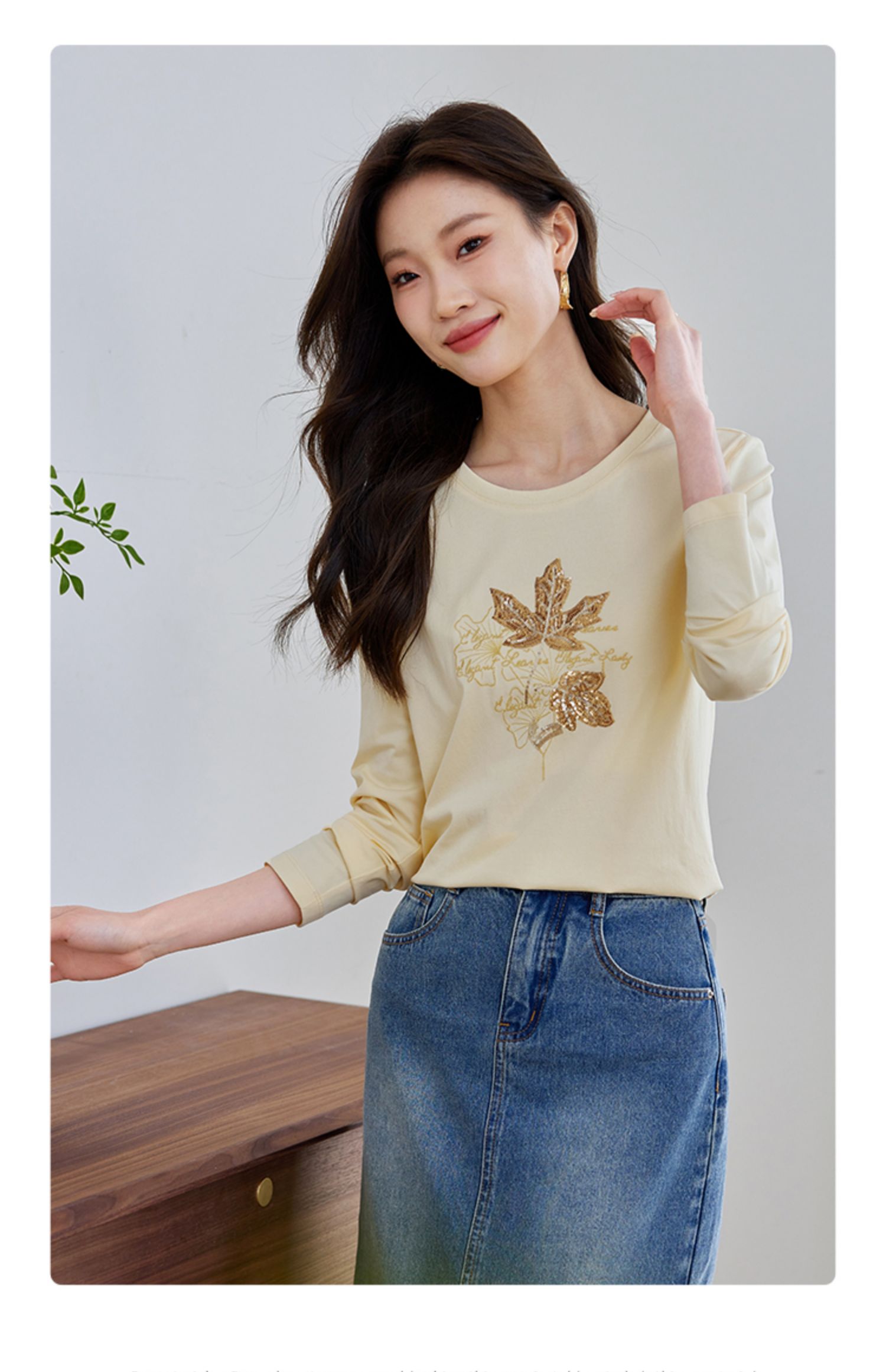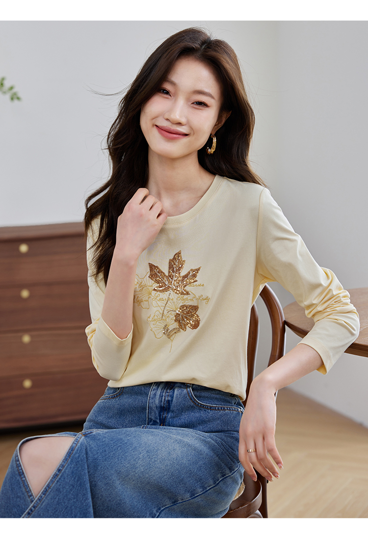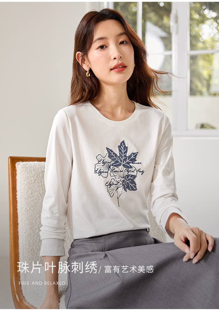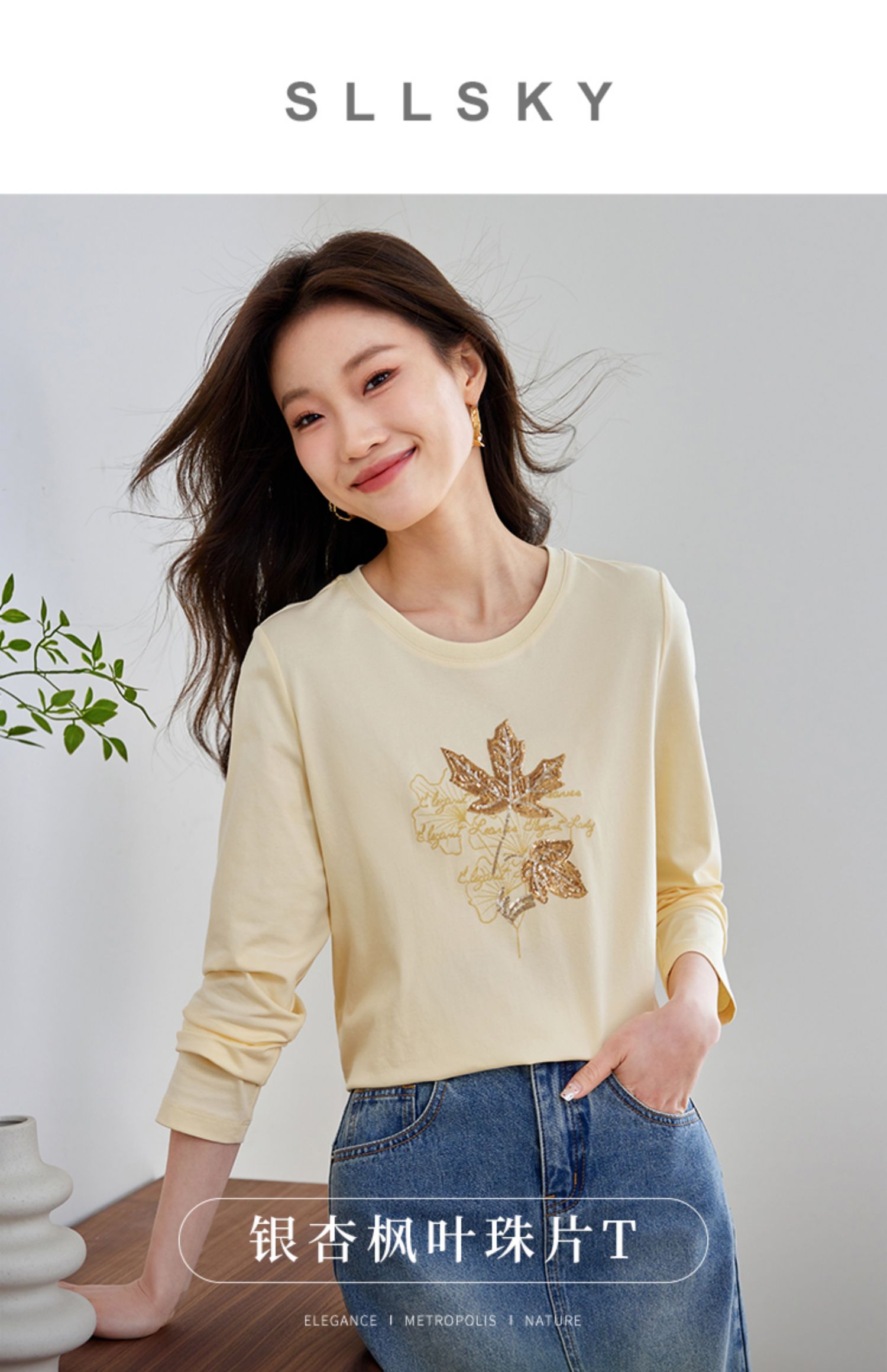 【五折购】熙世界艺术感枫叶珠片T恤长袖2025秋新款宽松显瘦休闲圆领上衣