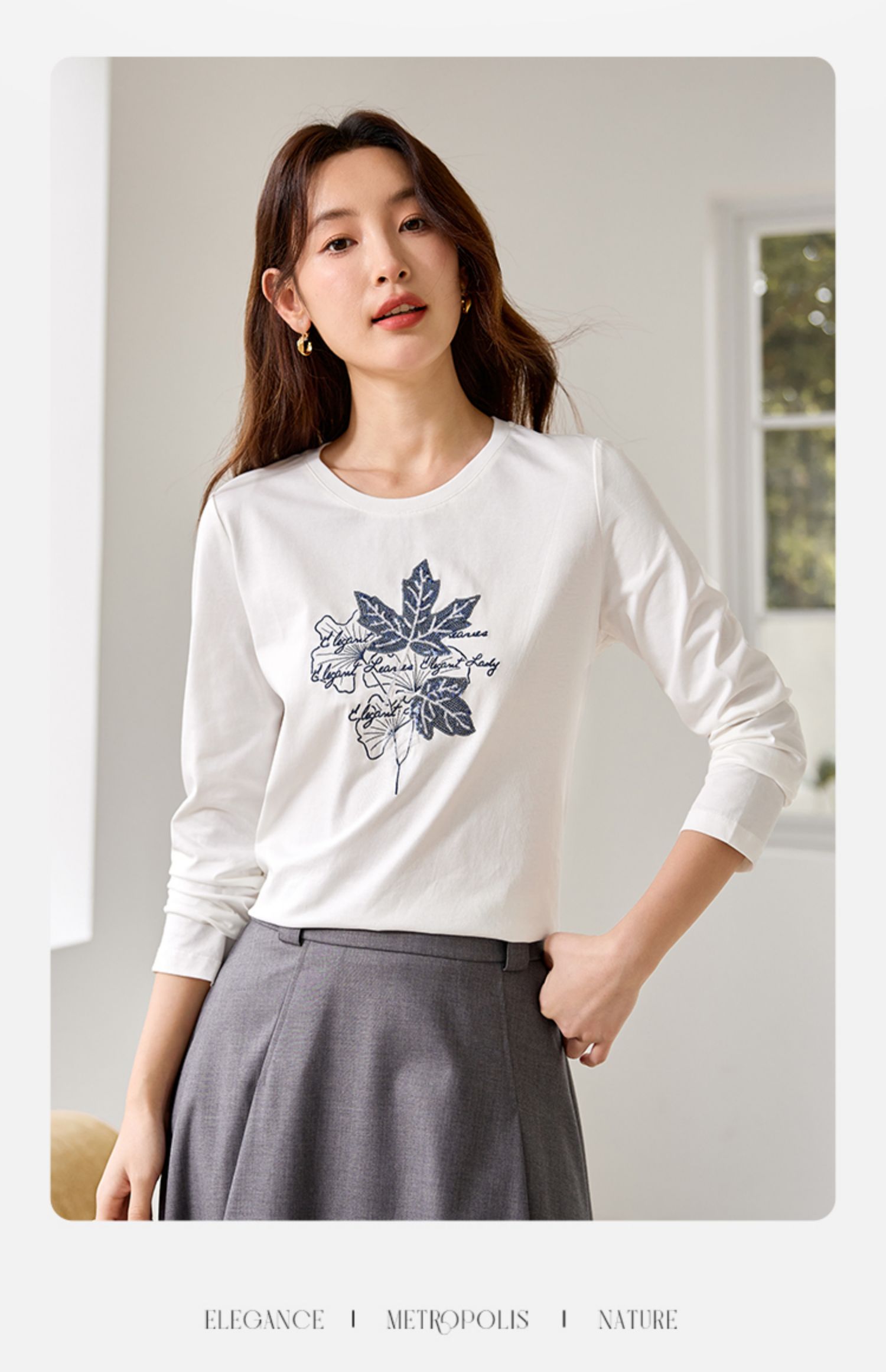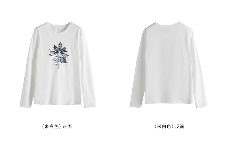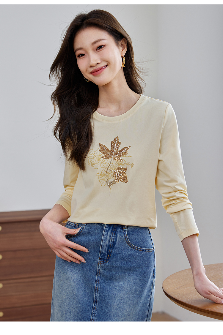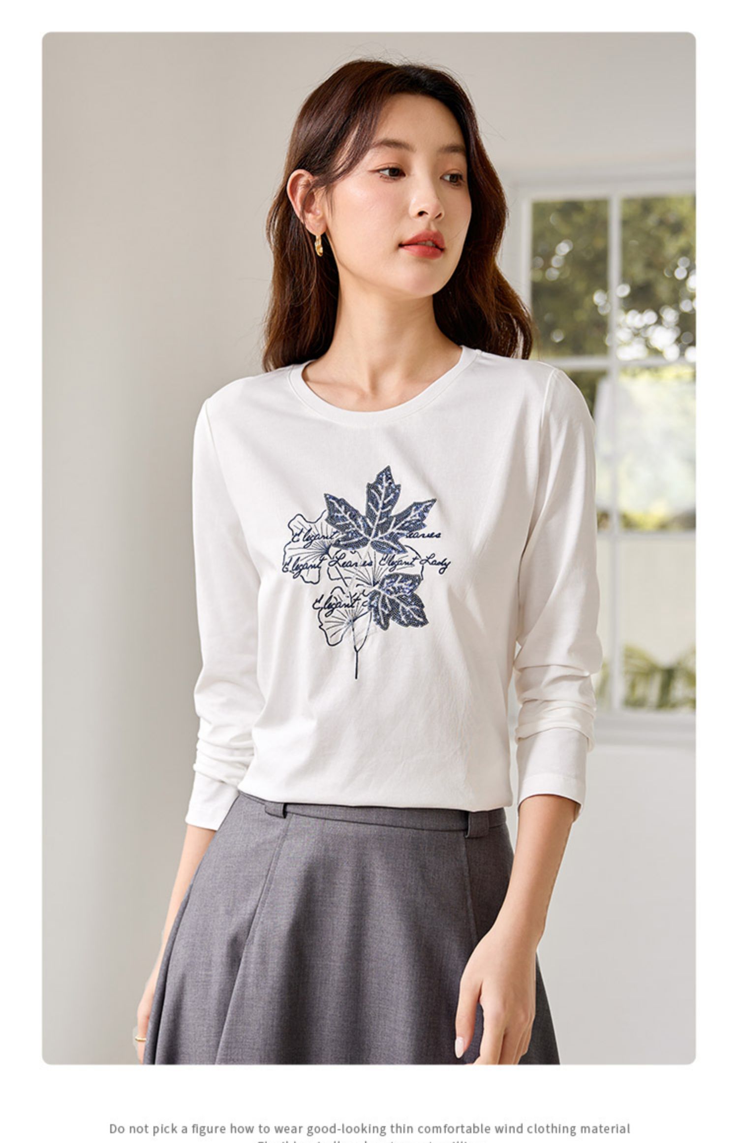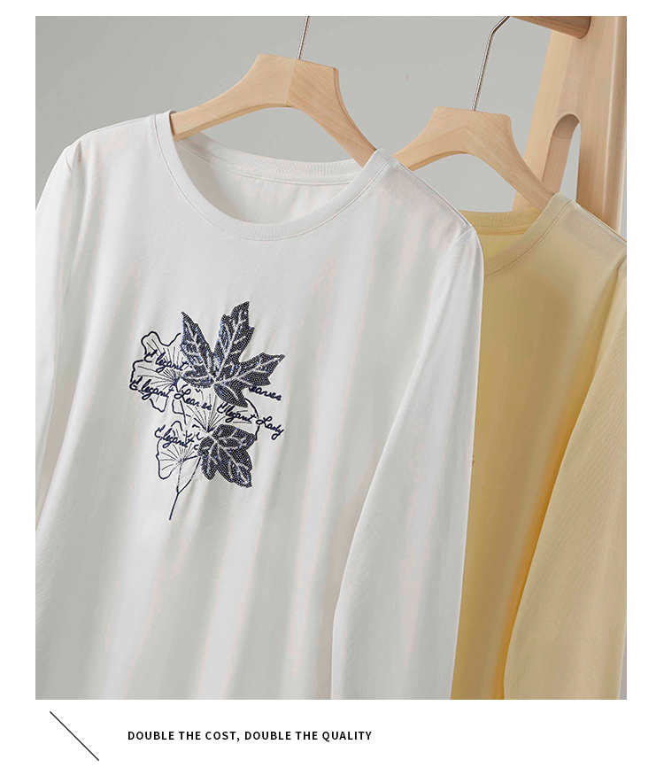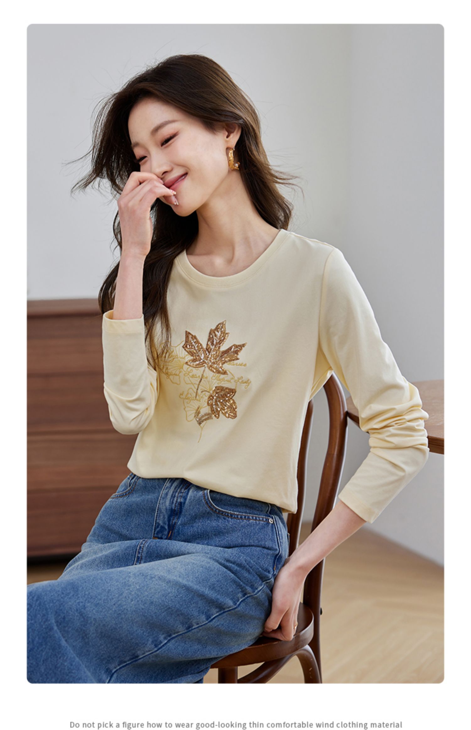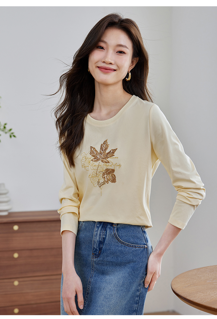 【五折购】熙世界艺术感枫叶珠片T恤长袖2025秋新款宽松显瘦休闲圆领上衣