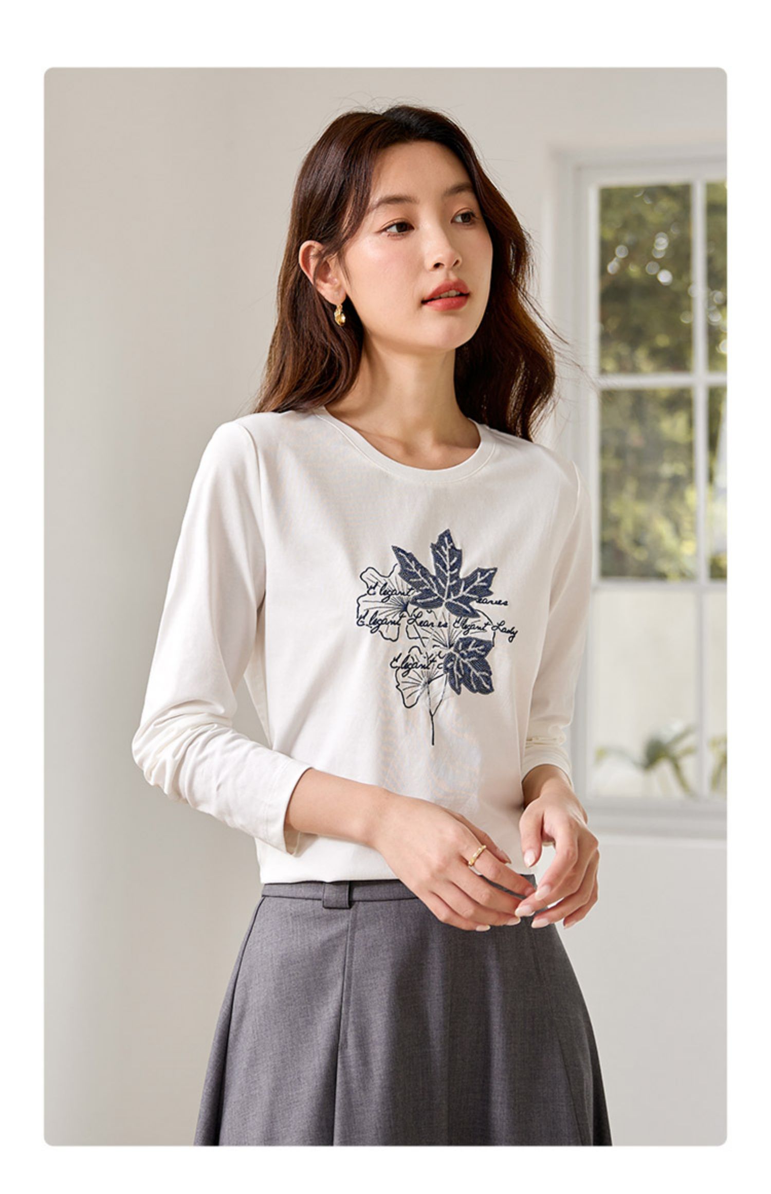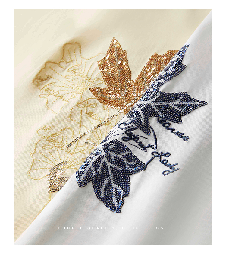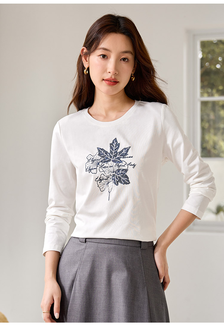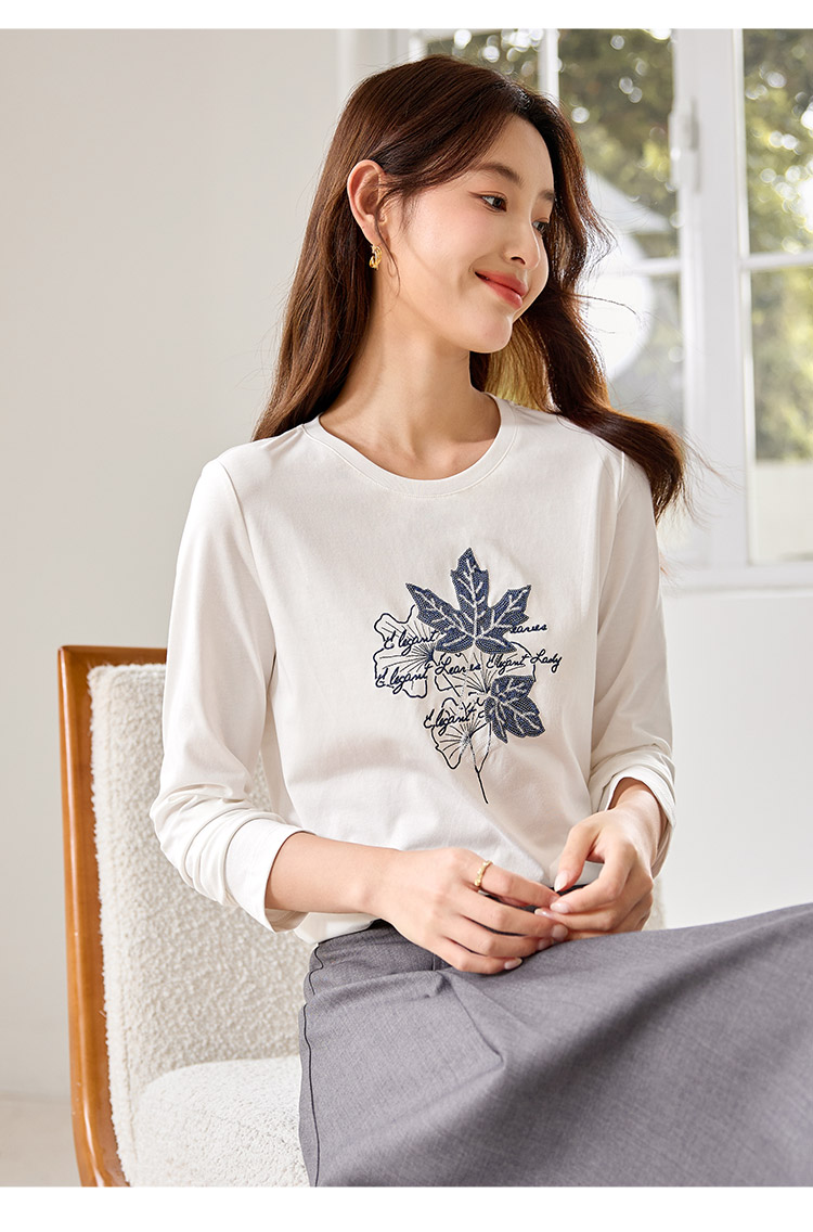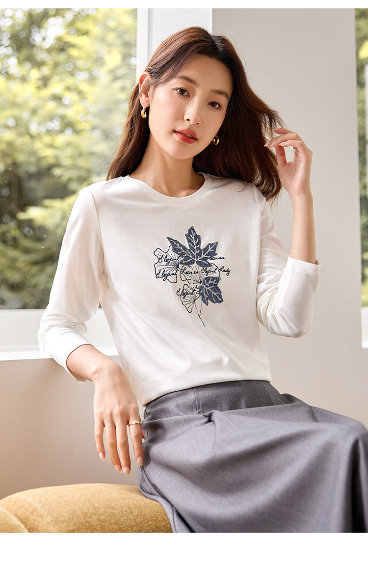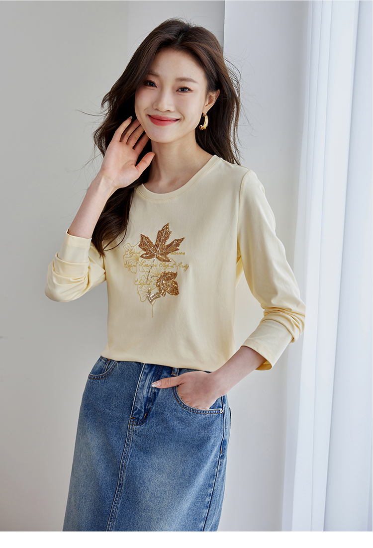 【五折购】熙世界艺术感枫叶珠片T恤长袖2025秋新款宽松显瘦休闲圆领上衣