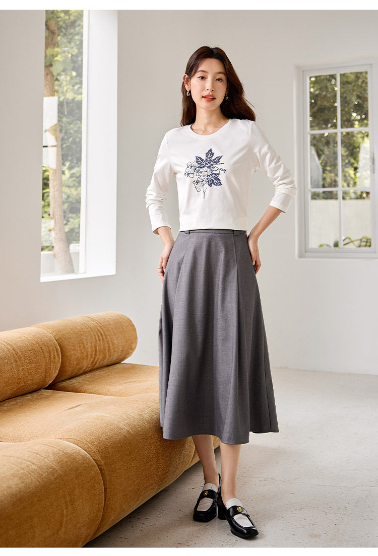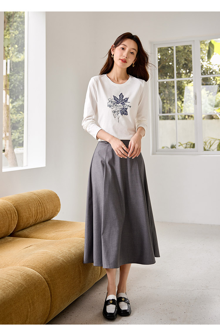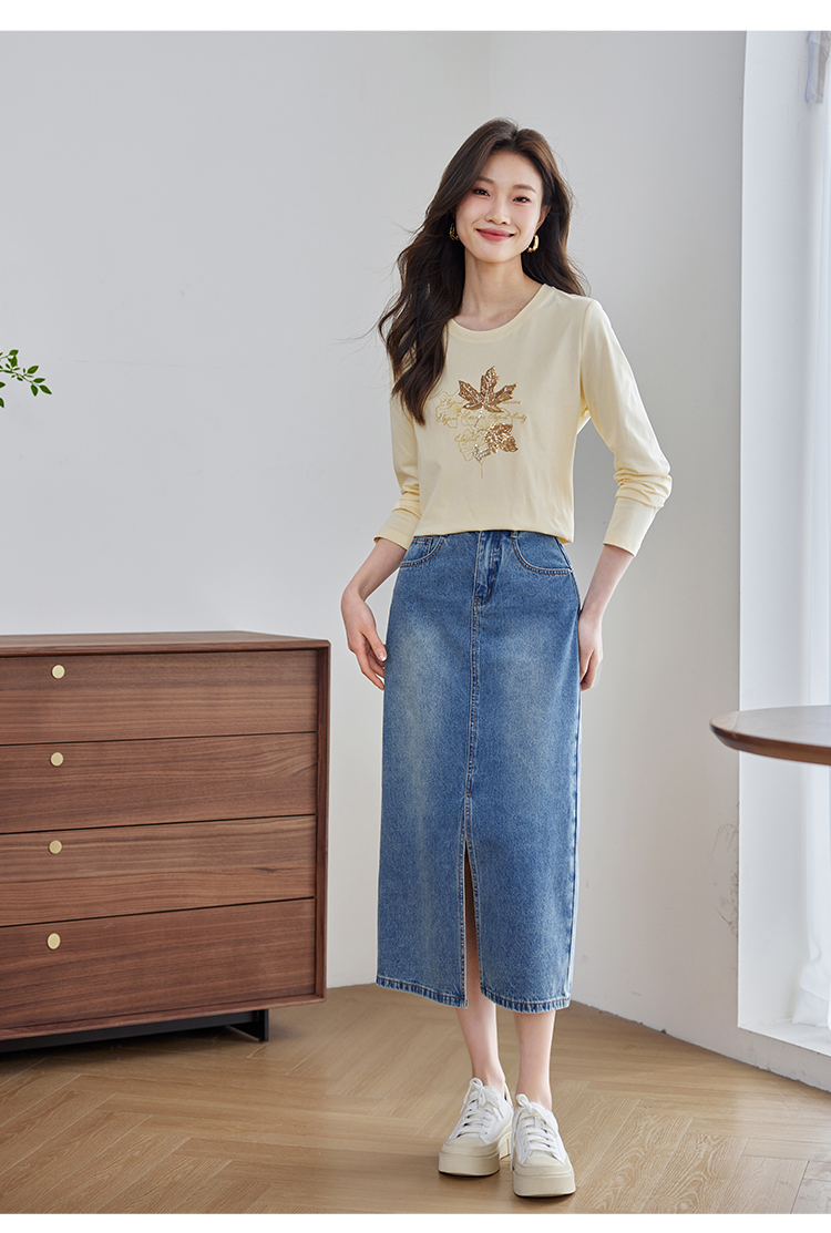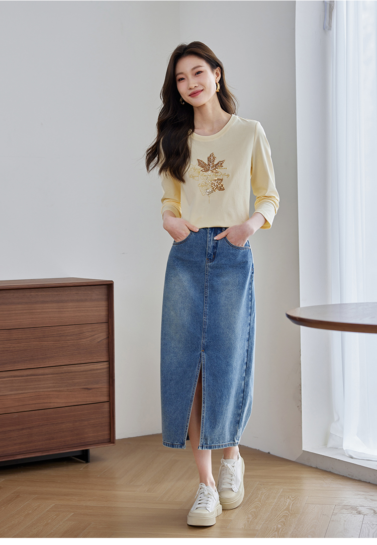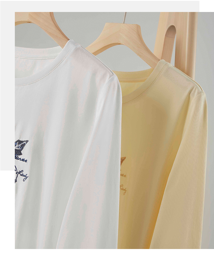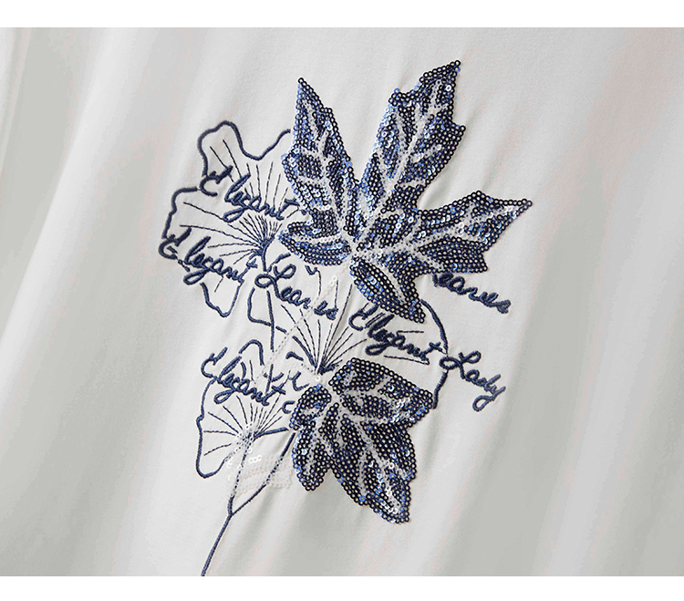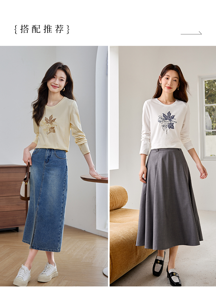 【五折购】熙世界艺术感枫叶珠片T恤长袖2025秋新款宽松显瘦休闲圆领上衣