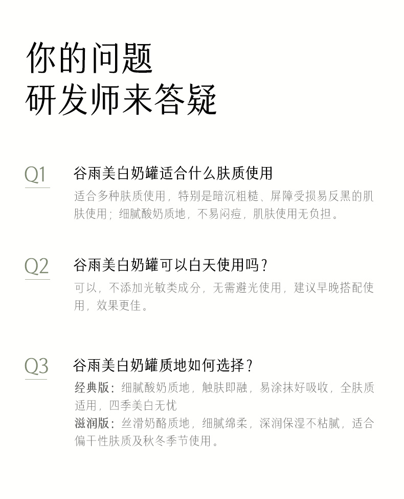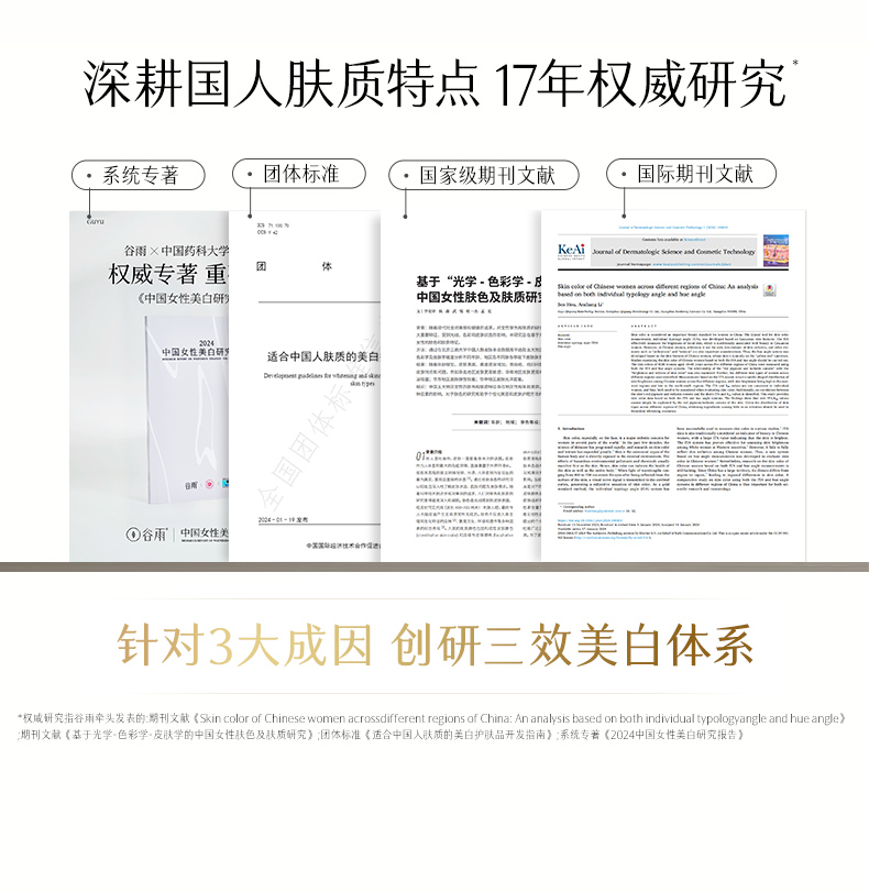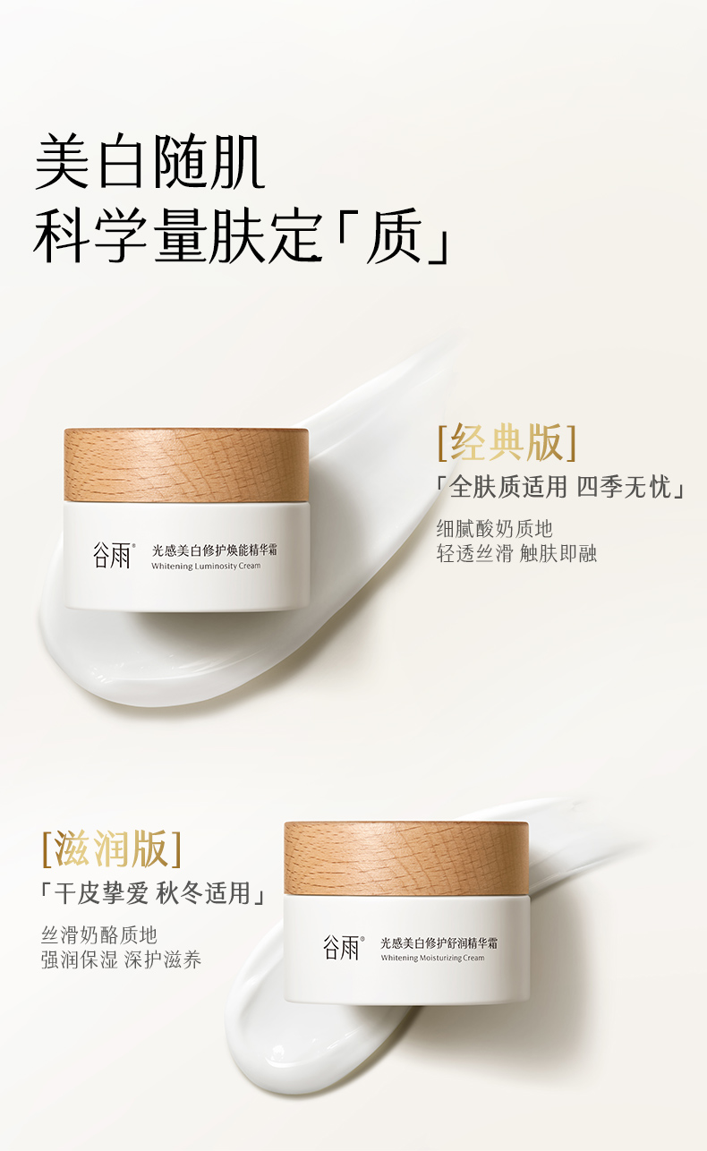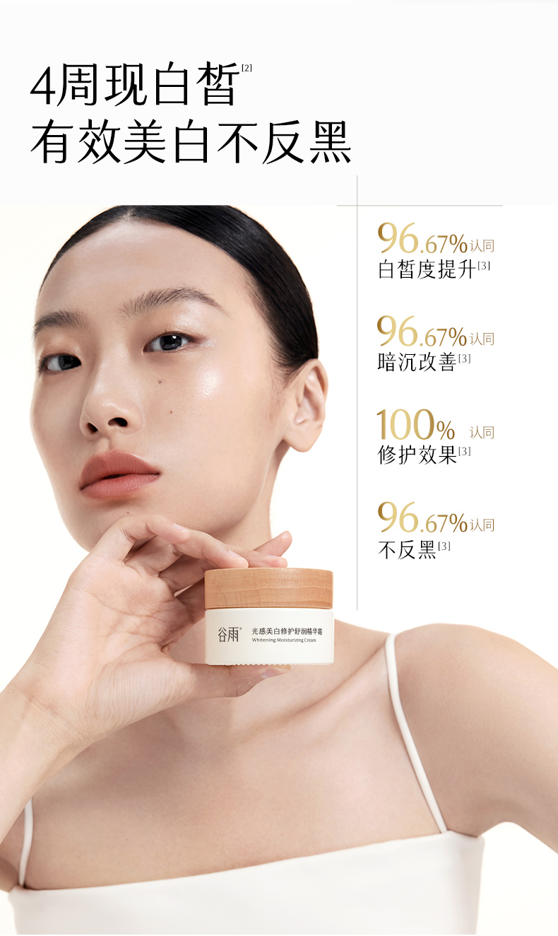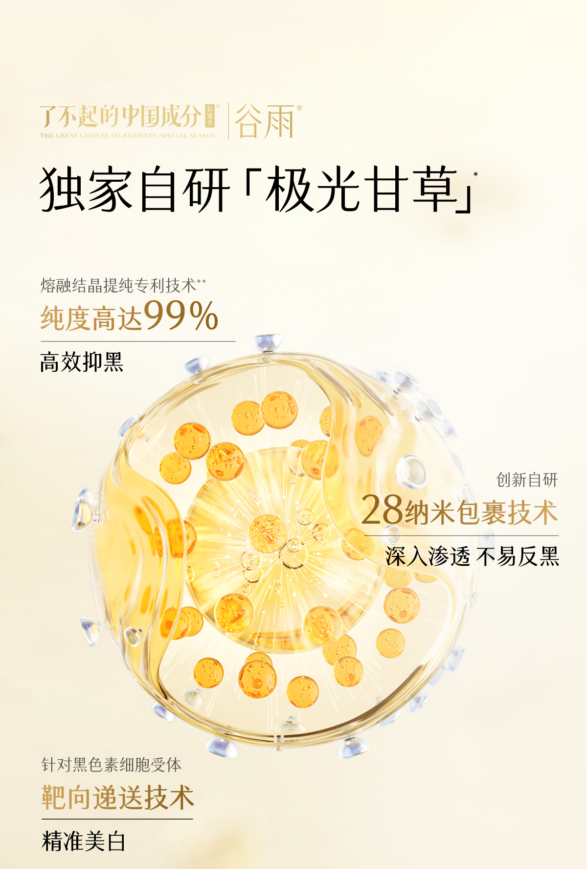 - 谷雨,更适合中国人肤质的植萃美白。专研中华珍稀美白植萃光甘草定,深入研究中国人肤质特点,打造中国女性独有的仙气白。
