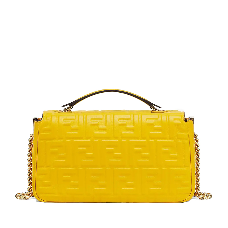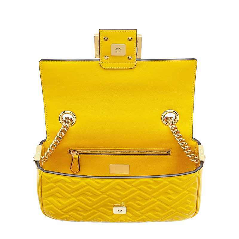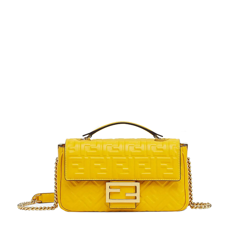 标志性Baguette中号手袋,配有链条肩带,3D纹理FF图案的黄色柔软纳帕皮革材质。缀以FF搭扣。设有正面翻盖、磁扣、带衬里的内部隔层、拉链袋和复古金色金属件。配备滑链肩带,可手提或肩挎。