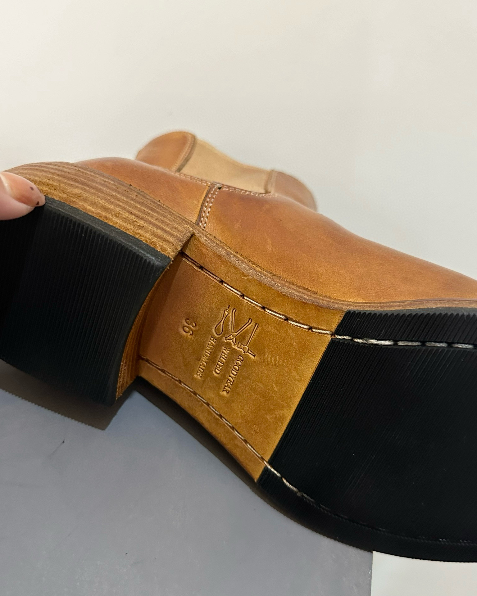 手工攀楦,水洗马皮,本色无染牛皮鞋垫,踩下去软糯不生硬,温润效果一点都不冰凉,上翘的鞋头,自然贴合,就像手工定制鞋的脚感。