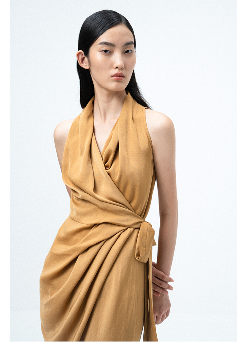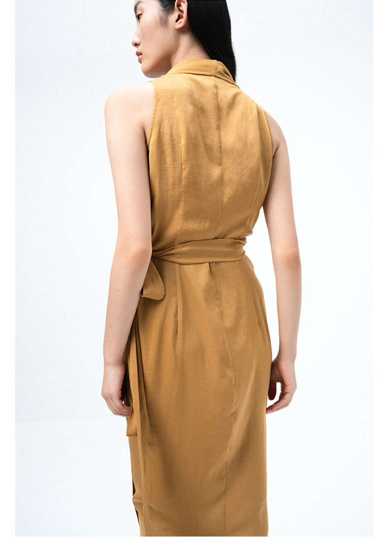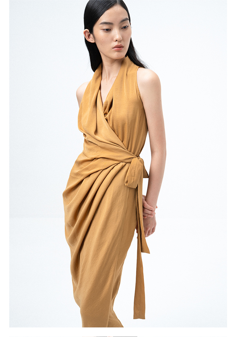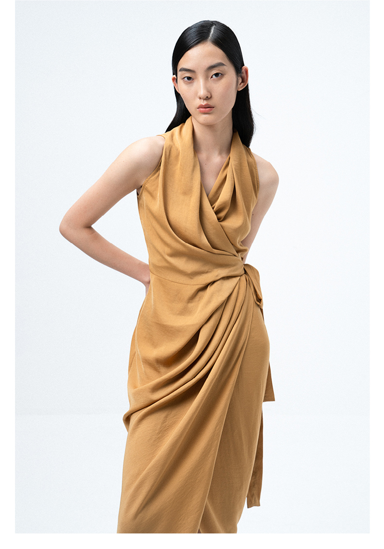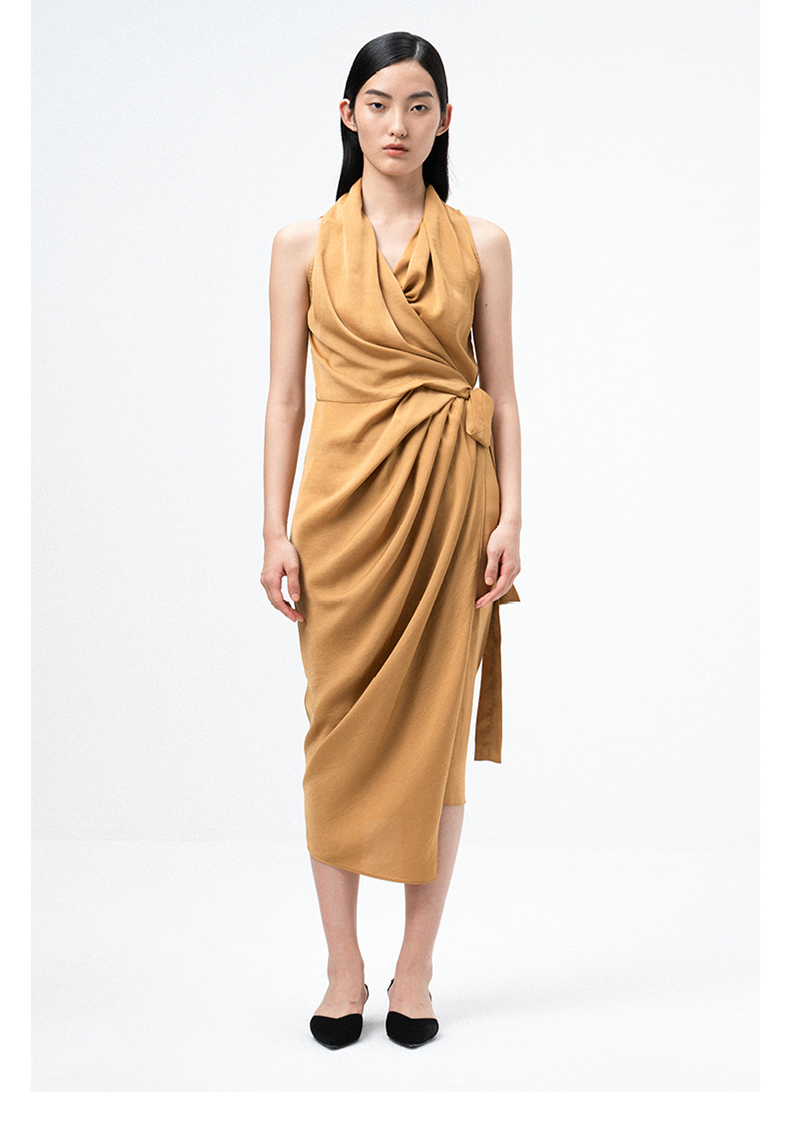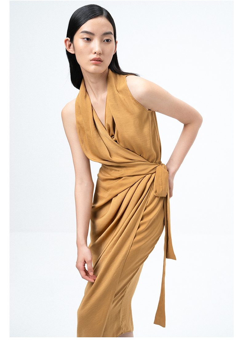 【潘思帕国王】古铜黄立裁垂皱腰间系带裹身连衣裙/0000703