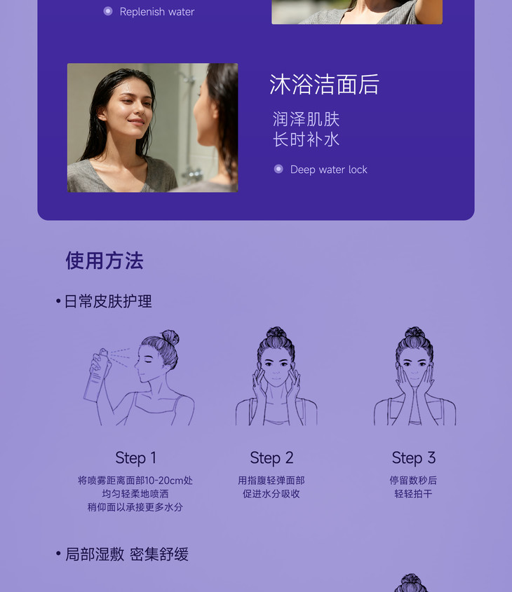【使用人群】皮肤干燥日常补水,晒后修护,日常维稳修护皆可,孕期哺乳期都可用,对成分过敏人群请勿使用。