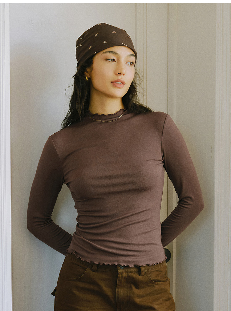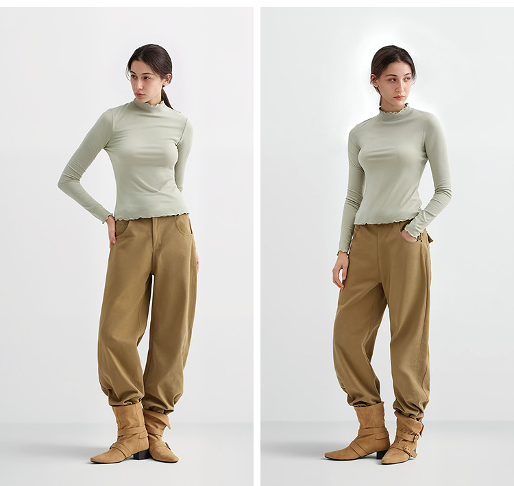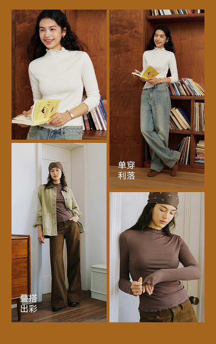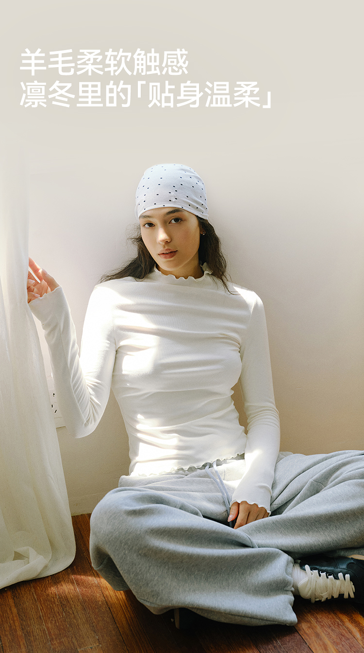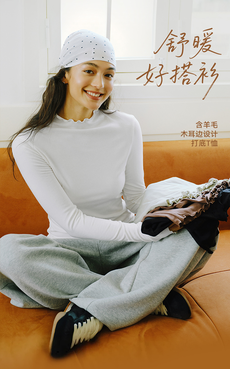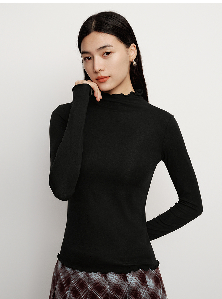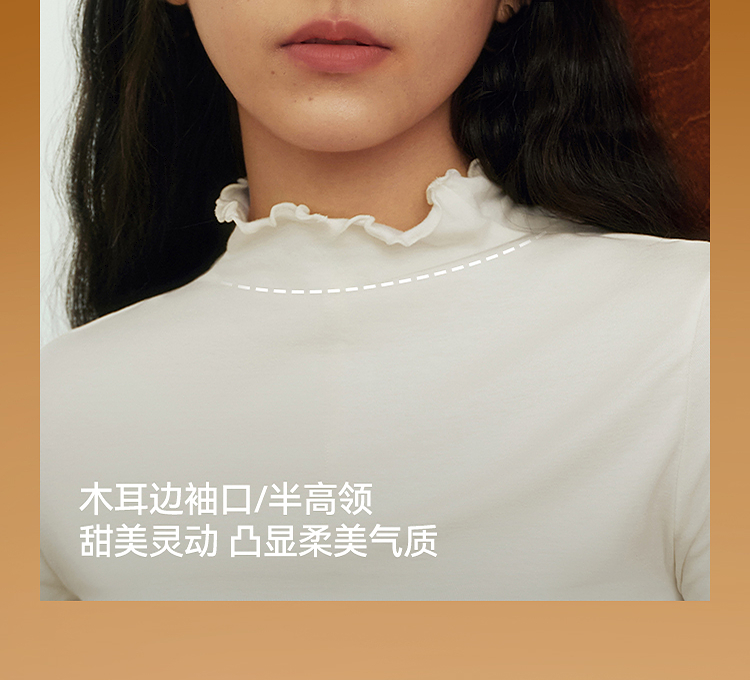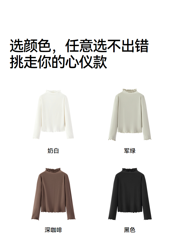 森马长袖T恤女半高领紧身纯色冬季2025新款发热抓绒木耳边打底衫