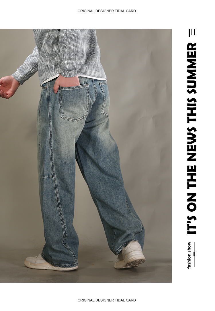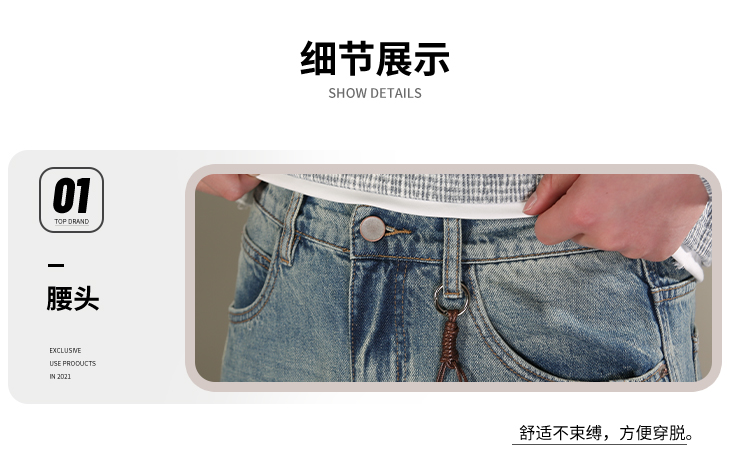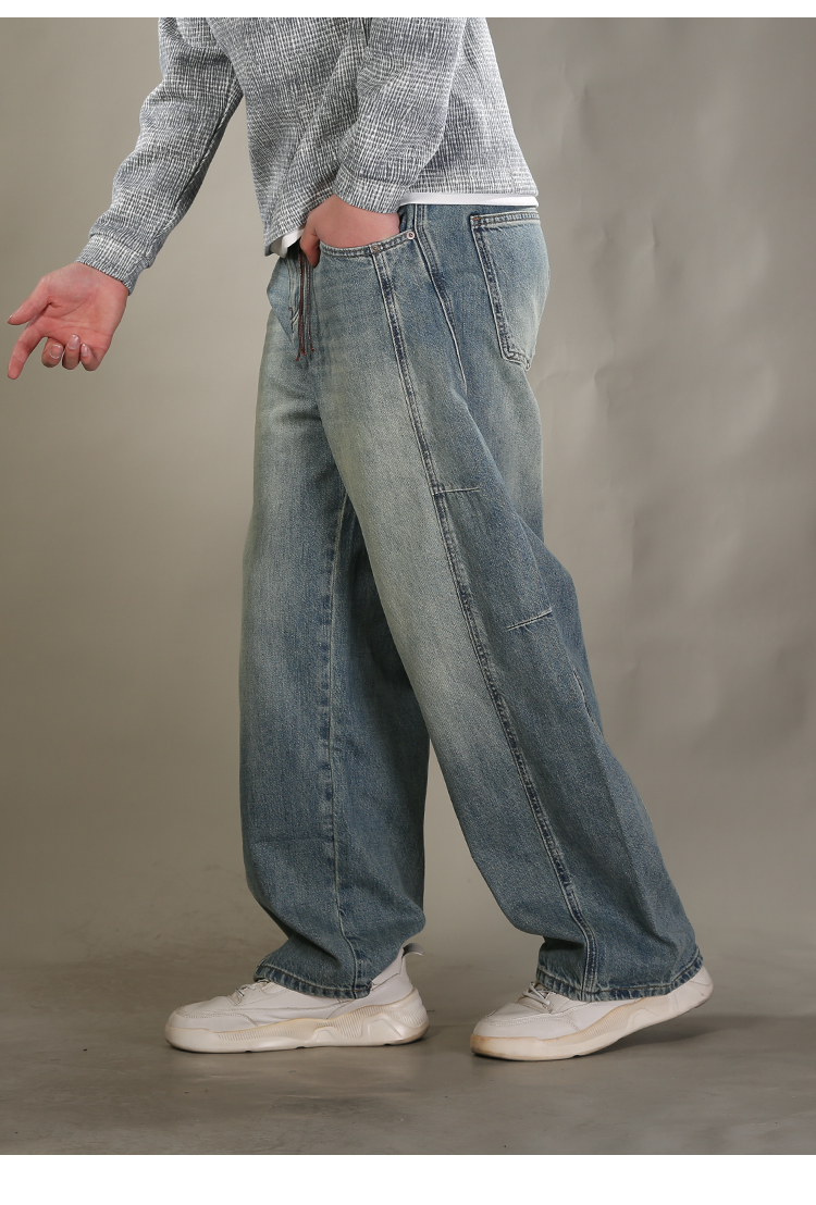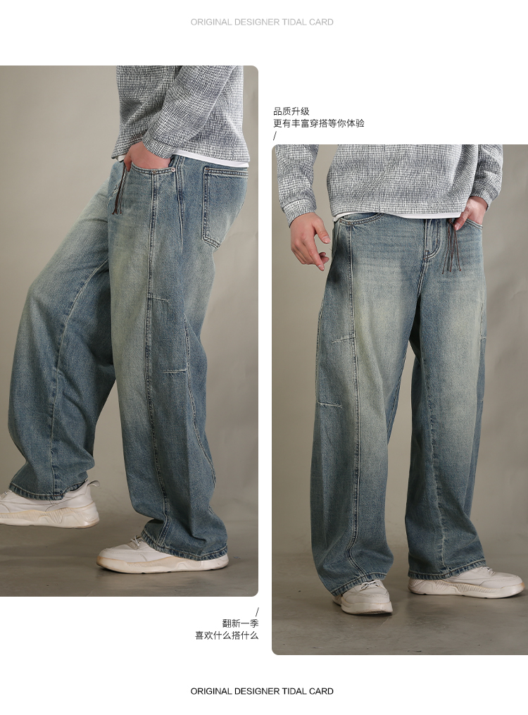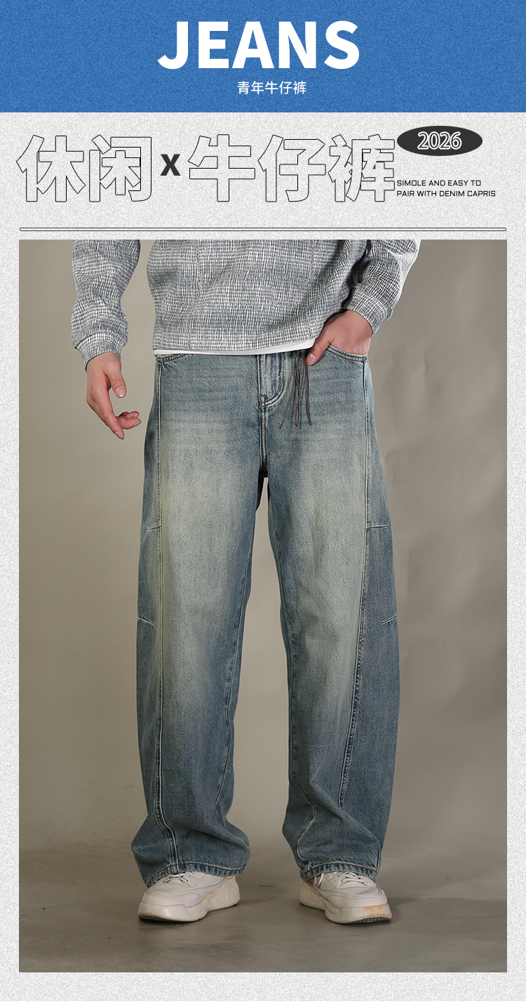 DRONKOO 2026 半松紧腰铜色钮扣裤袢吊绳前后破骨中厚牛仔长裤