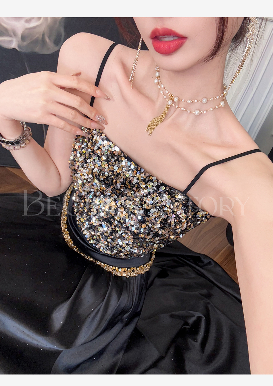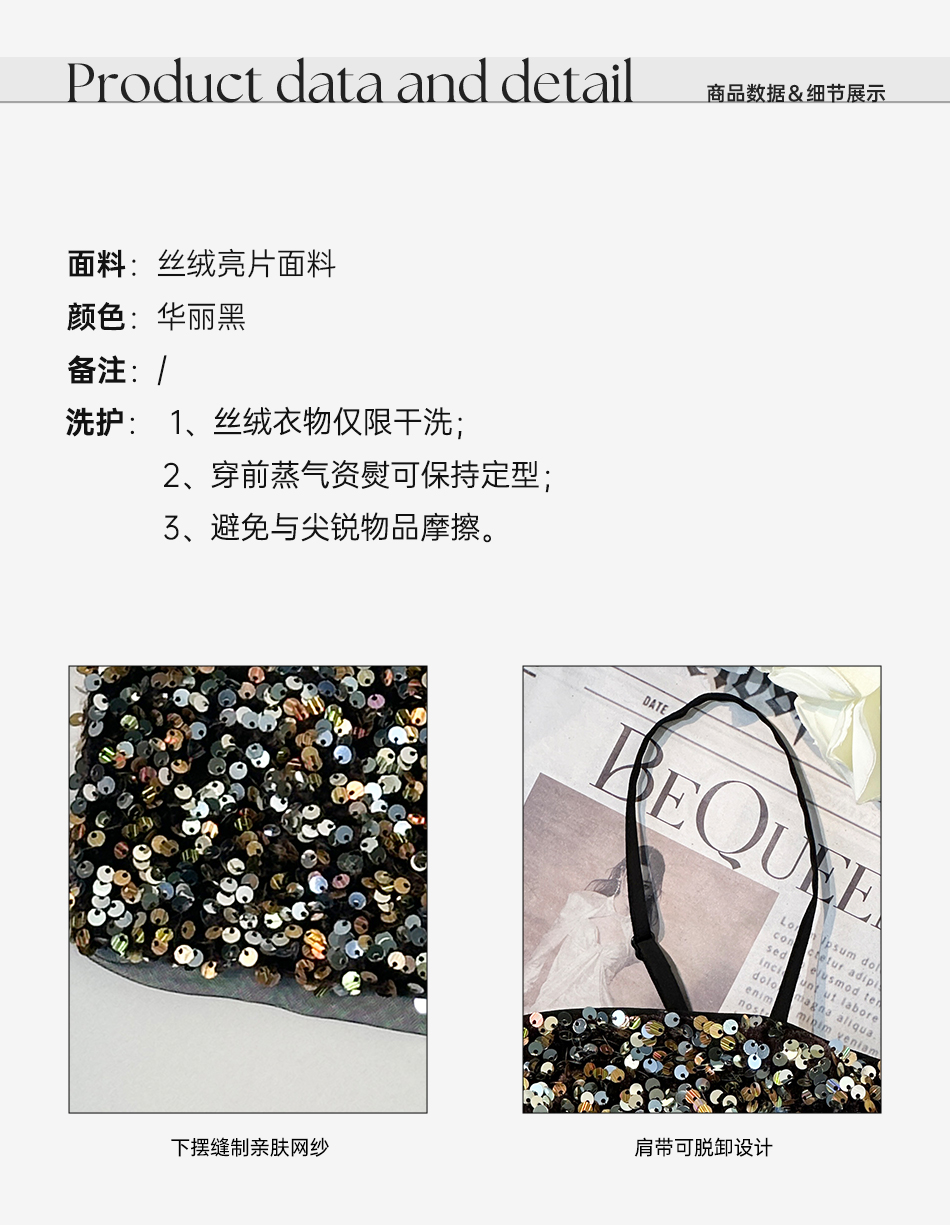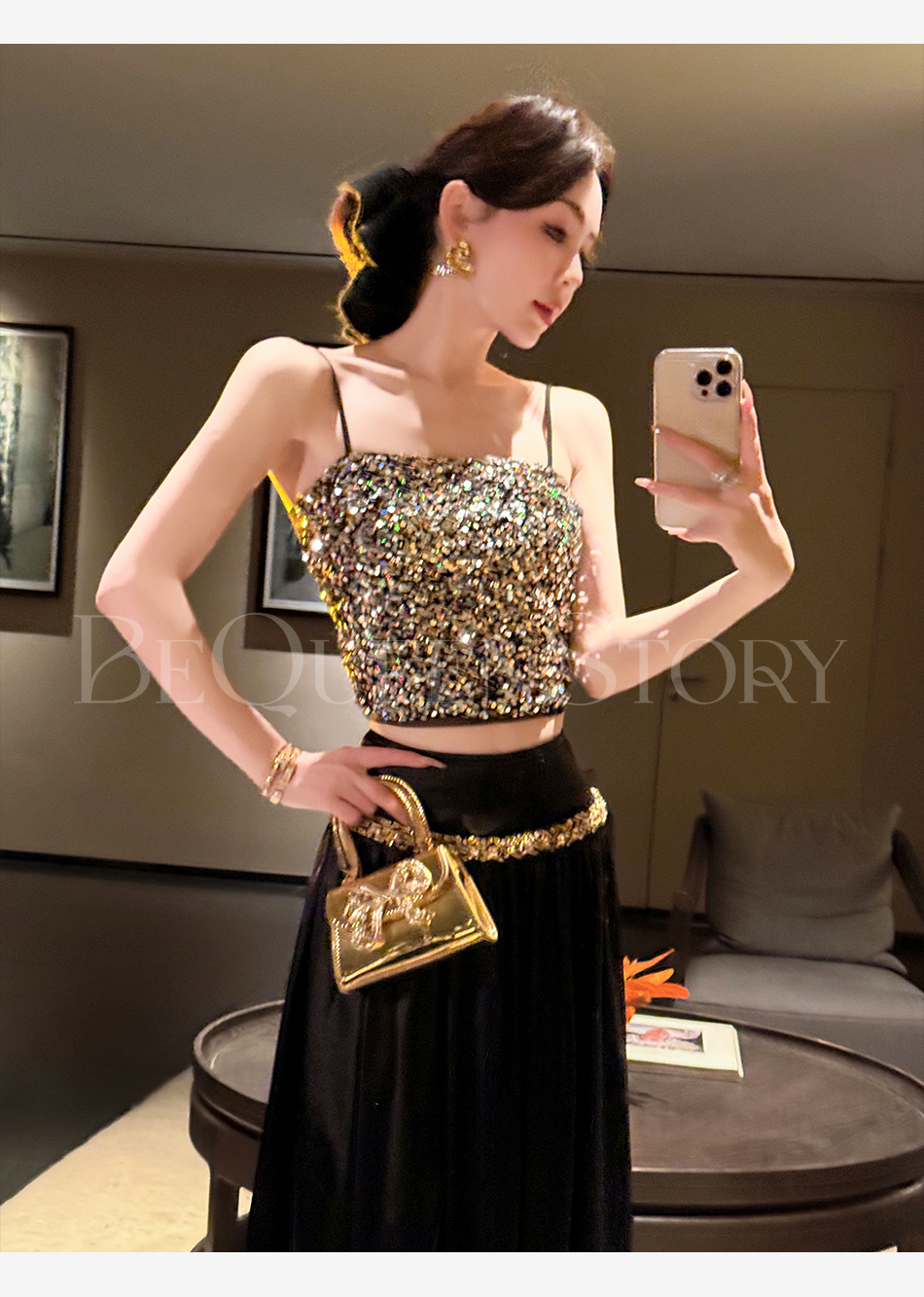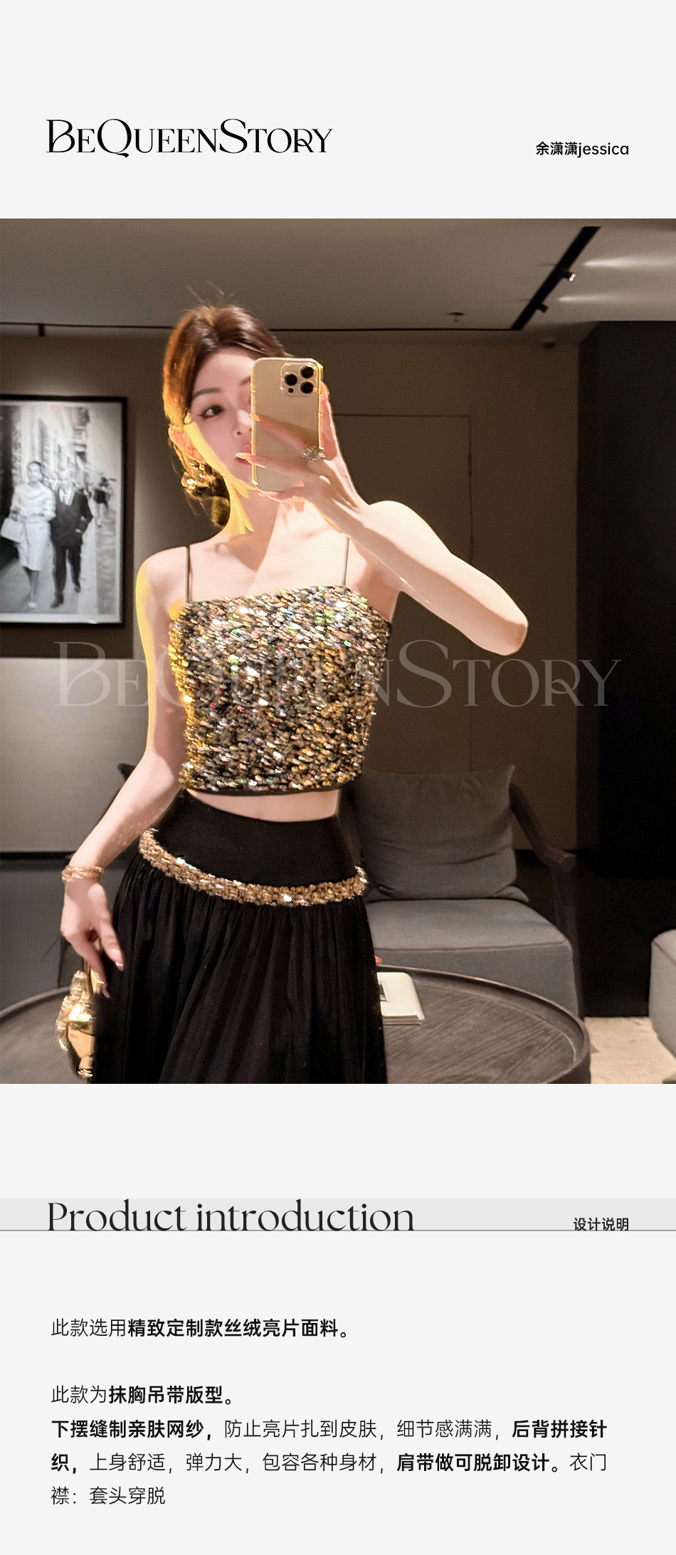 余潇潇【黑金晚宴】性感丝绒亮片后背拼接弹力针织抹胸吊带背心