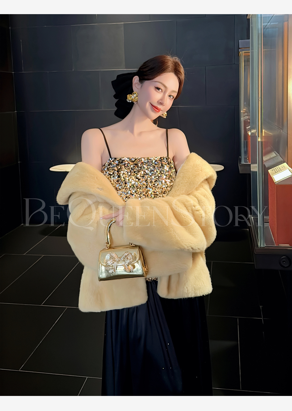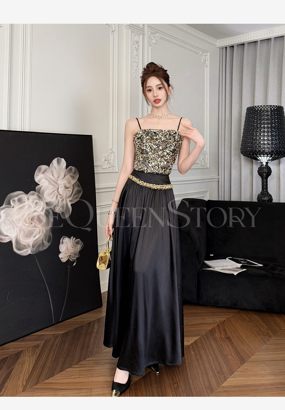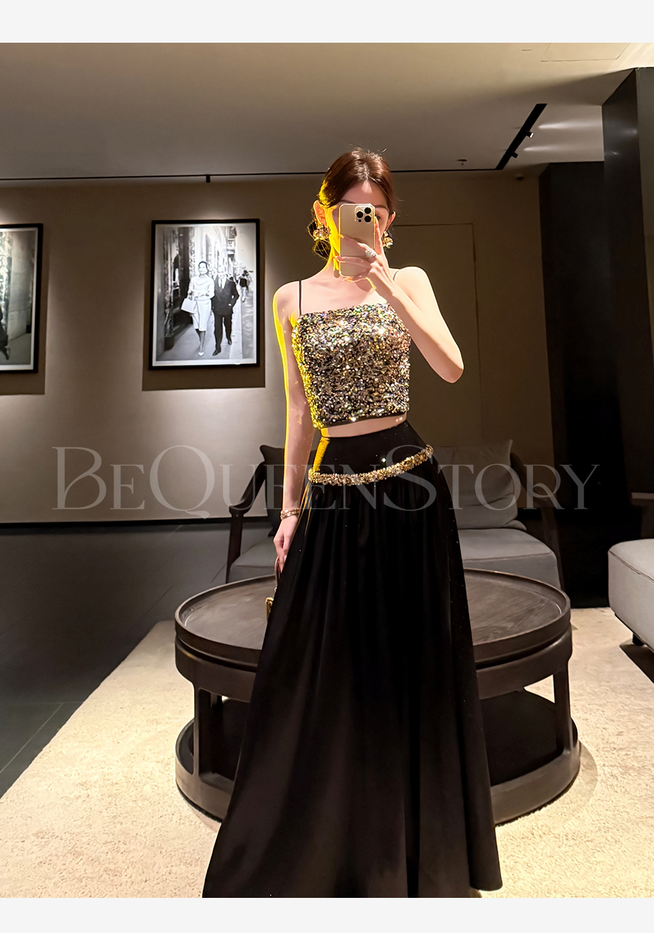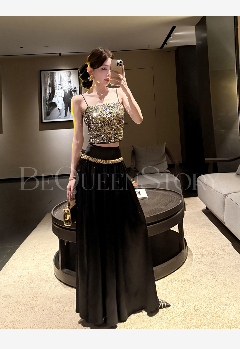 余潇潇【黑金晚宴】性感丝绒亮片后背拼接弹力针织抹胸吊带背心