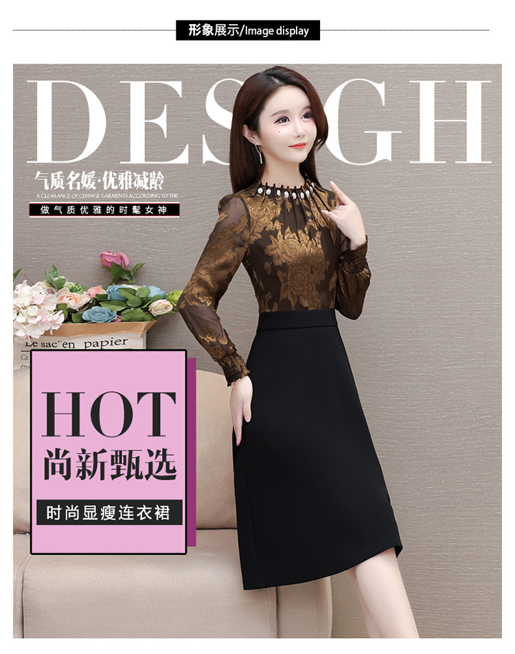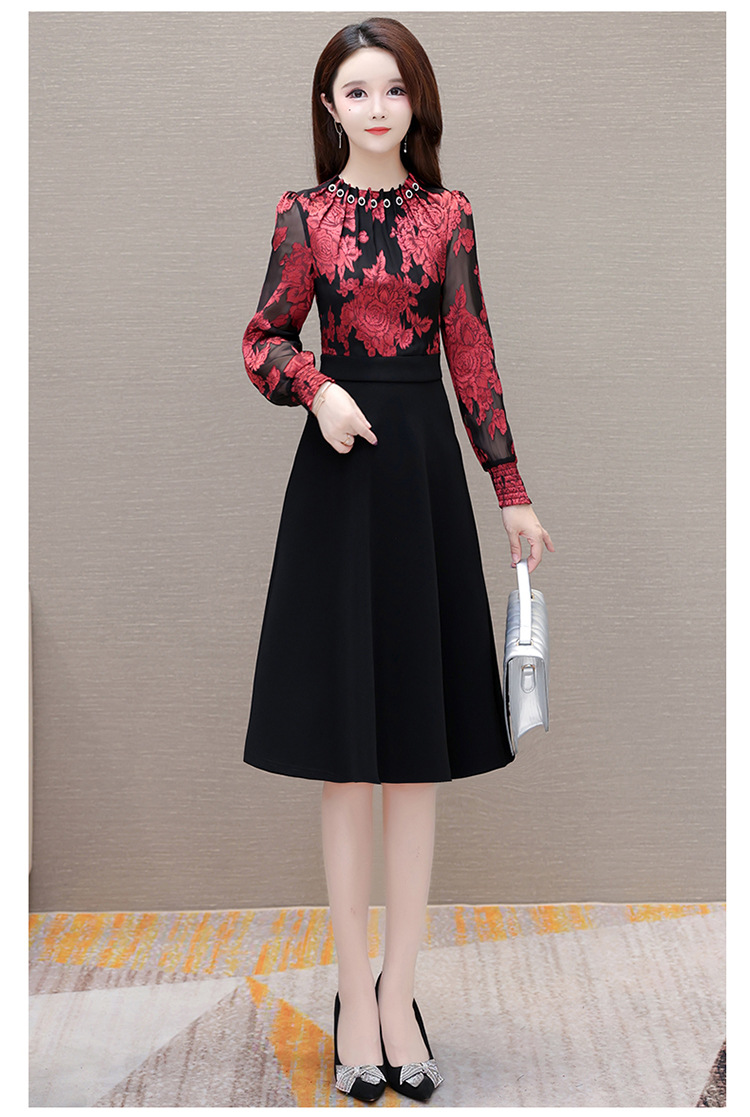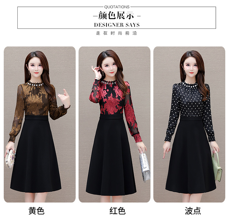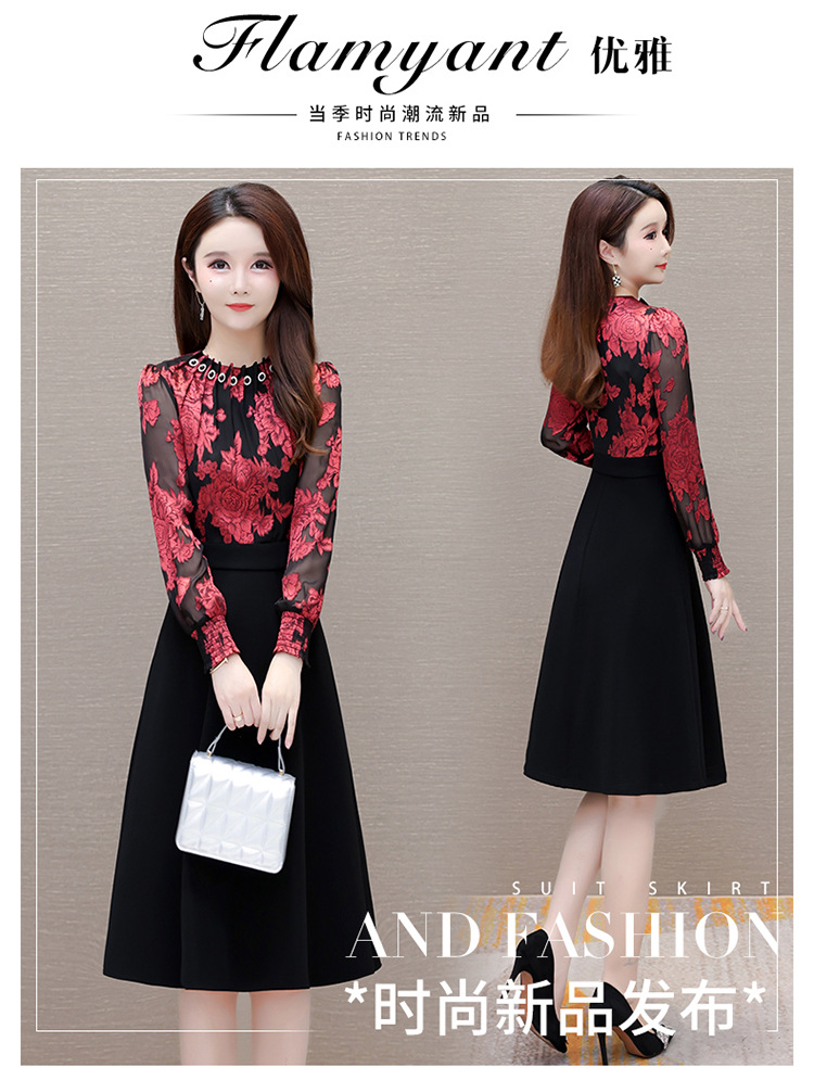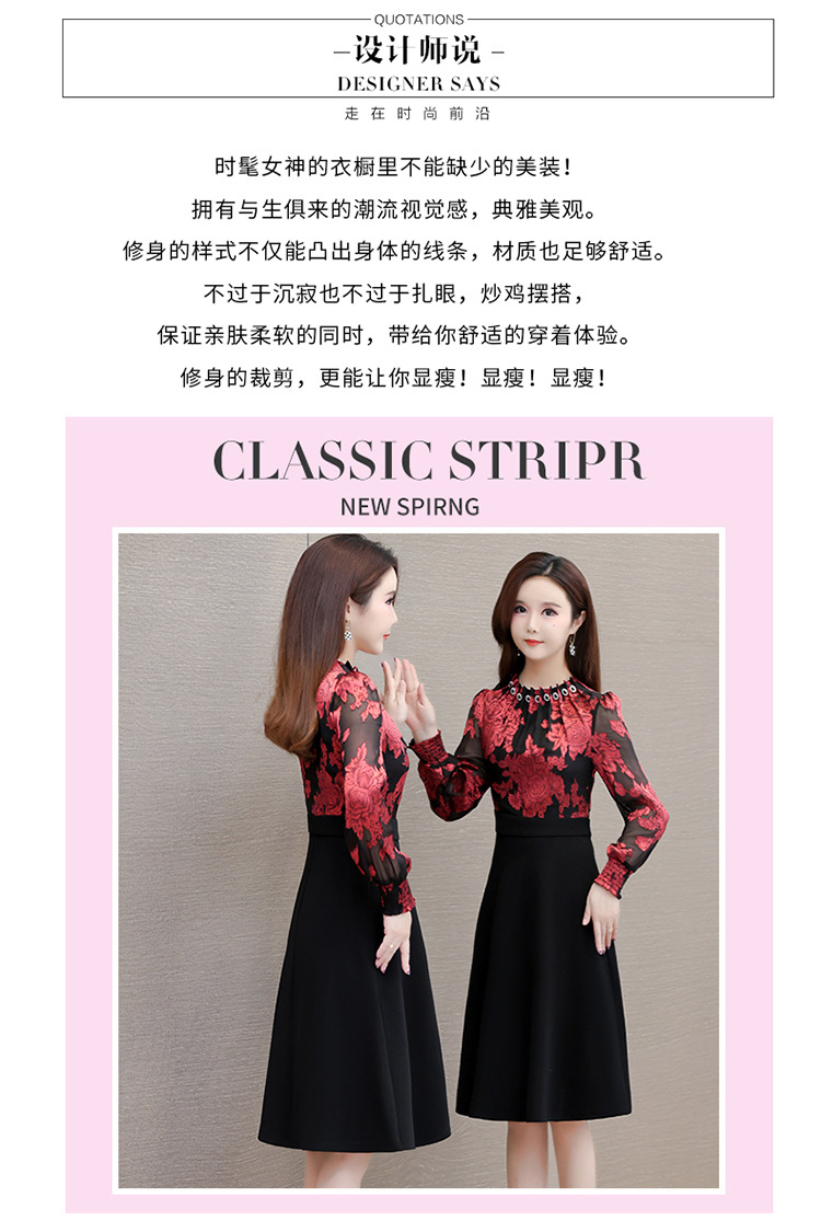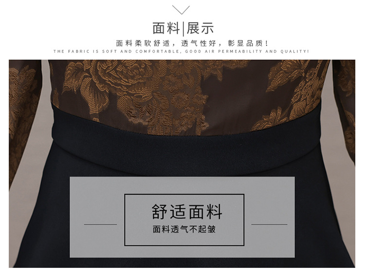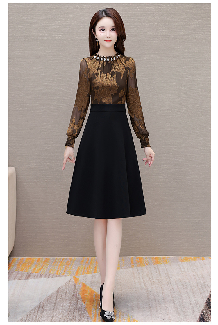 时尚气质,拼结假两件中年女装高腰长袖A字裙春装印花连衣裙QYM-XY-23DB76-Y