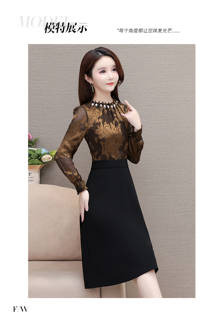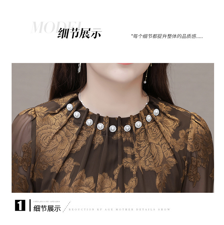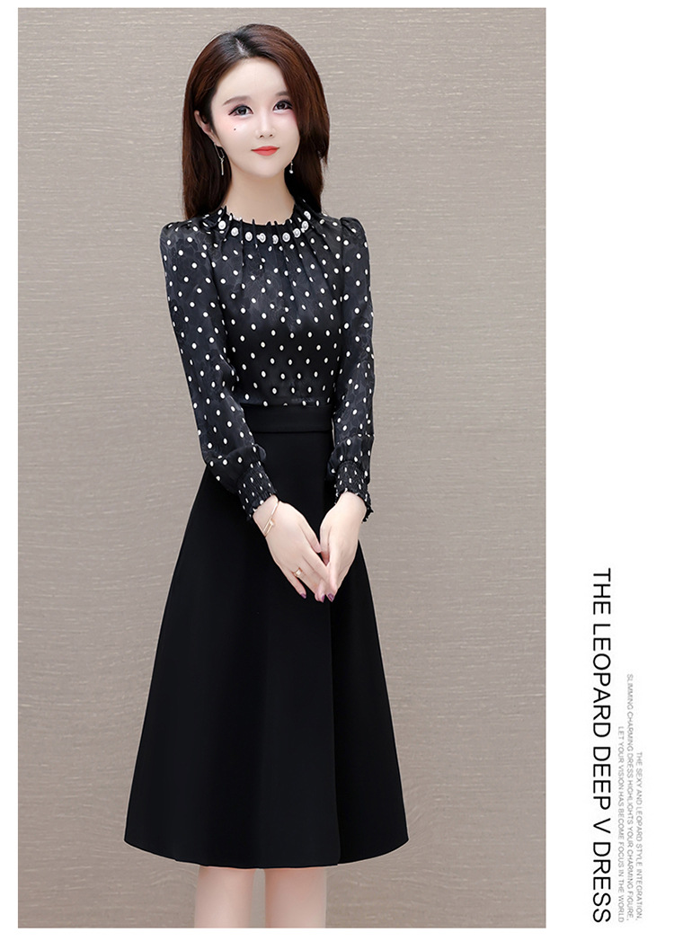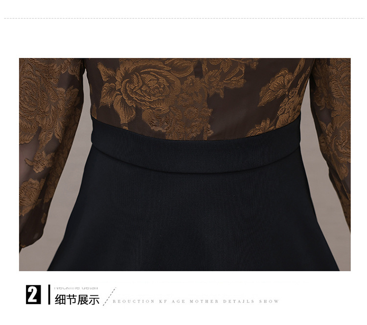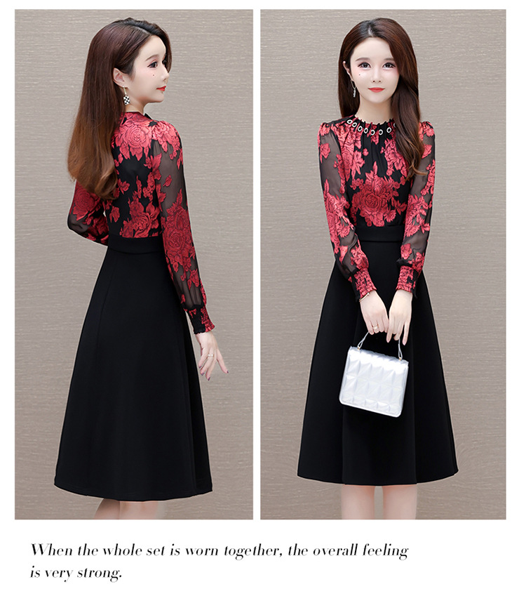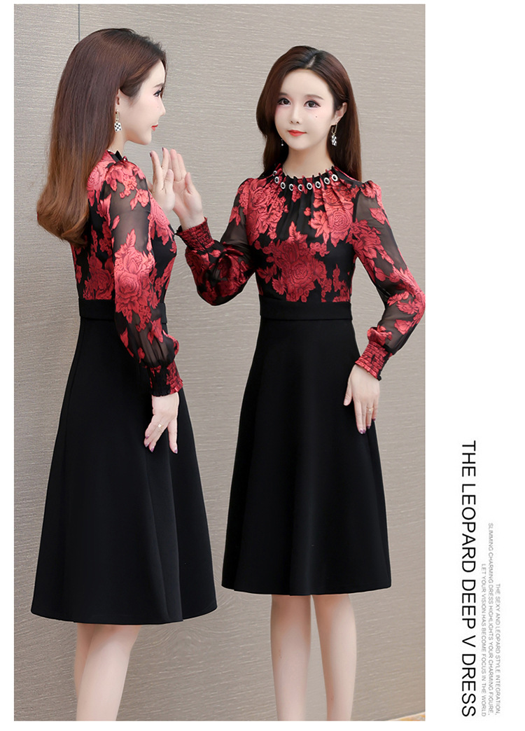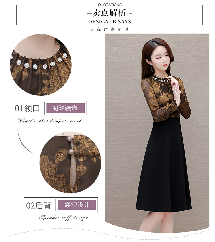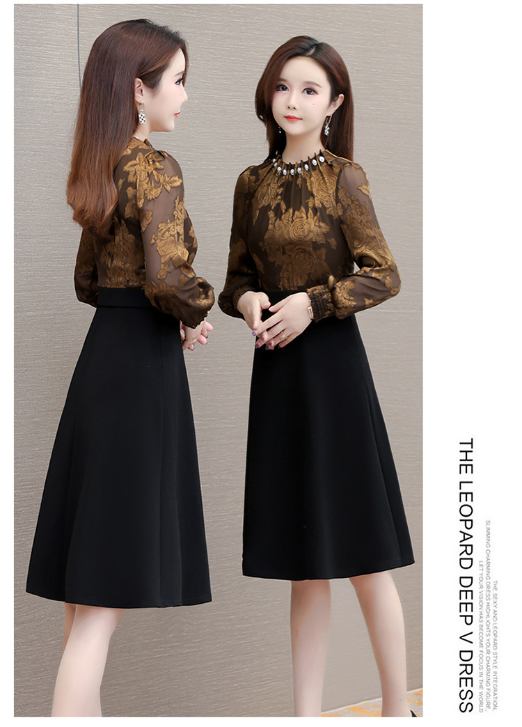 时尚气质,拼结假两件中年女装高腰长袖A字裙春装印花连衣裙QYM-XY-23DB76-Y