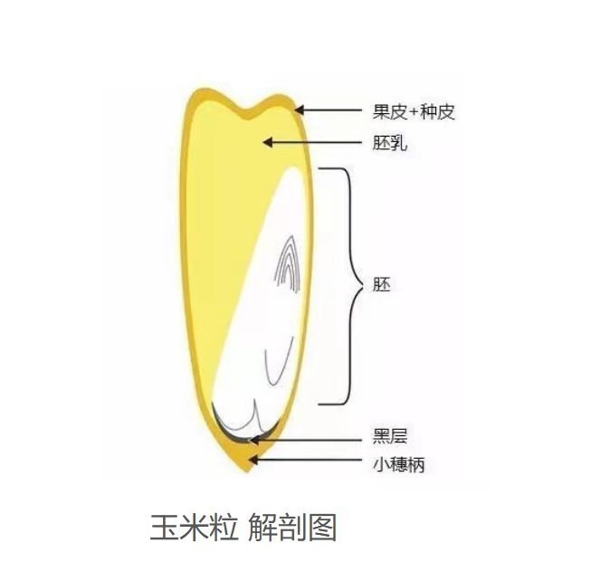 在玉米胚芽籽粒和玉米胚轴接触部位有个黑色的颗粒, 这个是玉米粒胚根, 是玉米种子发芽不可缺少的一部分,没有它种子就不会发芽。