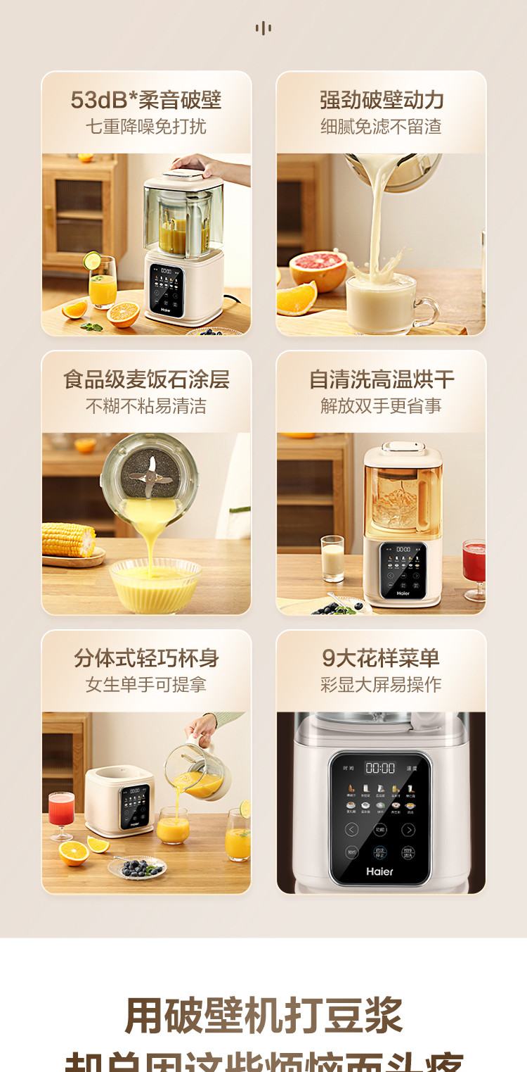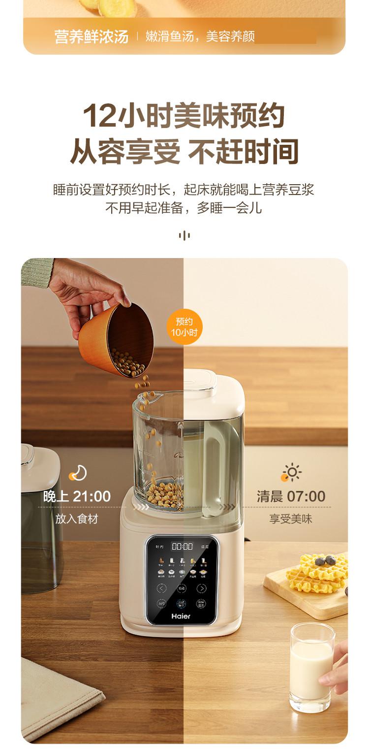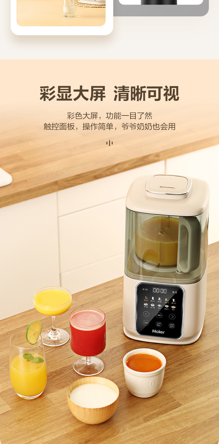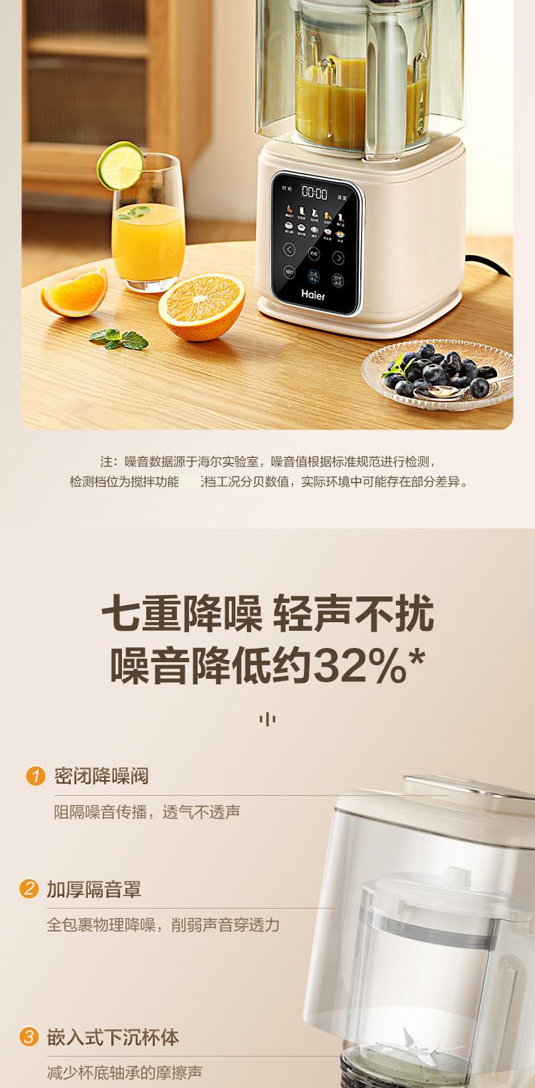 海尔(Haier)破壁机 0.9L多功能柔音降噪多档预约加热无渣豆浆机 全自动热风杀菌 榨汁机料理机HPB-D01
