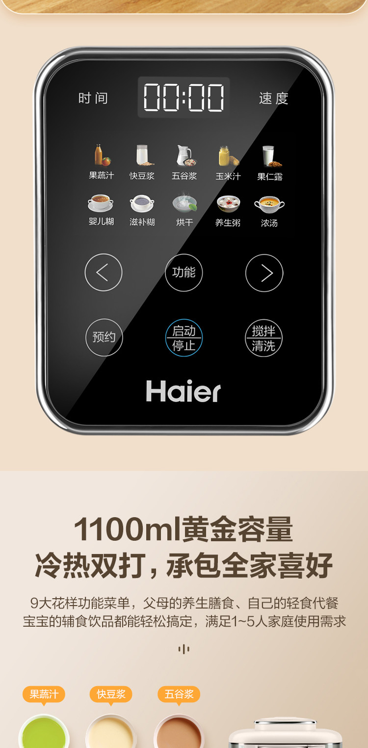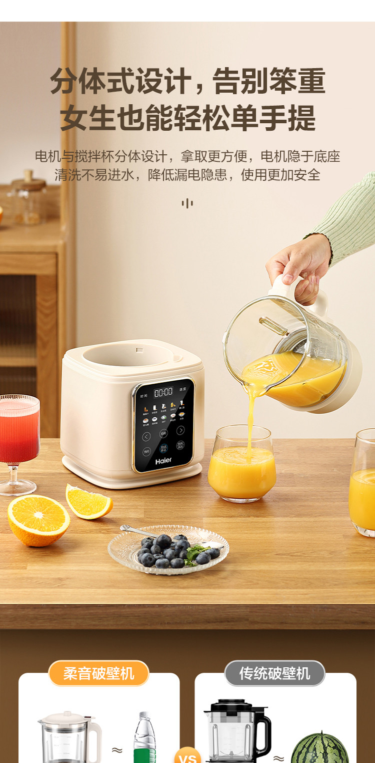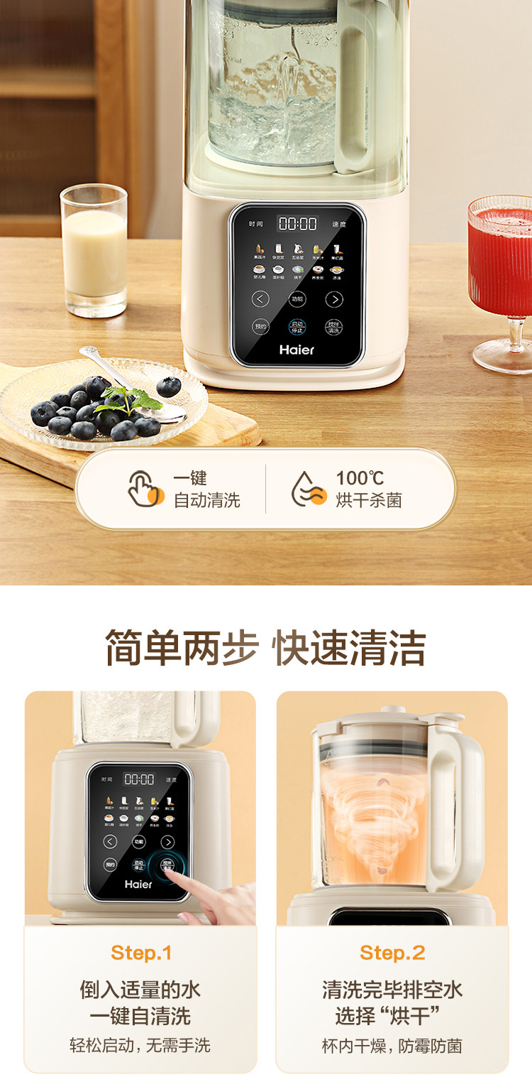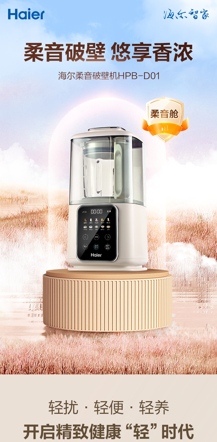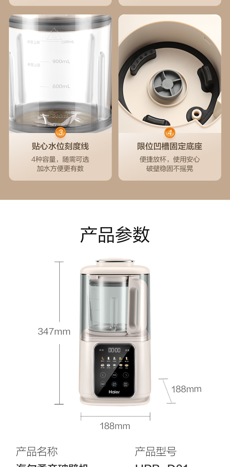 海尔(Haier)破壁机 0.9L多功能柔音降噪多档预约加热无渣豆浆机 全自动热风杀菌 榨汁机料理机HPB-D01