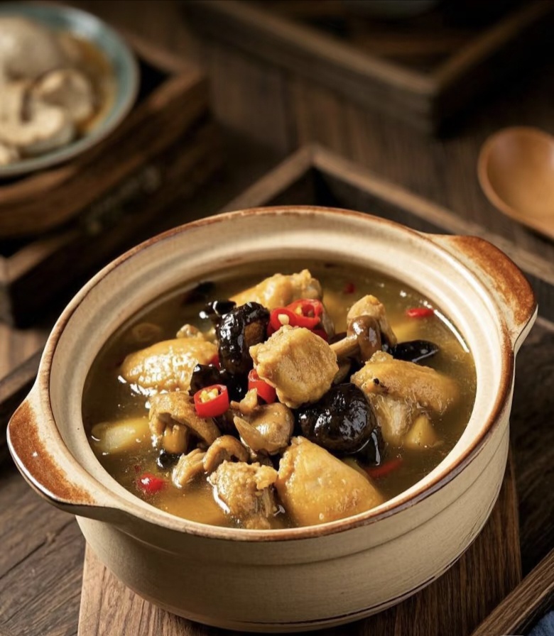 小鸡炖蘑菇:榛蘑与鸡肉、姜片、葱段同炖,加生抽、料酒调味,汤汁浓郁鲜香,是东北传统做法。