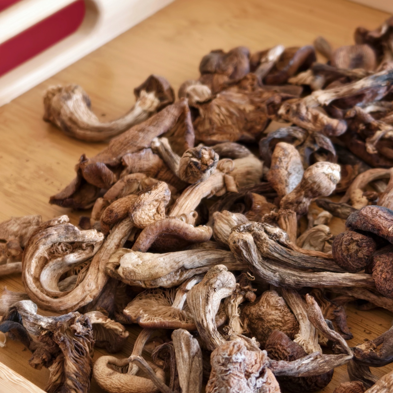 这一传统工艺不仅延长了食用期限,更神奇地浓缩了风味物质,还让隔年干榛蘑比鲜品更具风味深度