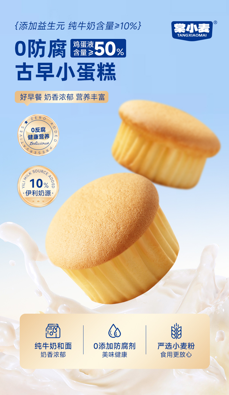棠小麦 古早小蛋糕 520g/箱 元气早餐新选择;10%纯牛奶添加,奶香浓郁;鸡蛋液含量≥50%,营养丰富;添加益生元,小巧玲珑,美味随时享用;
