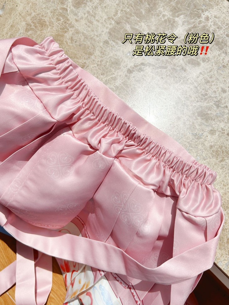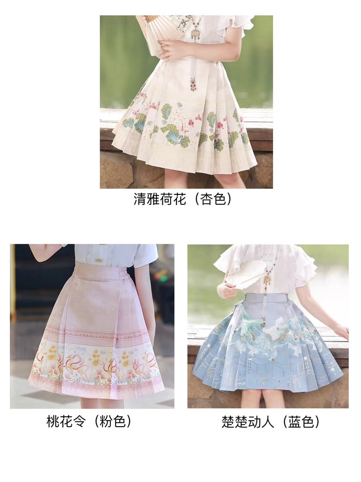 马面裙是有三个款的哈,对应着三个颜色:清雅荷花(杏色)、楚楚动人(蓝色)、桃花令(粉色)