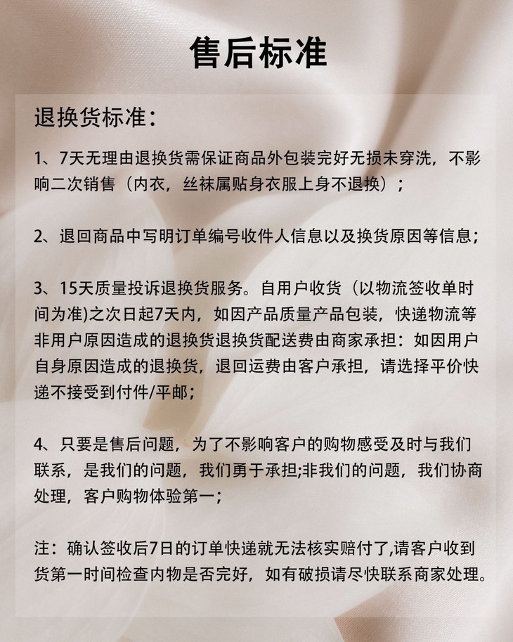 【售后政策】支持七天无理由退货,不影响二次销售前提下(不要拆吊牌)