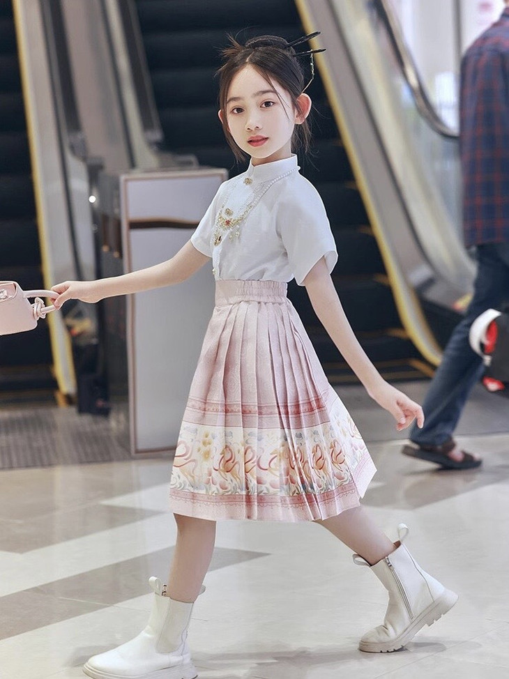 中大童!美到心坎里的汉服【儿童新中式马面裙套装】仿绸缎马面裙飒气有型,手工打褶,超级重工,褶皱立体不变形,国风元素图案,端庄秀丽,塑造独特东方美学