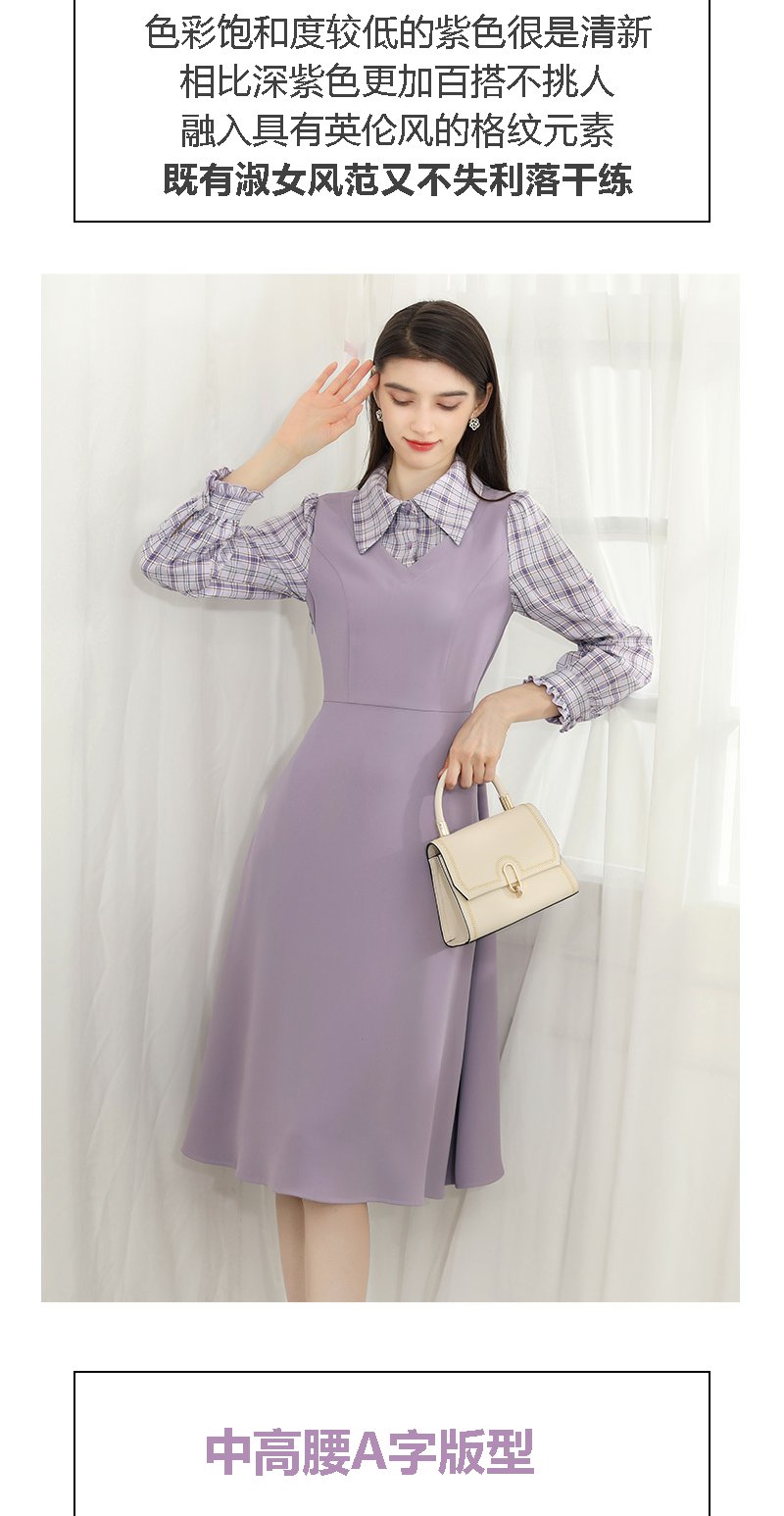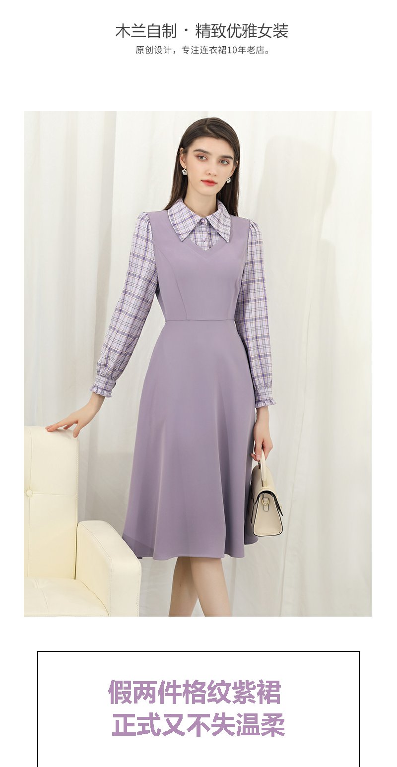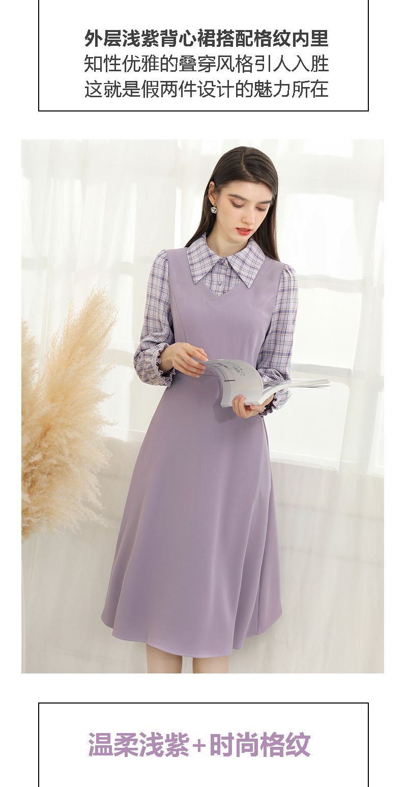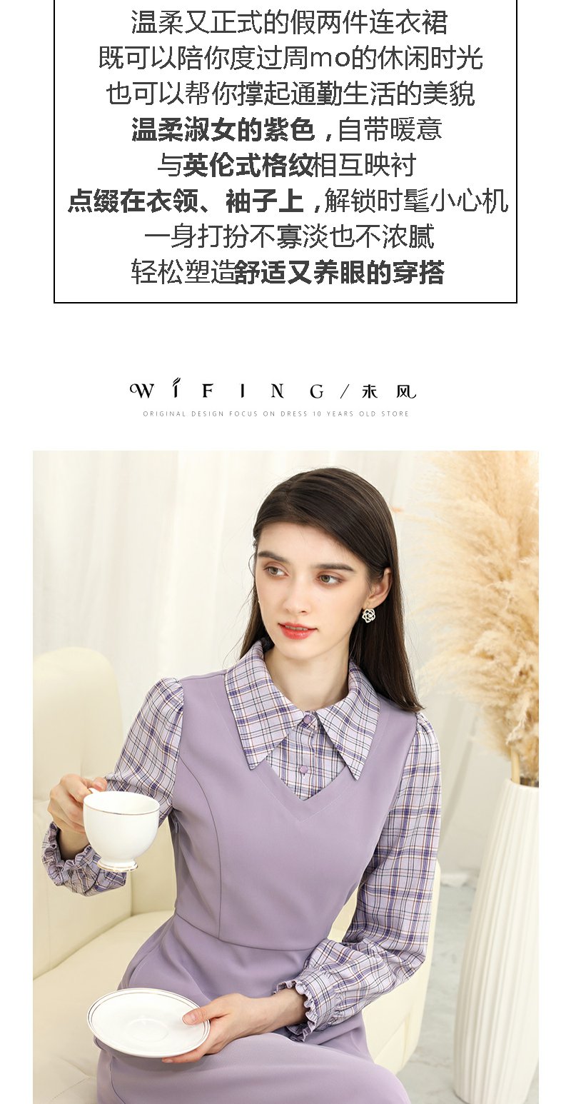 未风紫色格子连衣裙女春2024春季新款女装气质假两件显瘦长袖裙子