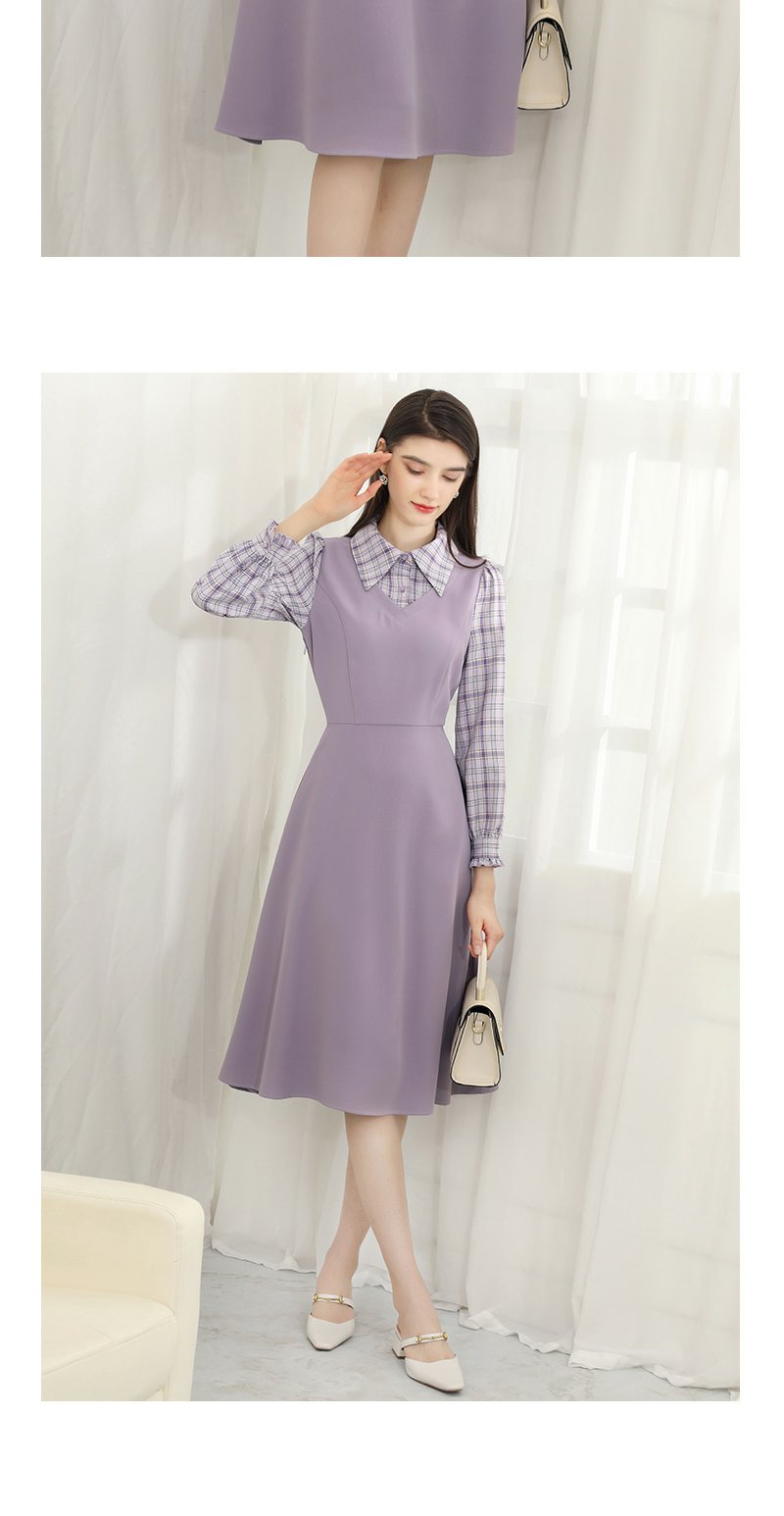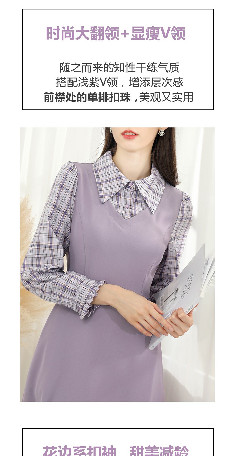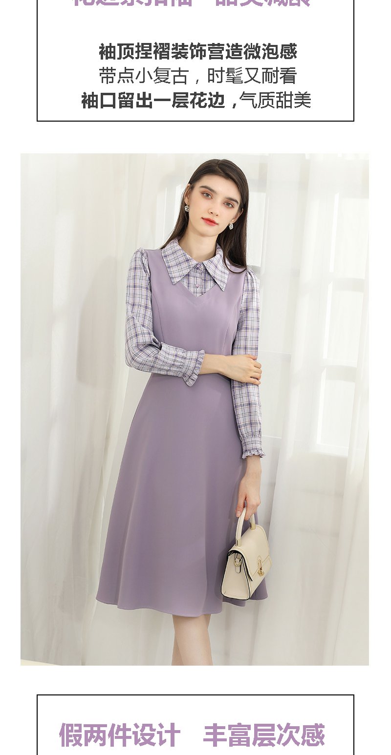 未风紫色格子连衣裙女春2024春季新款女装气质假两件显瘦长袖裙子