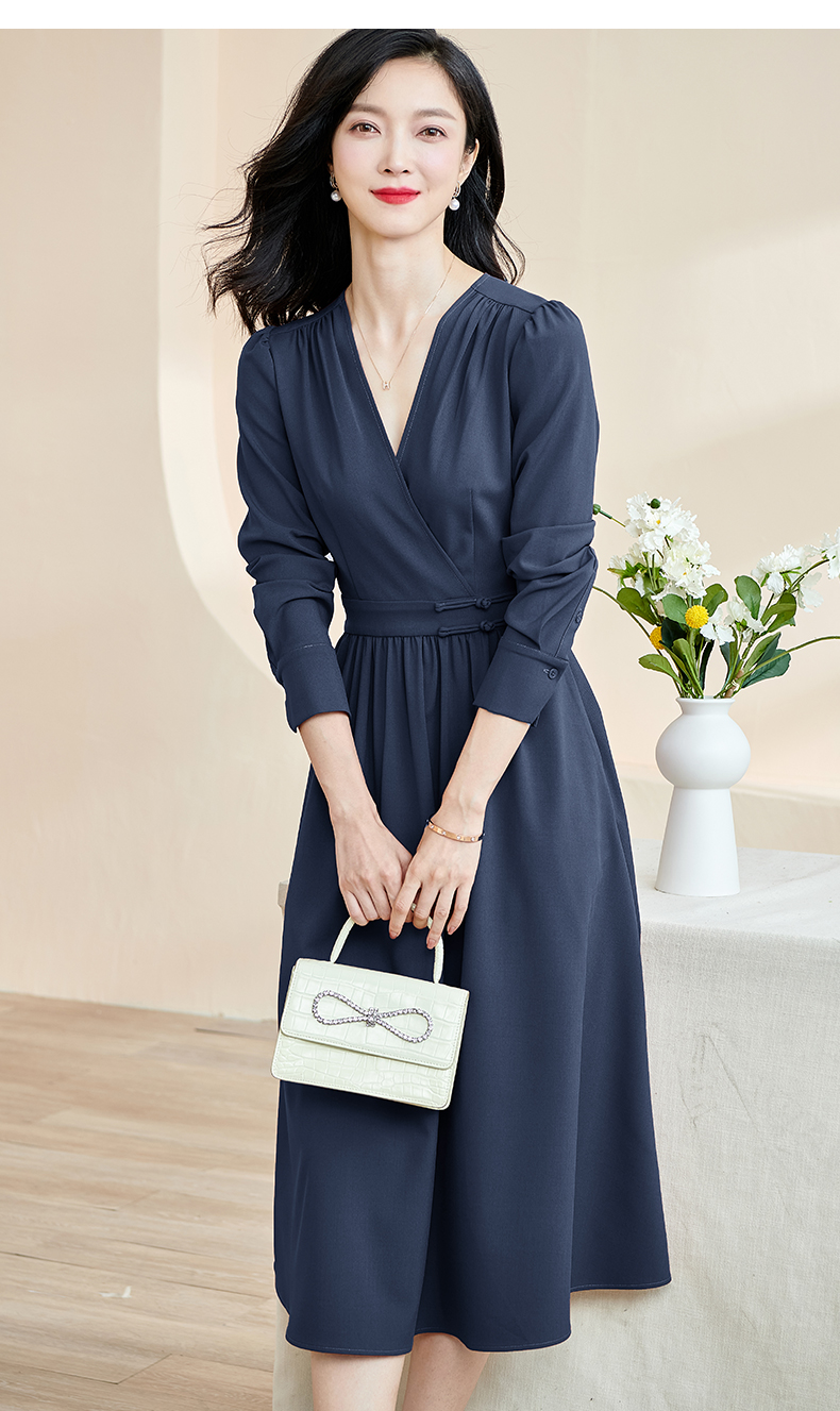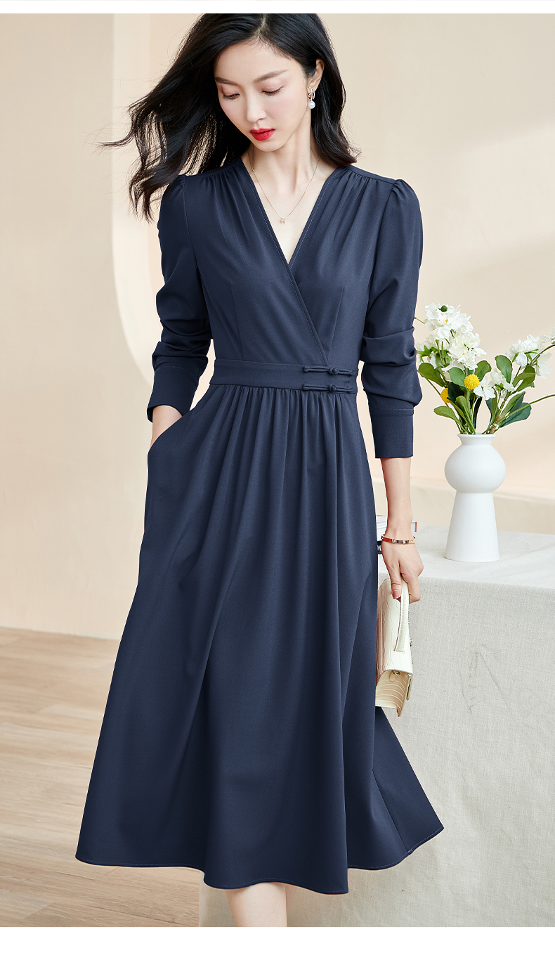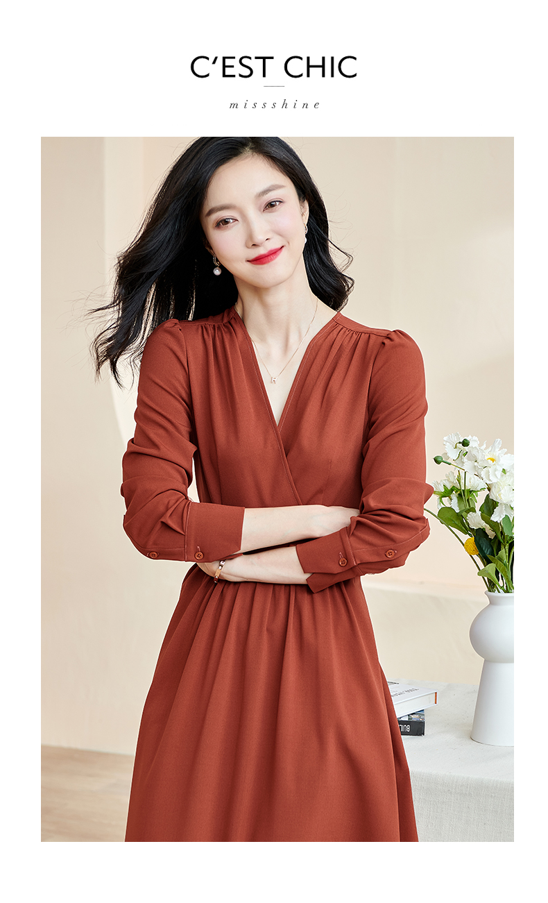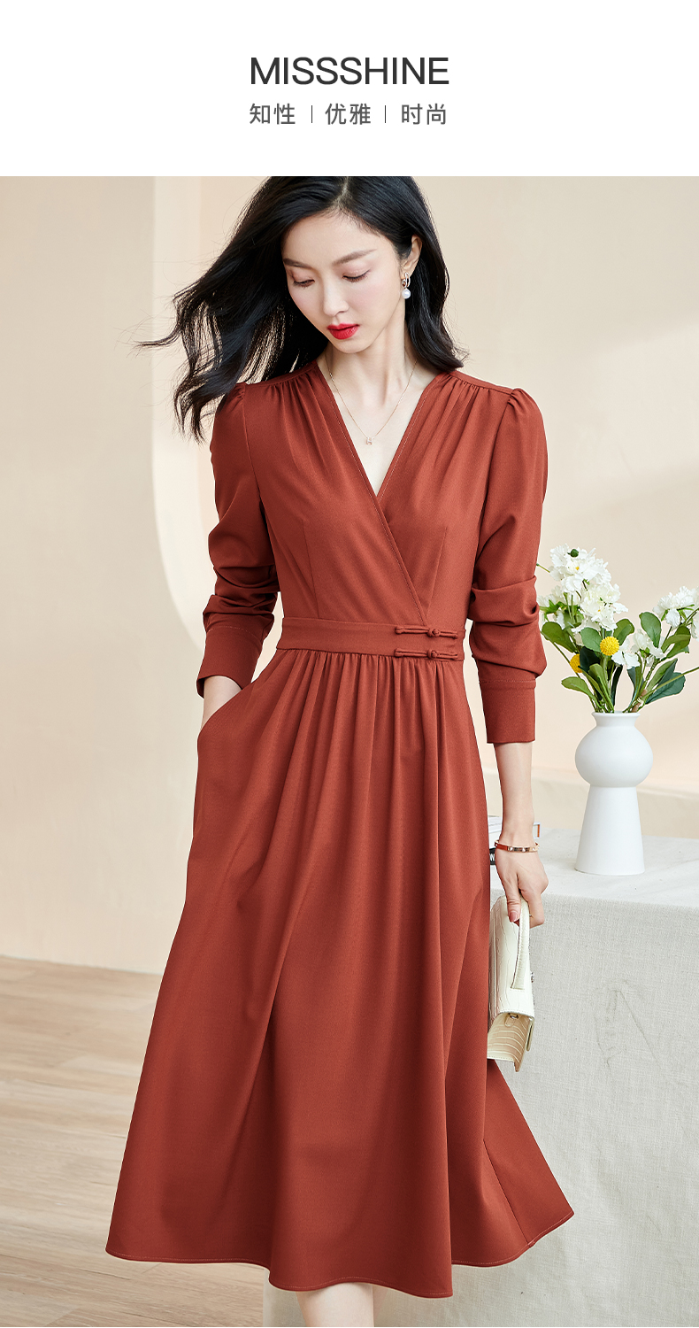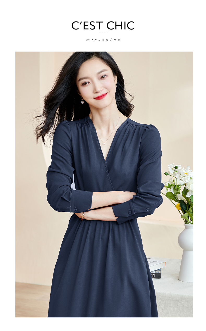 剩XL/S/M 米思阳2026春季新款简约气质通勤长袖连衣裙褶皱V领大摆裙子2507