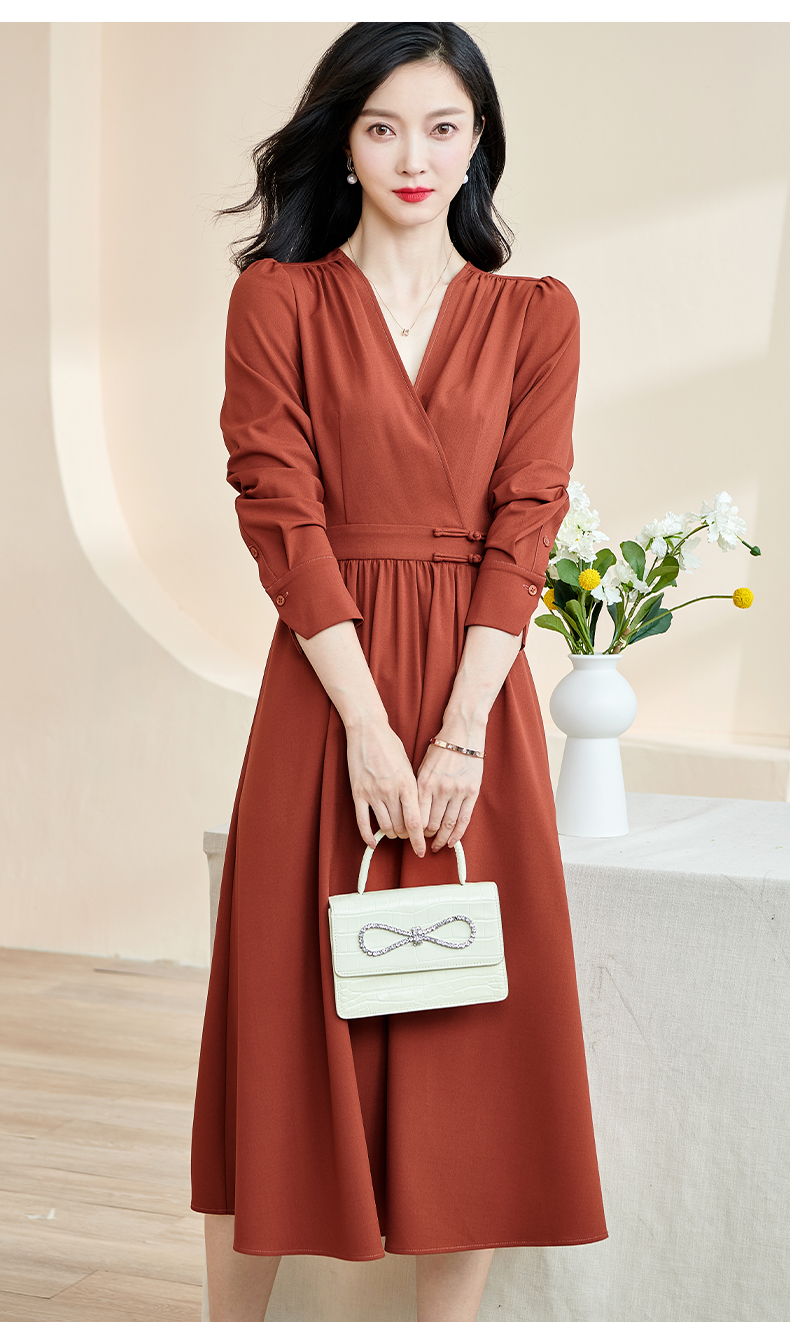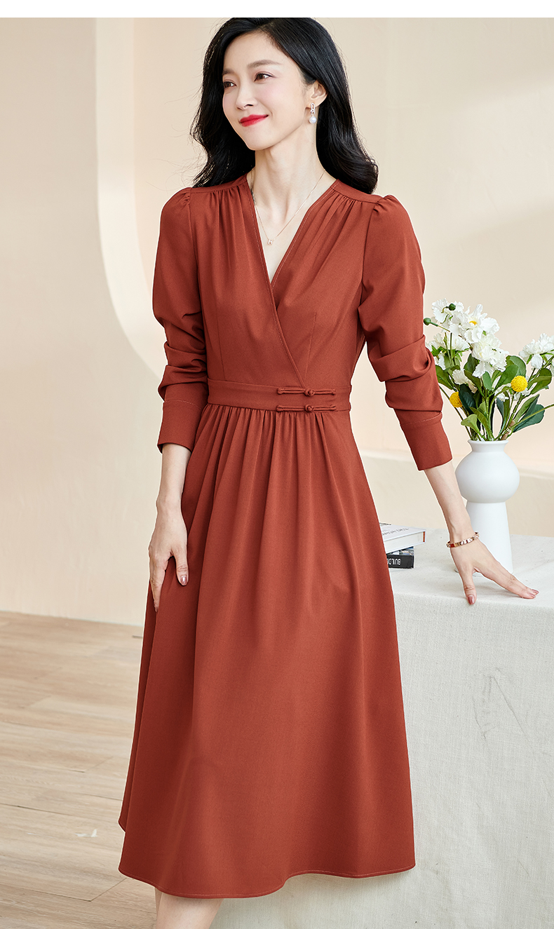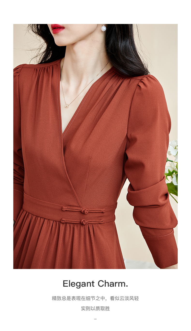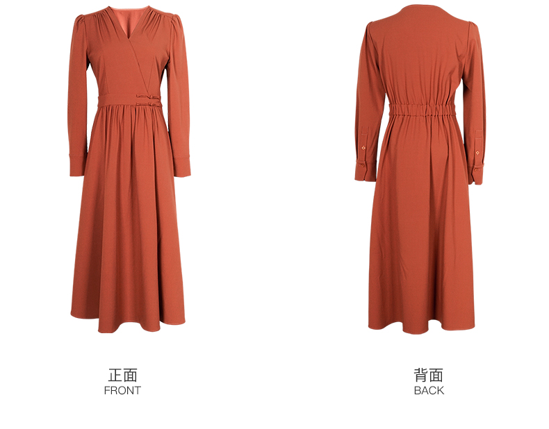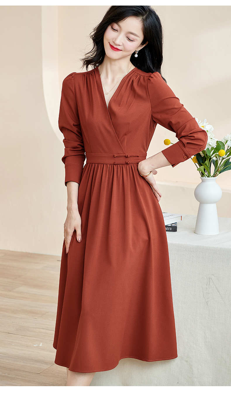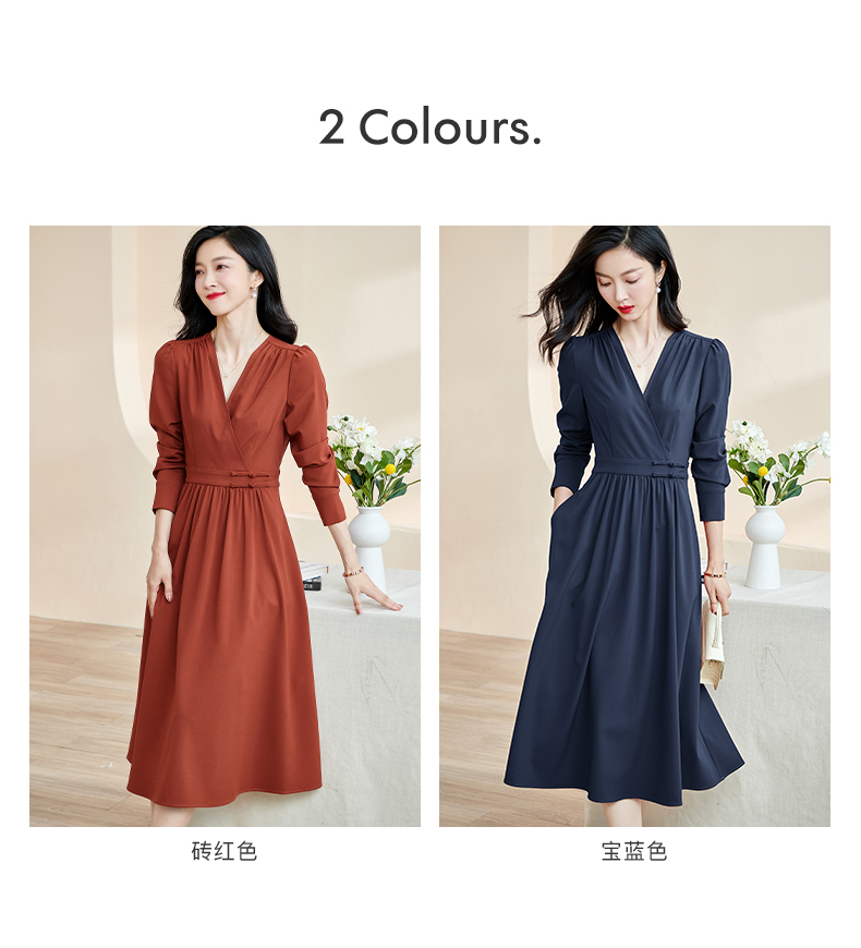 剩XL/S/M 米思阳2026春季新款简约气质通勤长袖连衣裙褶皱V领大摆裙子2507