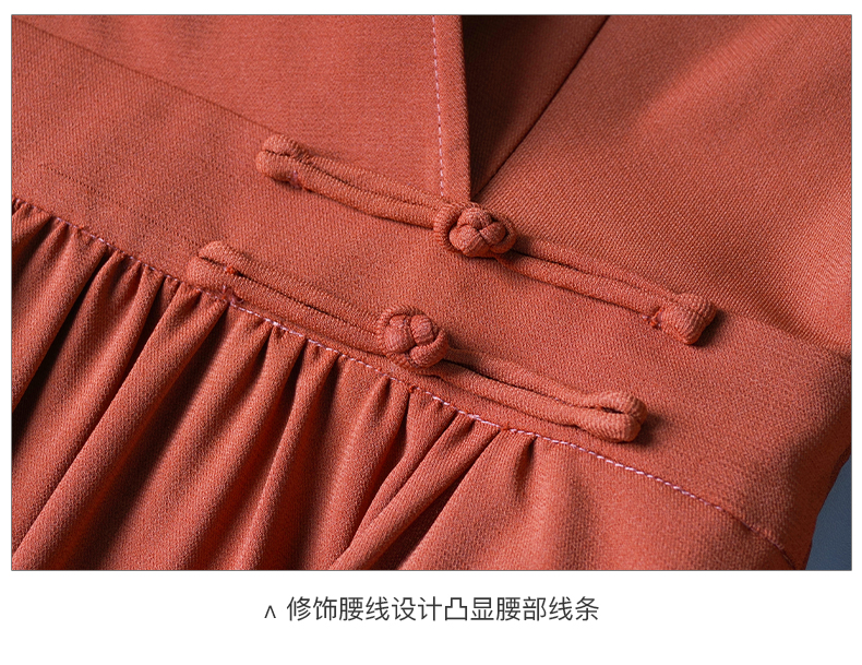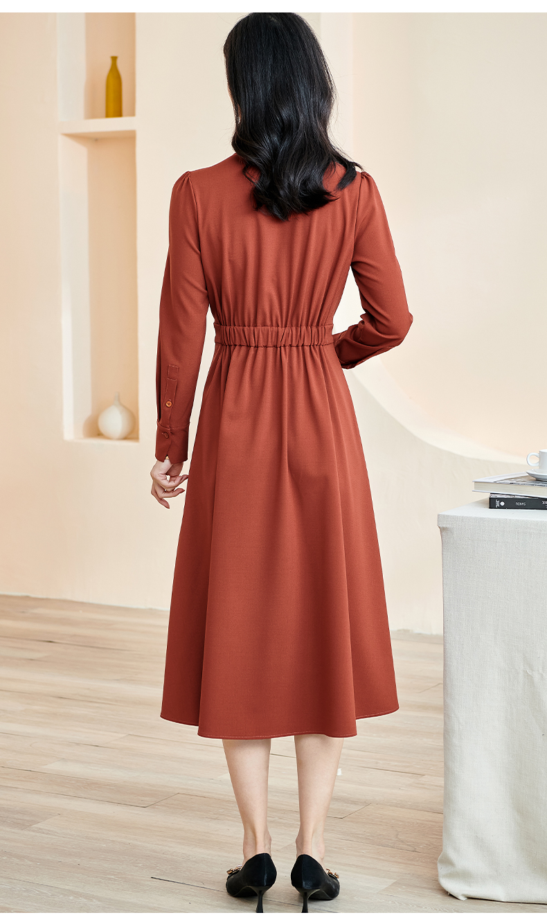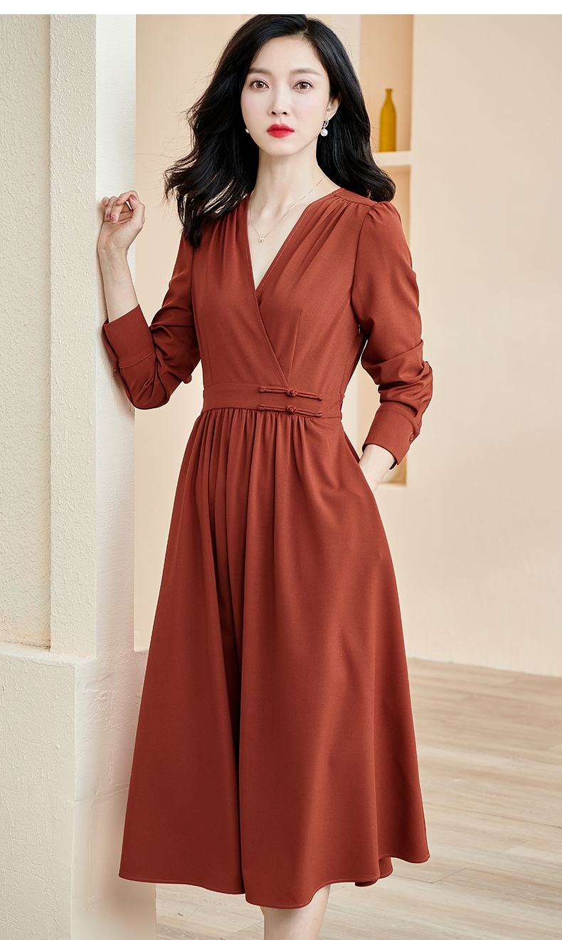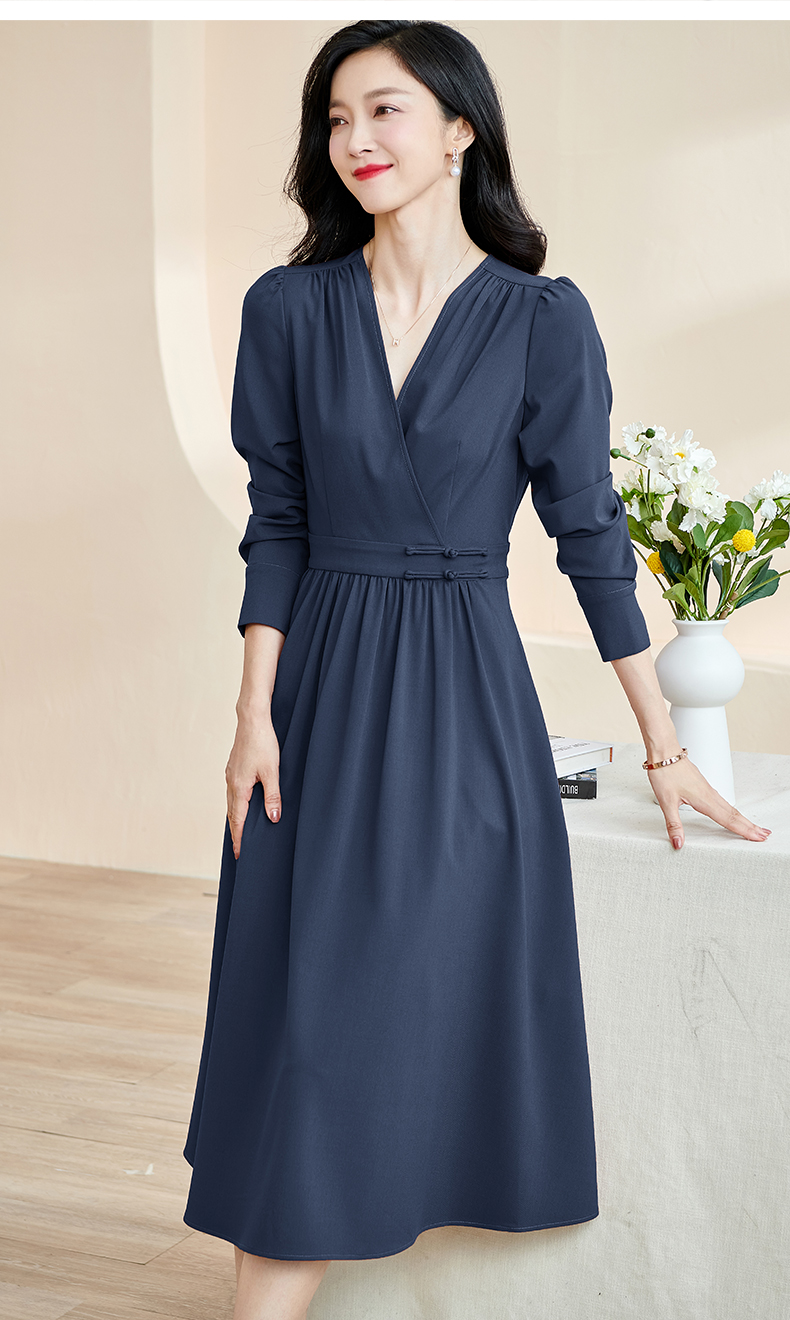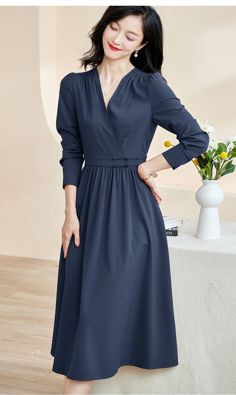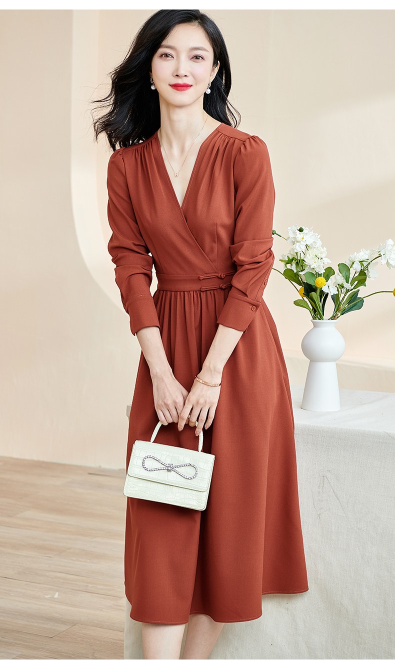 剩XL/S/M 米思阳2026春季新款简约气质通勤长袖连衣裙褶皱V领大摆裙子2507