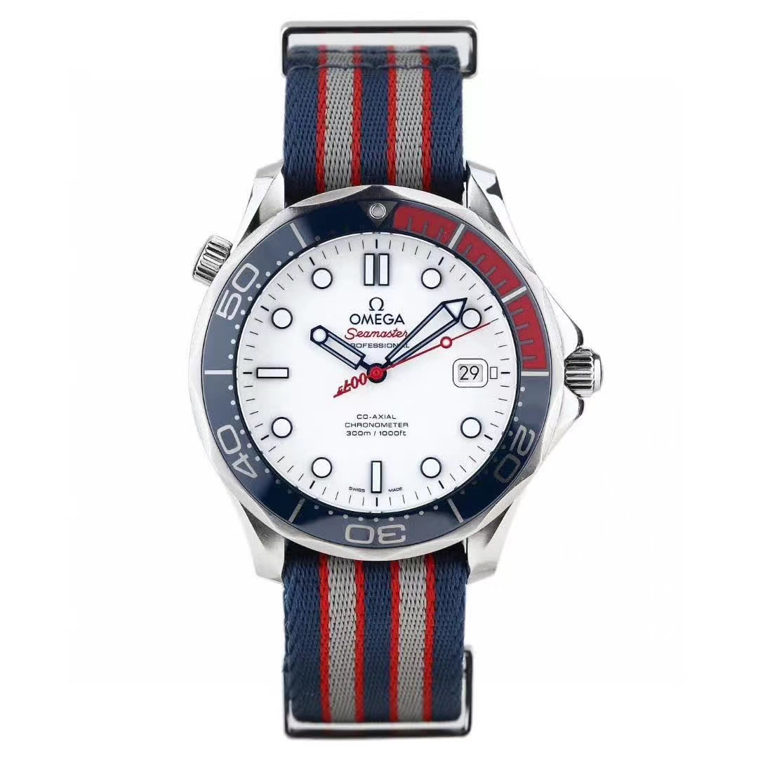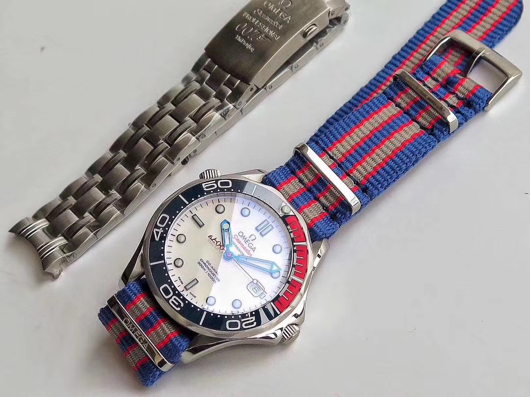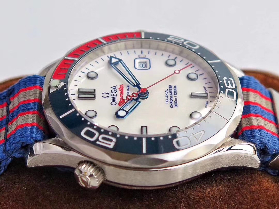 欧米加OMEGA海马212.32.41.20.04.001皇家海军指挥官限量版致敬海军中校詹姆斯邦德,1:1缎钢装饰表壳,904精刚表壳,市场一家正品一比一开模,白色陶瓷盘,光白字面,一家做到日历7这个数字是红色的,和原版一致,9015机芯改原版一致,认准正品7红色数字,折叠扣精雕007字印,原版一致,表圈部分使用和正品一致的颜色陶瓷圈口,搭载316钢制九珠表带。原版机心,原版坨片,完美还原限量版!!!