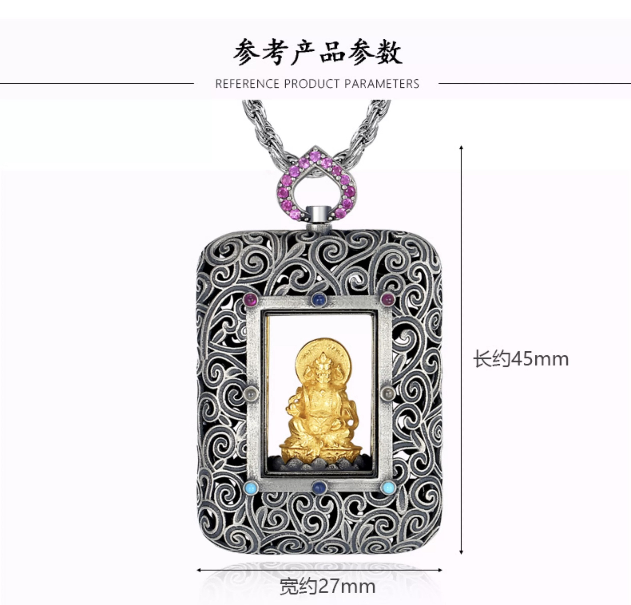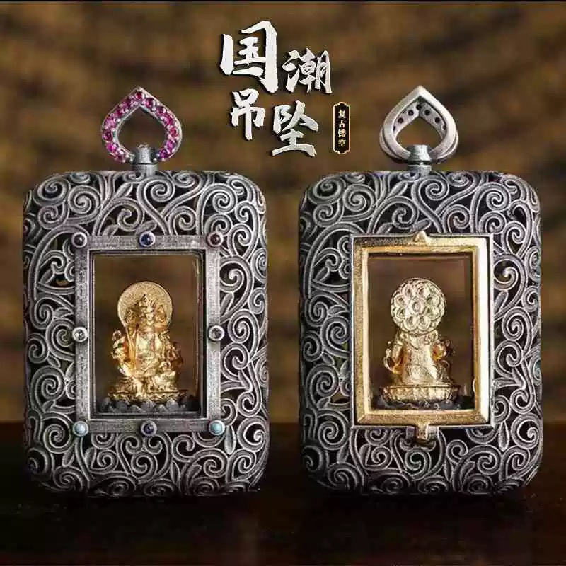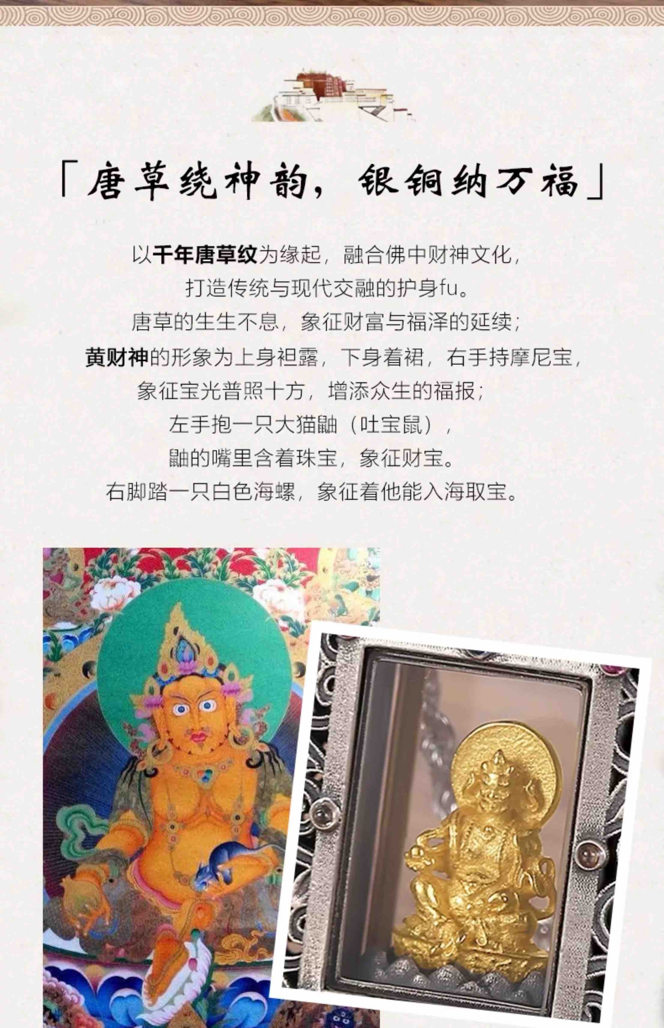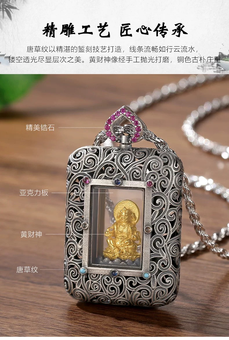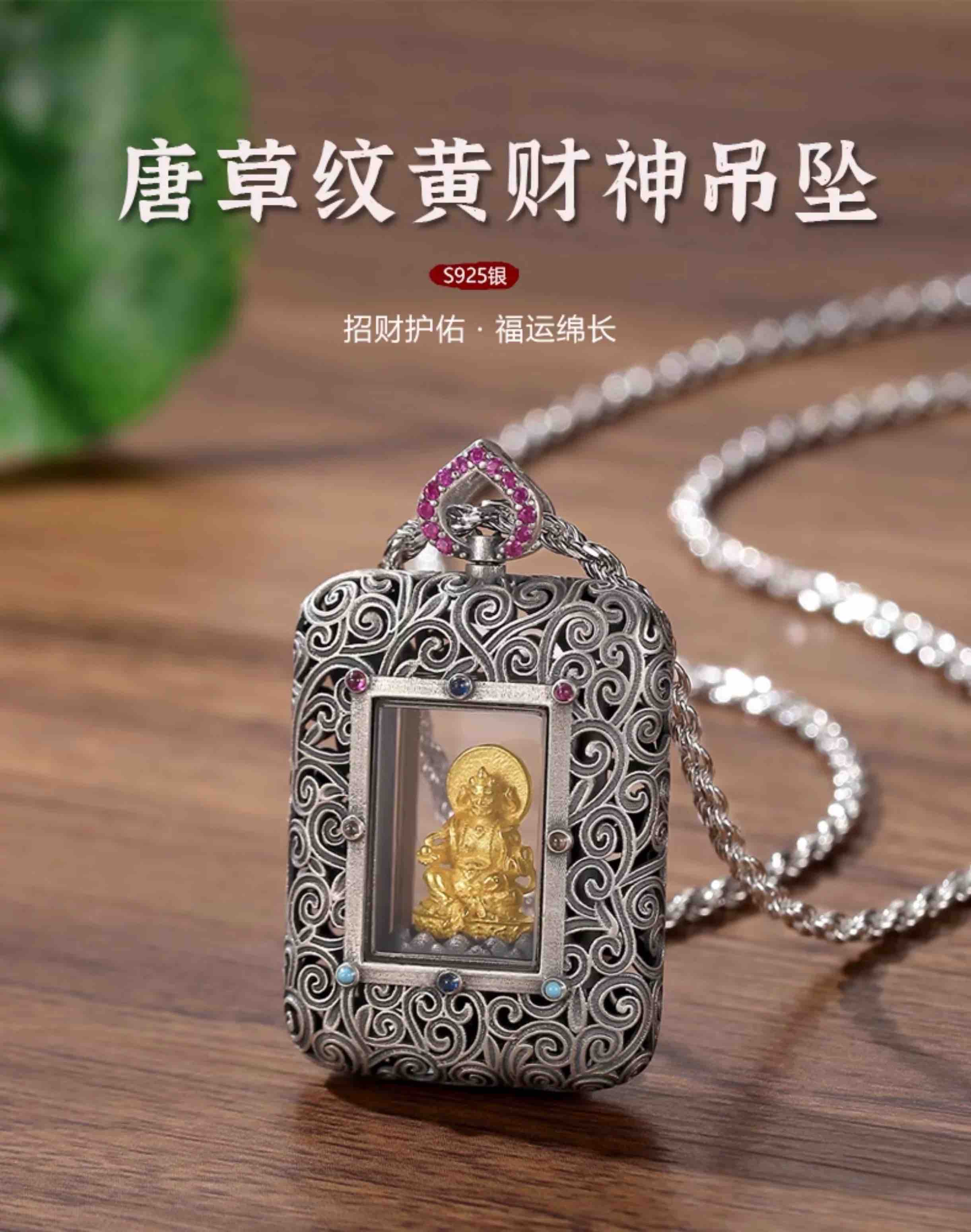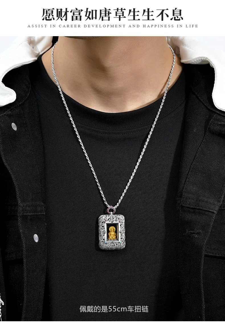 S925银唐草纹黄财神吊坠佛牌项链男国潮款复古男女挂件毛衣链