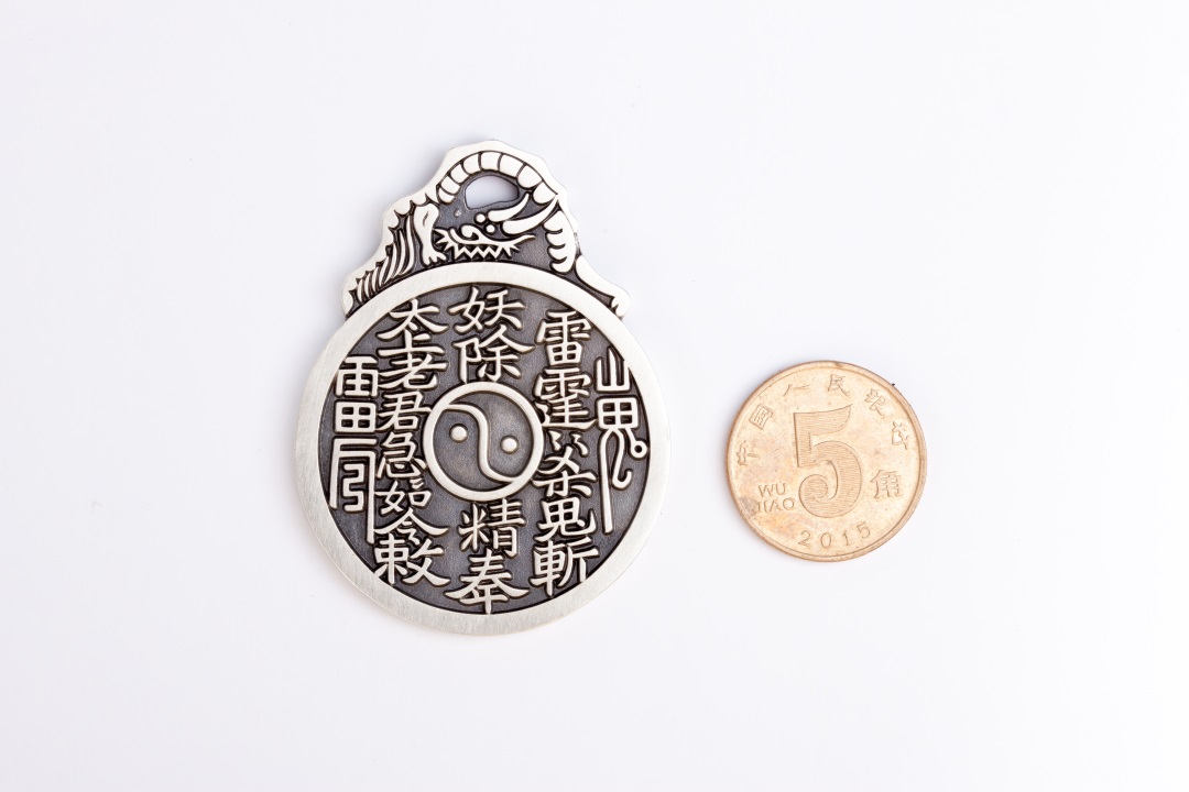 尺寸:钱币主体直径约38毫米(不含挂扣),钱币整体高约50毫米,厚约2.7毫米,挂扣孔径约2.4毫米~4毫米(呈不规则椭圆形),重约29克(手工作品有少许误差)。