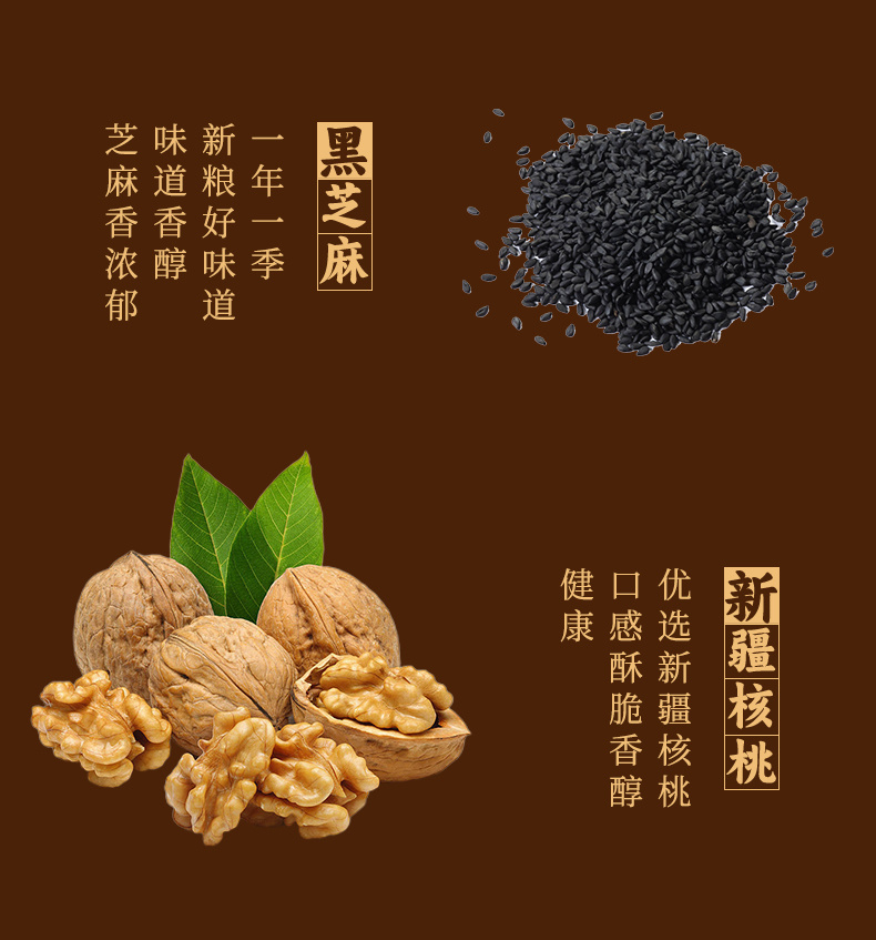 ✅高核桃含量,真材实料无添加 精选新疆整颗核桃仁、优质黑芝麻、红枣 🔺核桃颗粒大、桃仁饱满、油性足 颜色呈现琥铂色,食之味清香,略带甘甜 🔺芝麻颗粒饱满,无瘪子 色泽乌黑含有丰富的花青素 经清洗、烘焙、碾磨后,香气扑鼻与众不同 🔺红枣肉质肥厚,味香甜 纯天然材料,配料干净,无添加 家里大人小孩都可以吃!