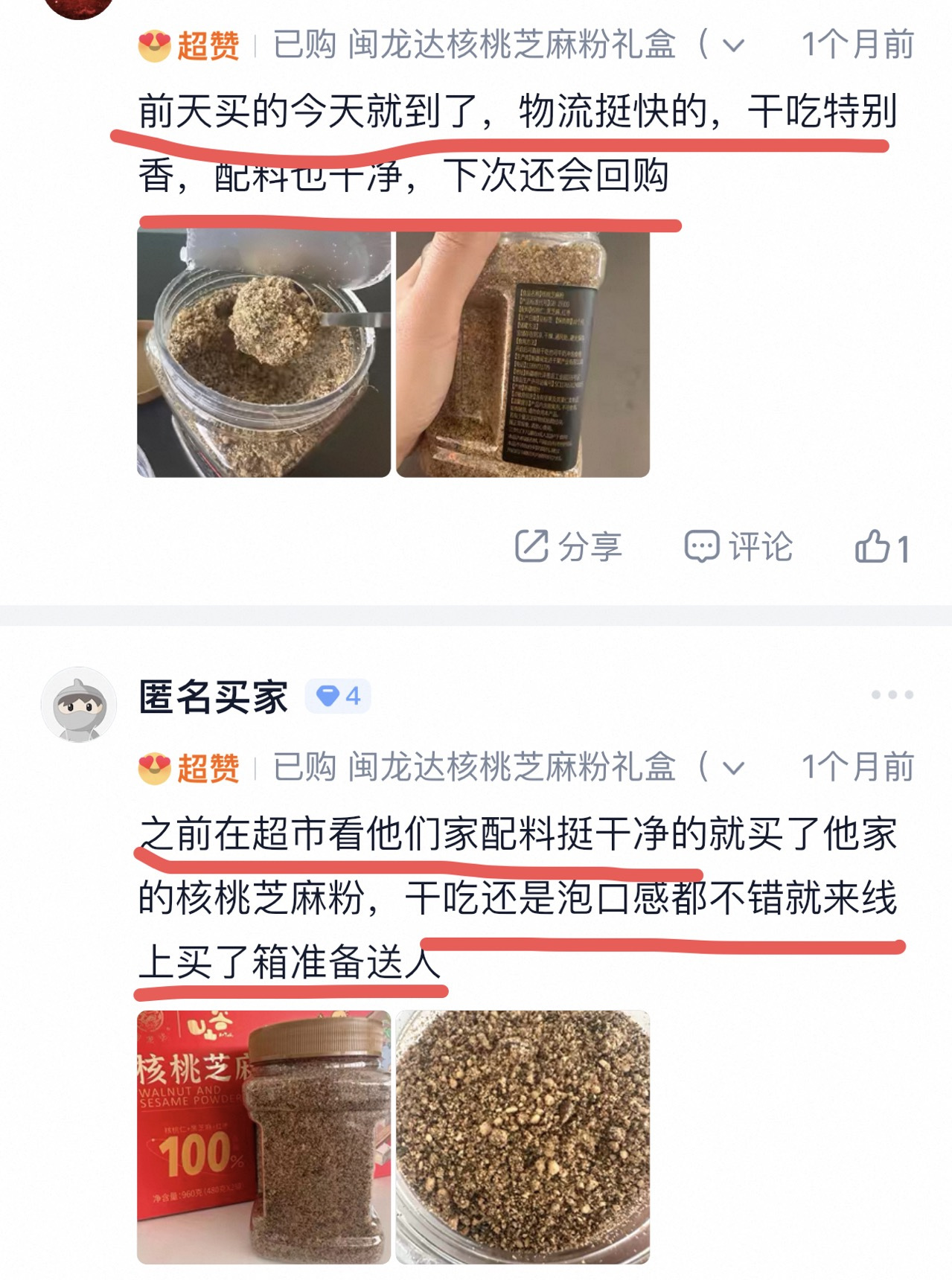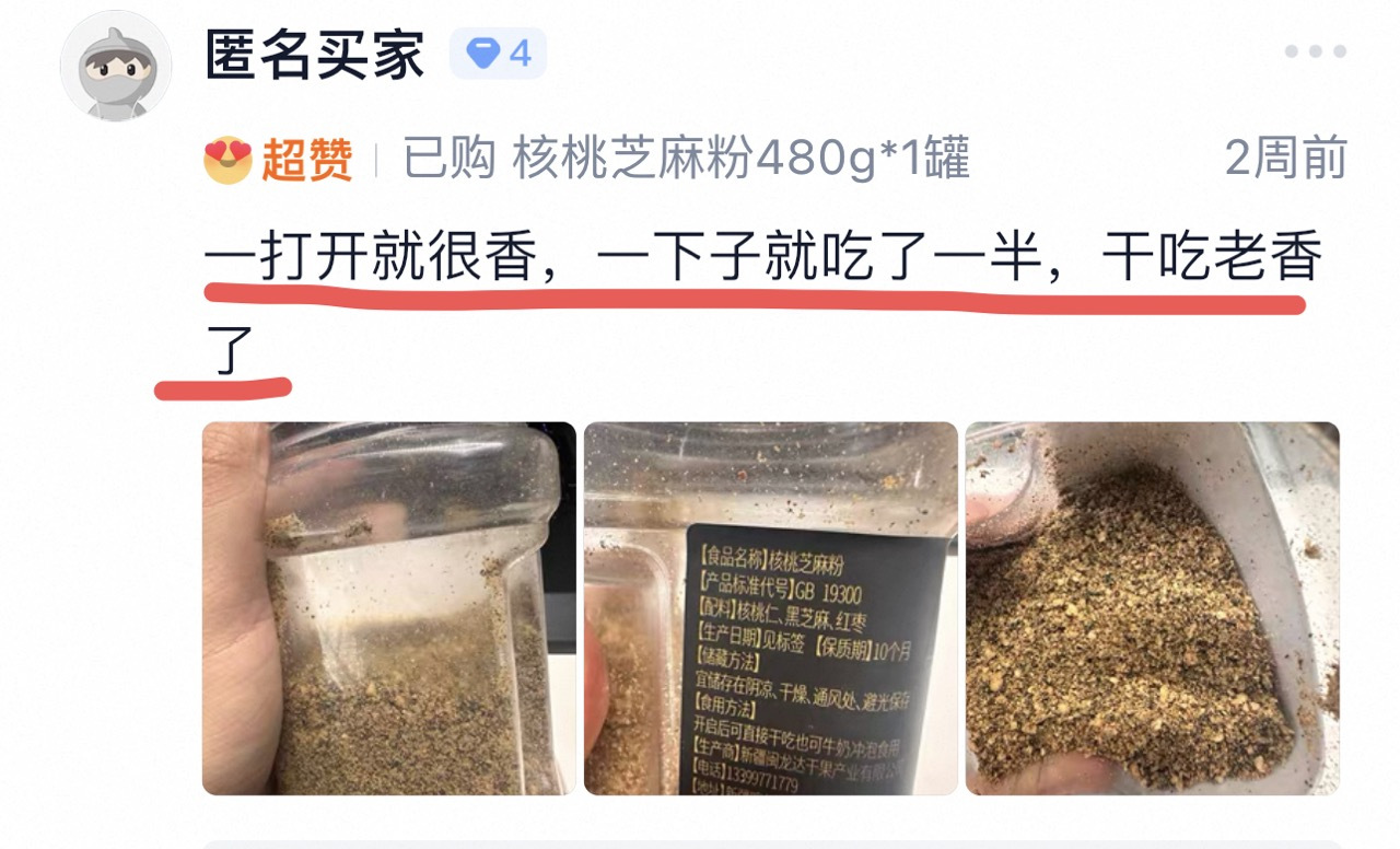 ✅真正的【核桃】芝麻粉 配料表的先后顺序代表含量多少 大家留心的话会发现 平时买的大多是芝麻占了大头❌ 而闽龙达是实实在在的高核桃含量 核桃、黑芝麻、红枣的科学配比 既保留了核桃的益智健脑、补气养血功效 黑芝麻的滋补肝肾、乌发养颜作用 又发挥了红枣增强免疫力、健脾养胃的作用 三者相结合,实现了营养均衡互补