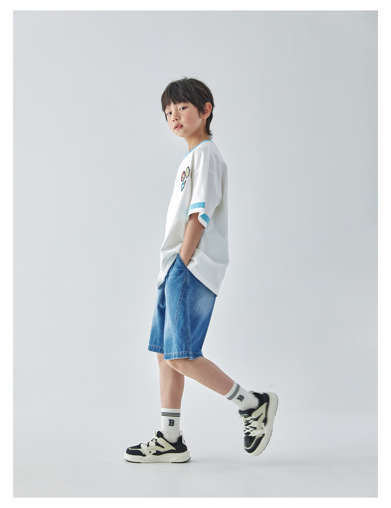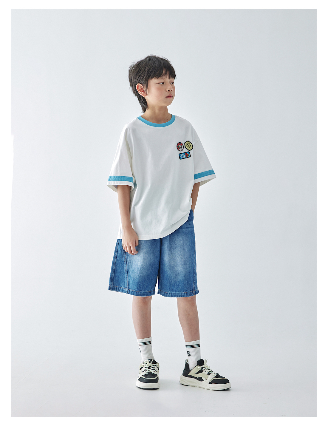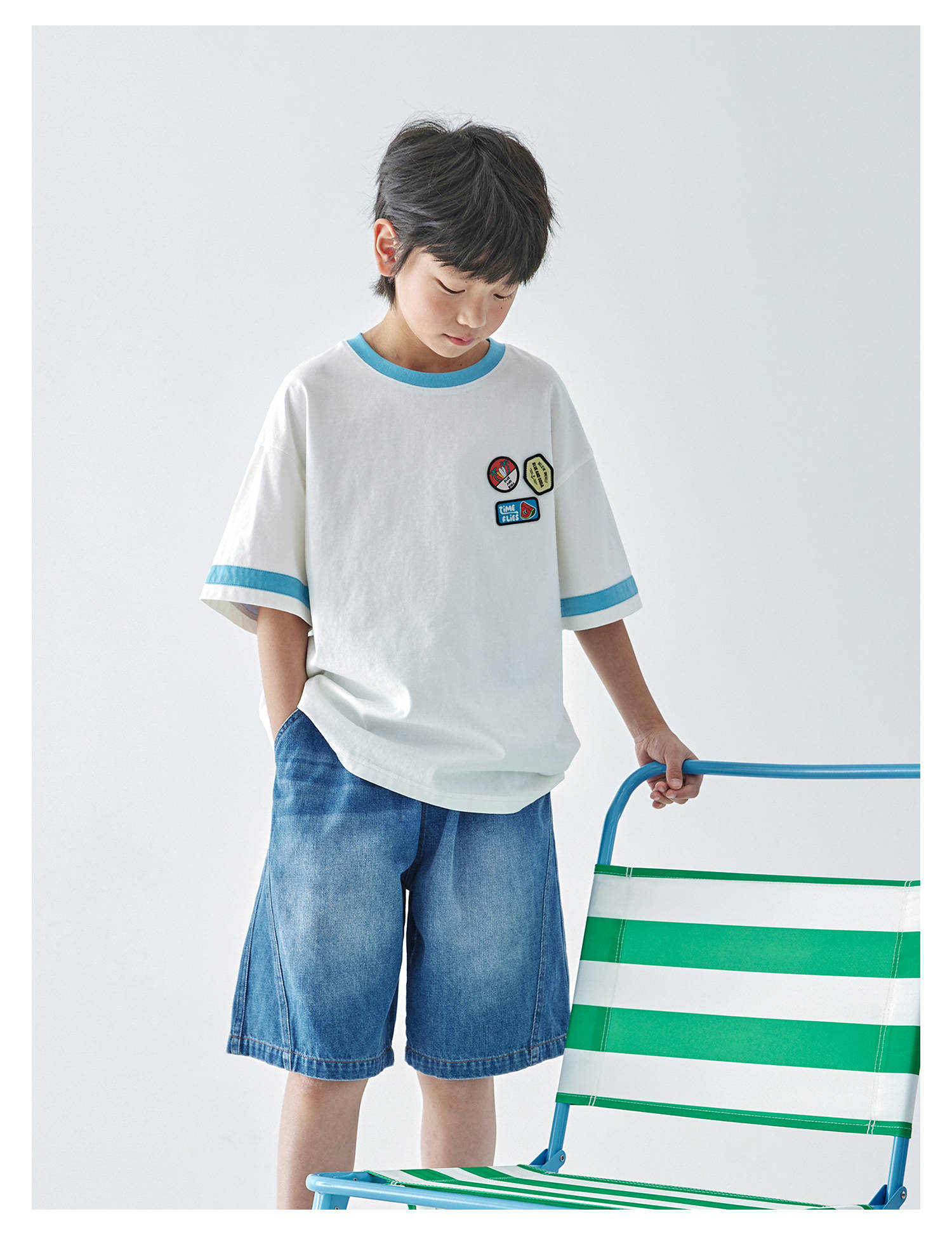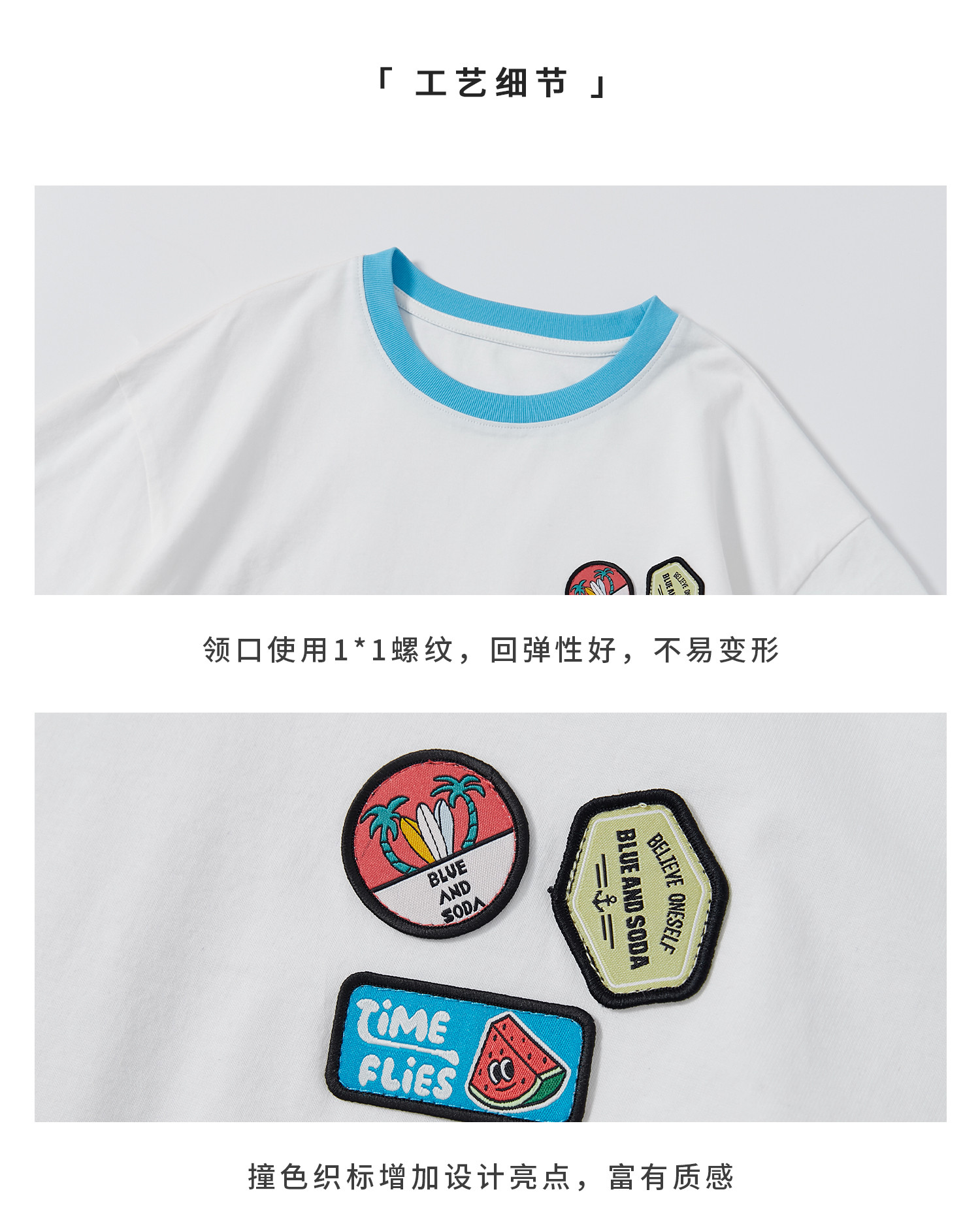 【代发】男童撞色短袖T恤 蓝汽水夏款全棉趣味织标亲子款上衣白拼蓝